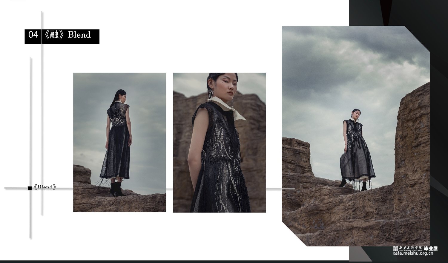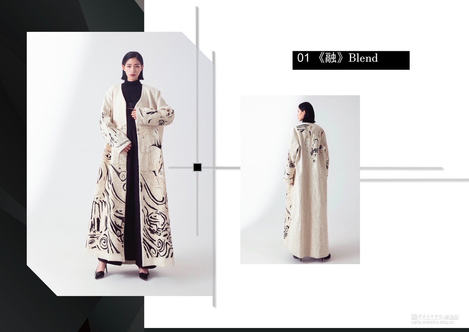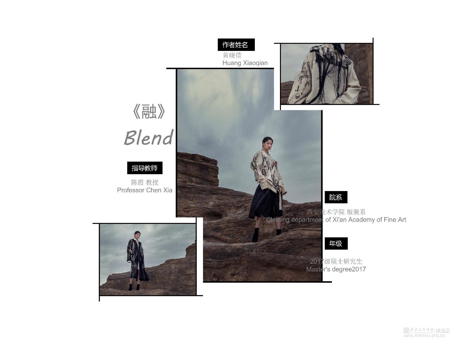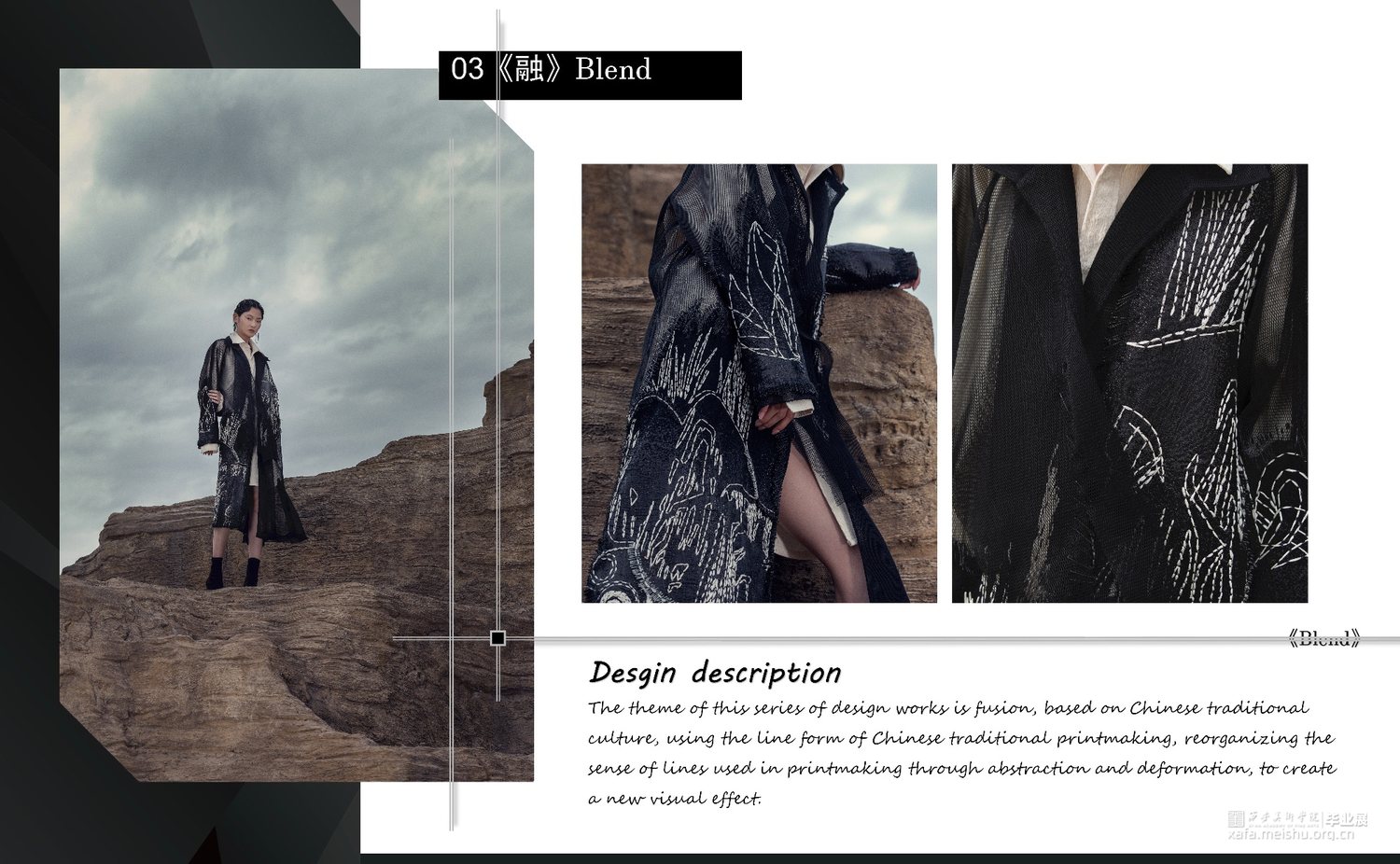 此次毕业设计作品的主题为“融”,是以中国传统文化为基奠进行设计。中国传统文化是现代设计的根源,服装设计的目的是力求将中国传统的文化元素与西方服饰文化相融合。本系列服装灵感来源于中国传统文化元素诗歌及版画,以唐代诗人的五言古诗《青溪》为灵感,运用中国传统版画的线条形式,将版画中运用的线条感通过抽象、变形,再进行重组,形成一种全新的视觉效果。
