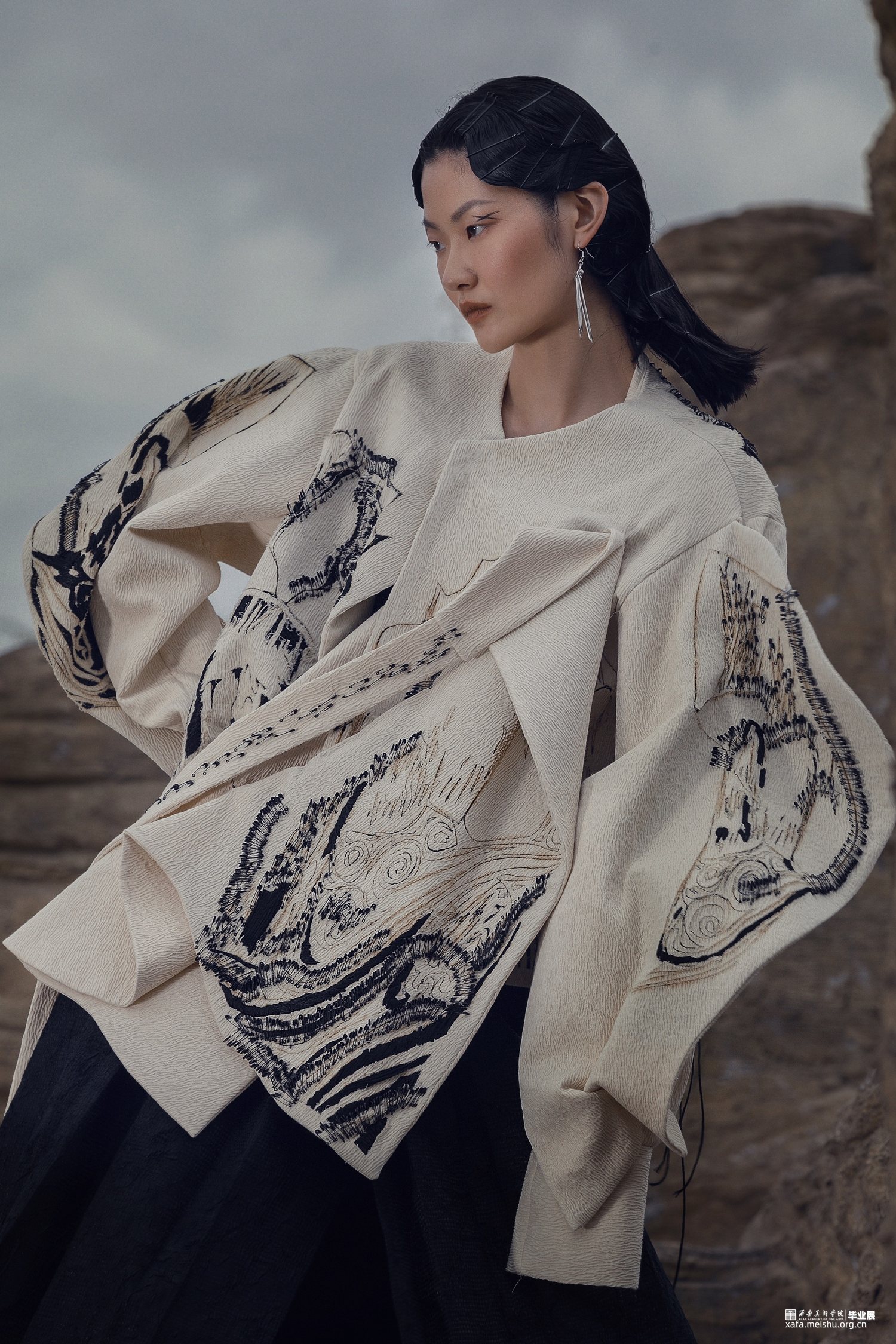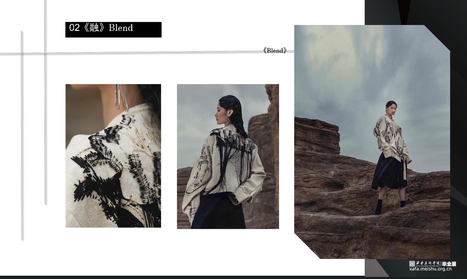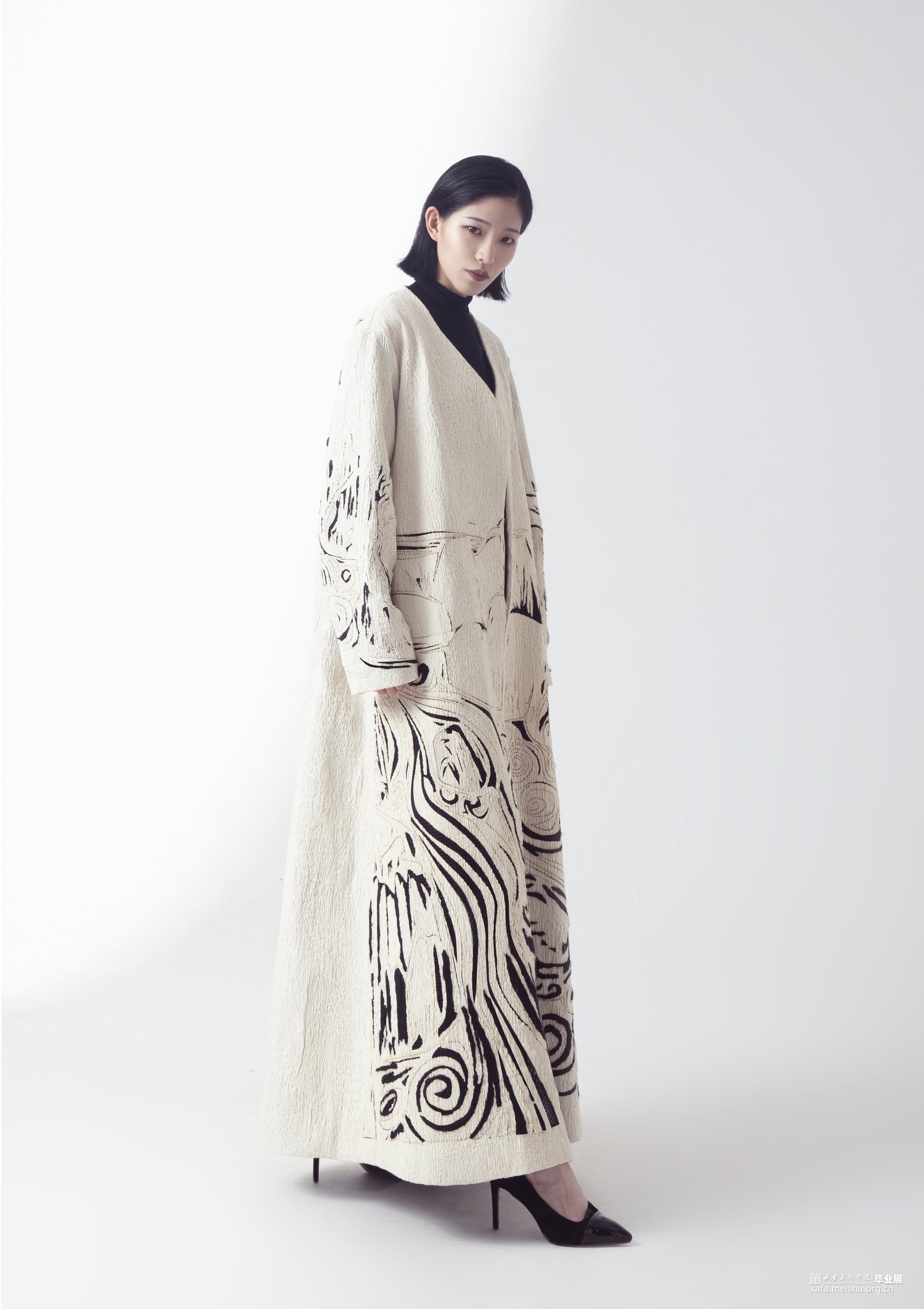此次毕业设计作品的主题为“融”,是以中国传统文化为基奠进行设计。中国传统文化是现代设计的根源,服装设计的目的是力求将中国传统的文化元素与西方服饰文化相融合。本系列服装灵感来源于中国传统文化元素诗歌及版画,以唐代诗人的五言古诗《青溪》为灵感,运用中国传统版画的线条形式,将版画中运用的线条感通过抽象、变形,再进行重组,形成一种全新的视觉效果。