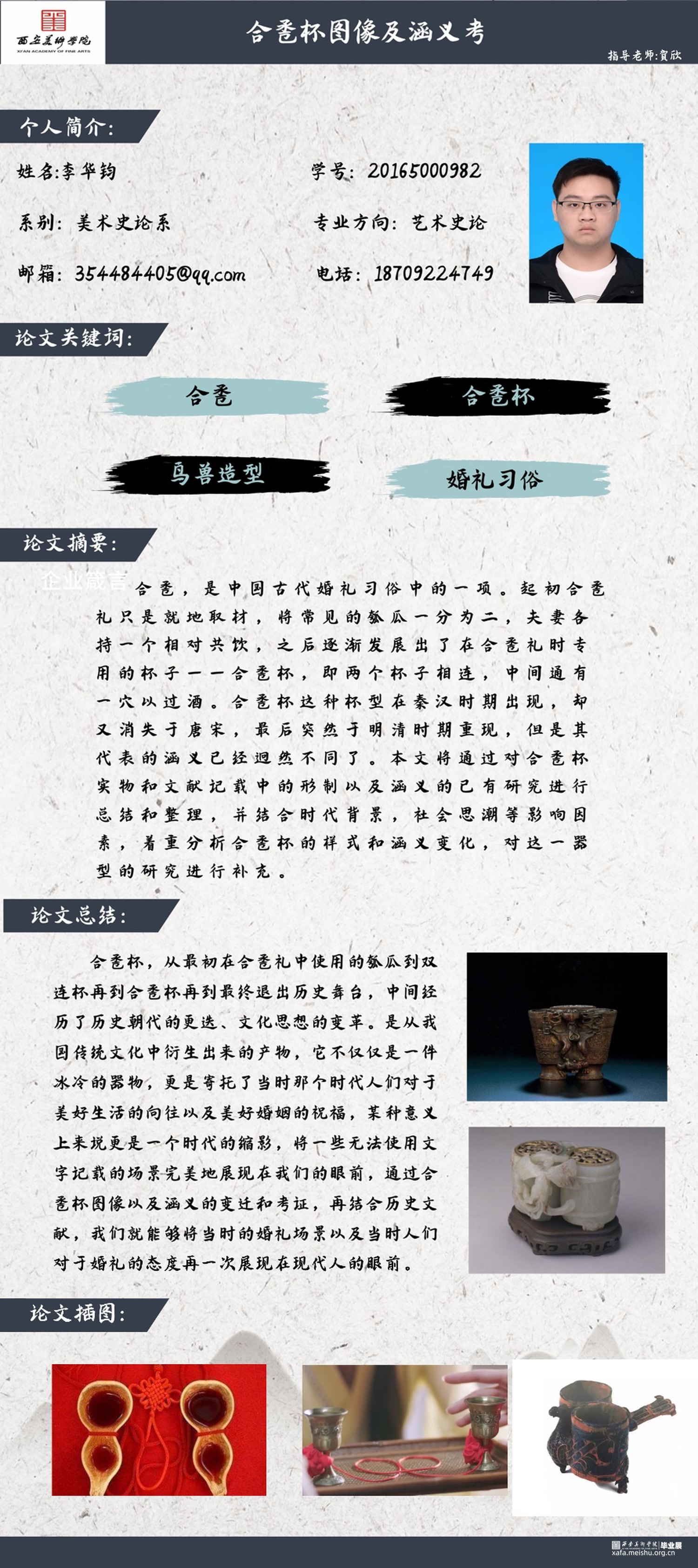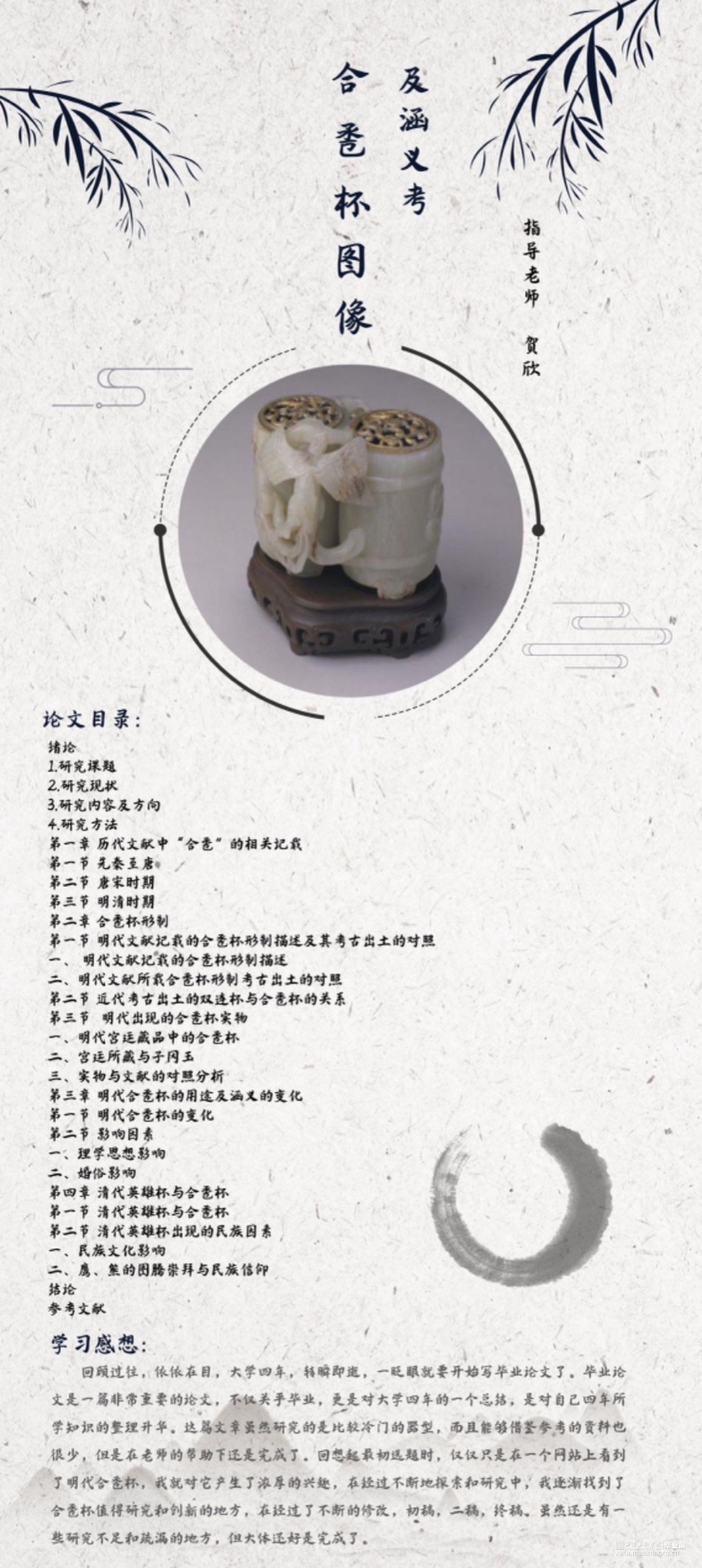 合卺,是中国古代婚礼习俗中的一项。起初合卺礼只是就地取材,将常见的瓠瓜一分为二,夫妻各持一个相对共饮,之后逐渐发展出了在合卺礼时专用的杯子——合卺杯,即两个杯子相连,中间通有一穴以过酒。合卺杯这种杯型在秦汉时期出现,却又消失于唐宋,最后突然于明清时期重现,但是其代表的涵义已经迥然不同了。本文将通过对合卺杯实物和文献记载中的形制以及涵义的已有研究进行总结和整理,并结合时代背景,社会思潮等影响因素,着重分析合卺杯的样式和涵义变化,对这一器型的研究进行补充。