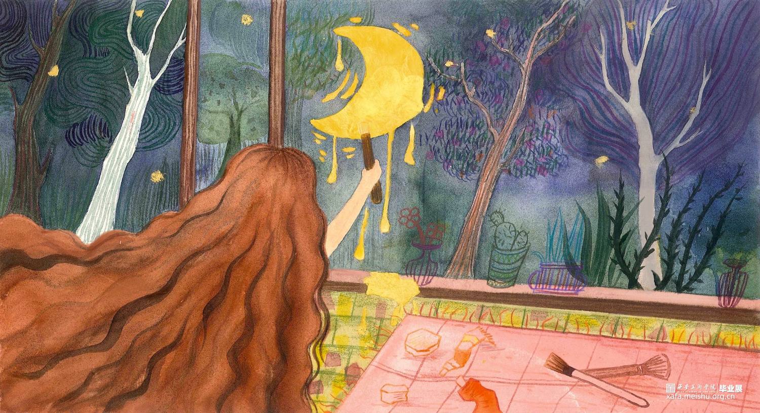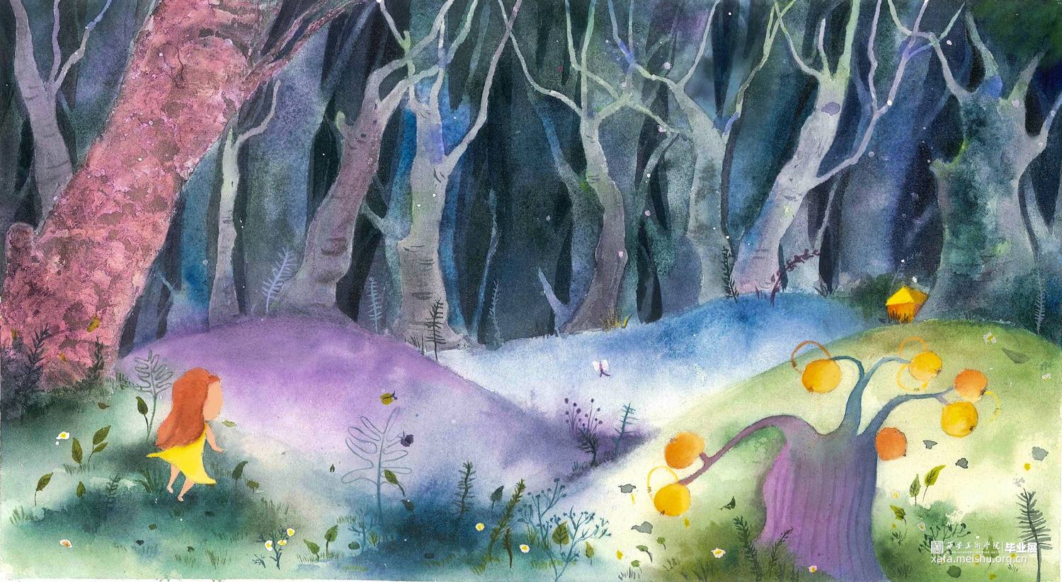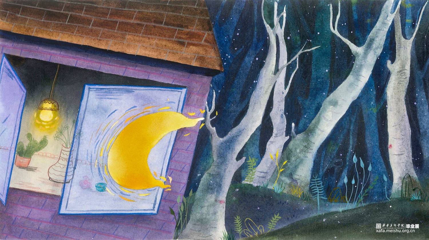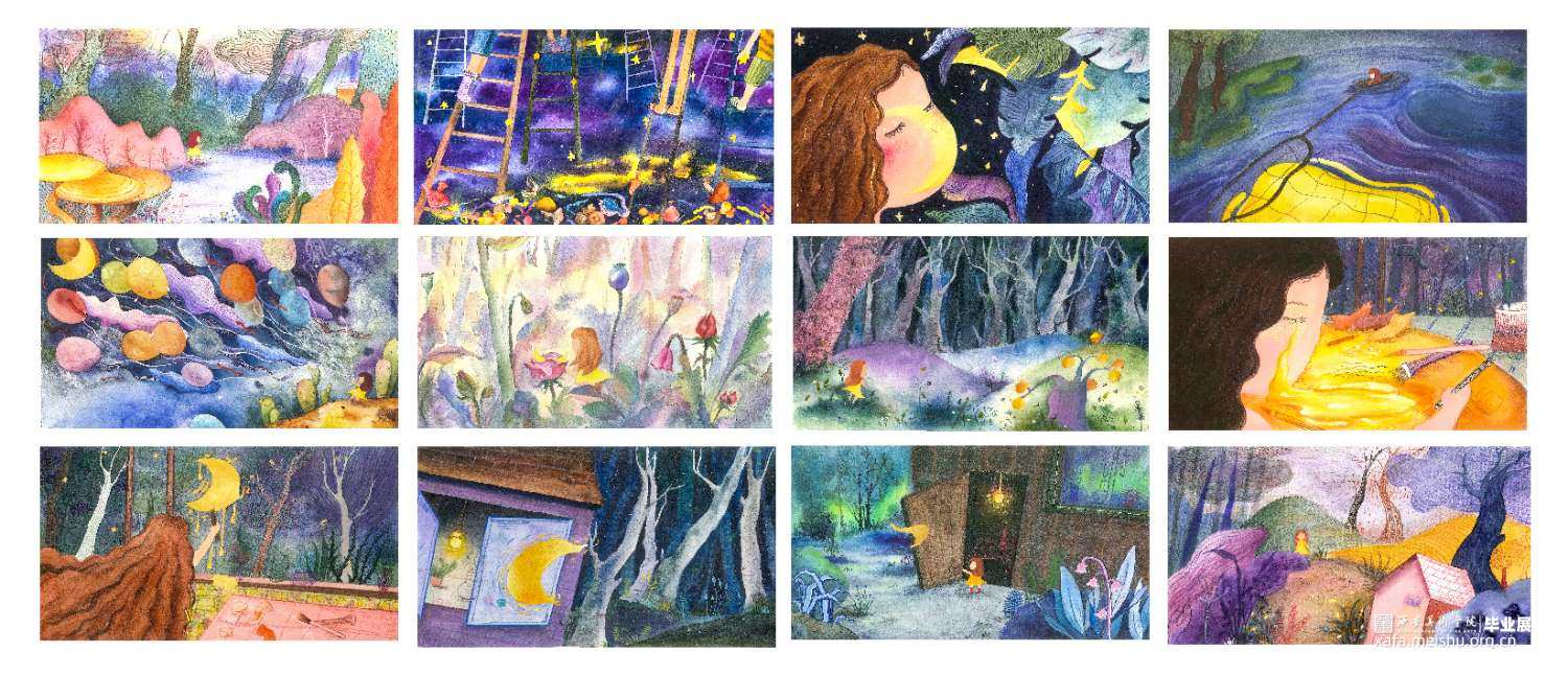 这组作品是以一个童话故事——《摘月亮的蜜朵》为背景创作的12张偏装饰性的插画水彩。