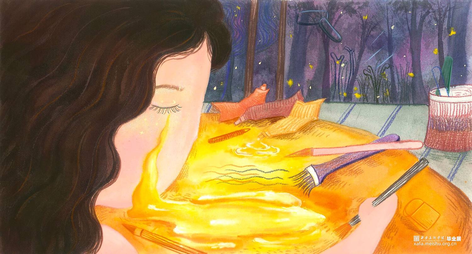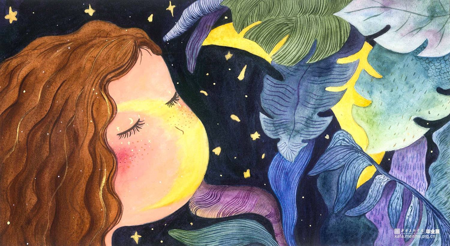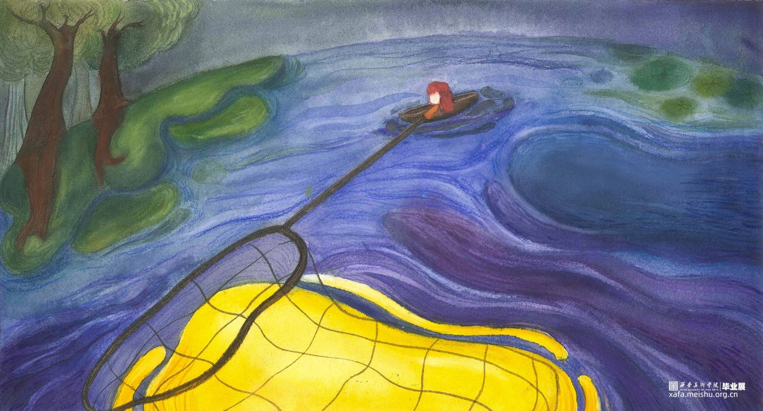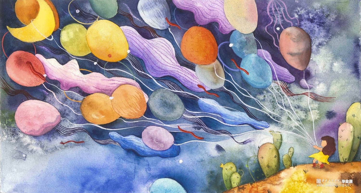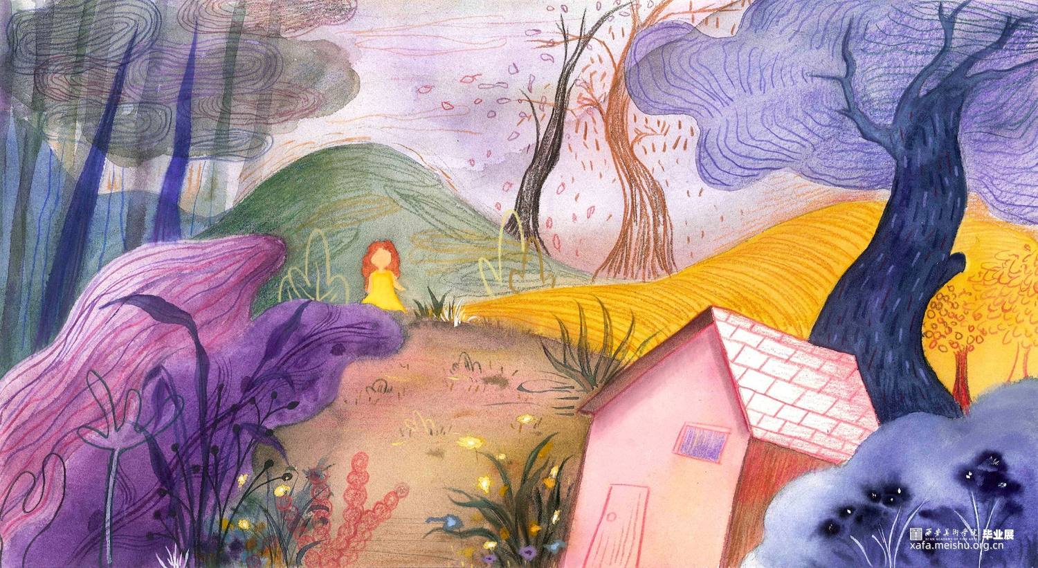 这组作品是以一个童话故事——《摘月亮的蜜朵》为背景创作的12张偏装饰性的插画水彩。
