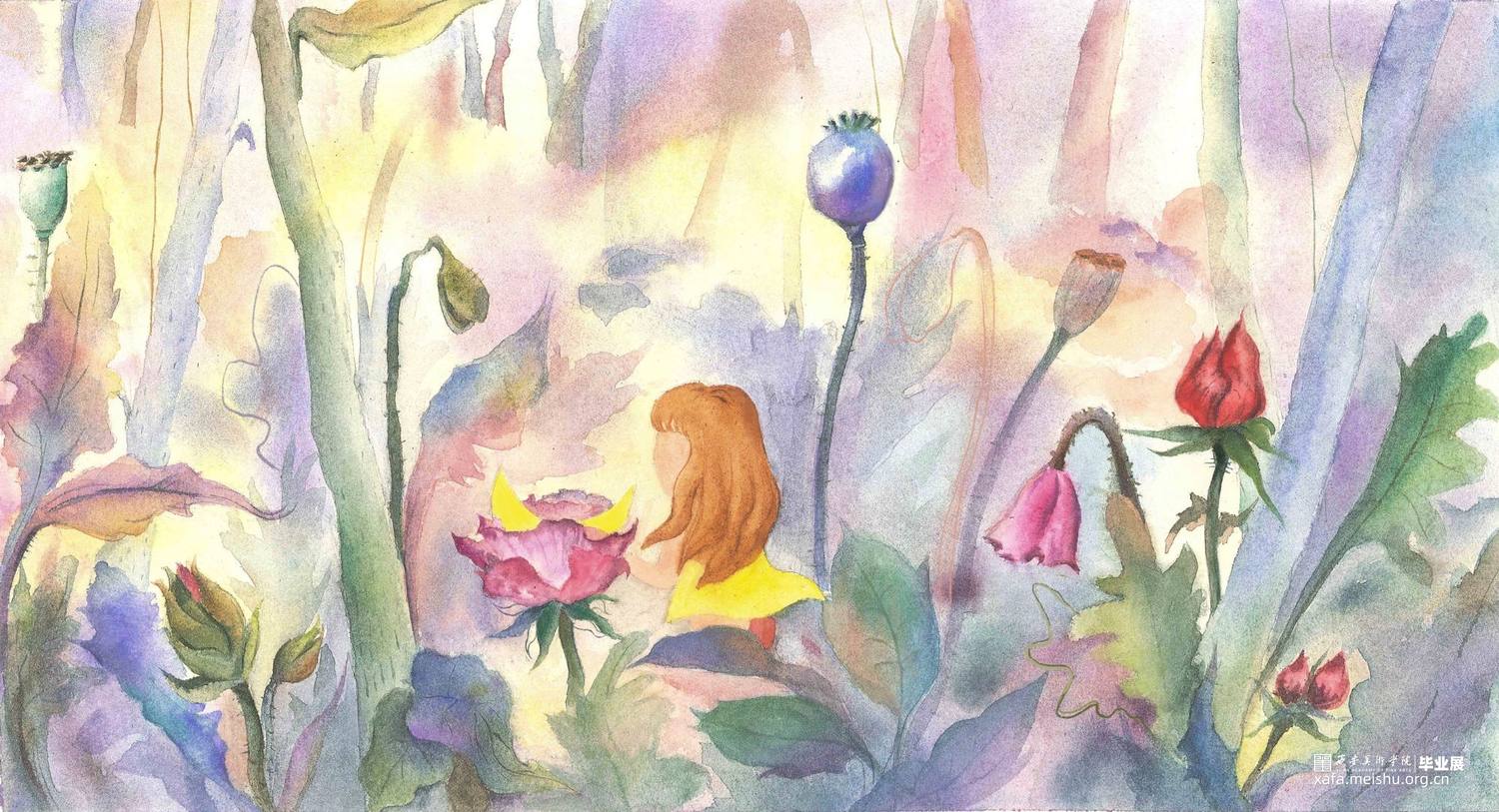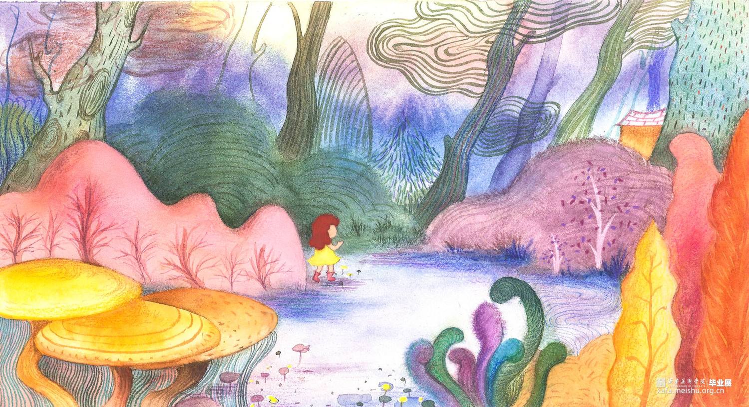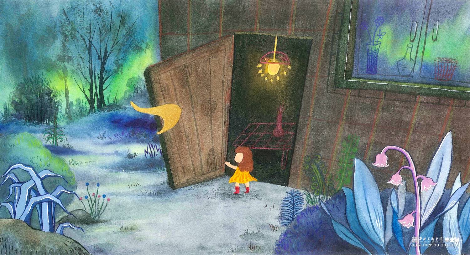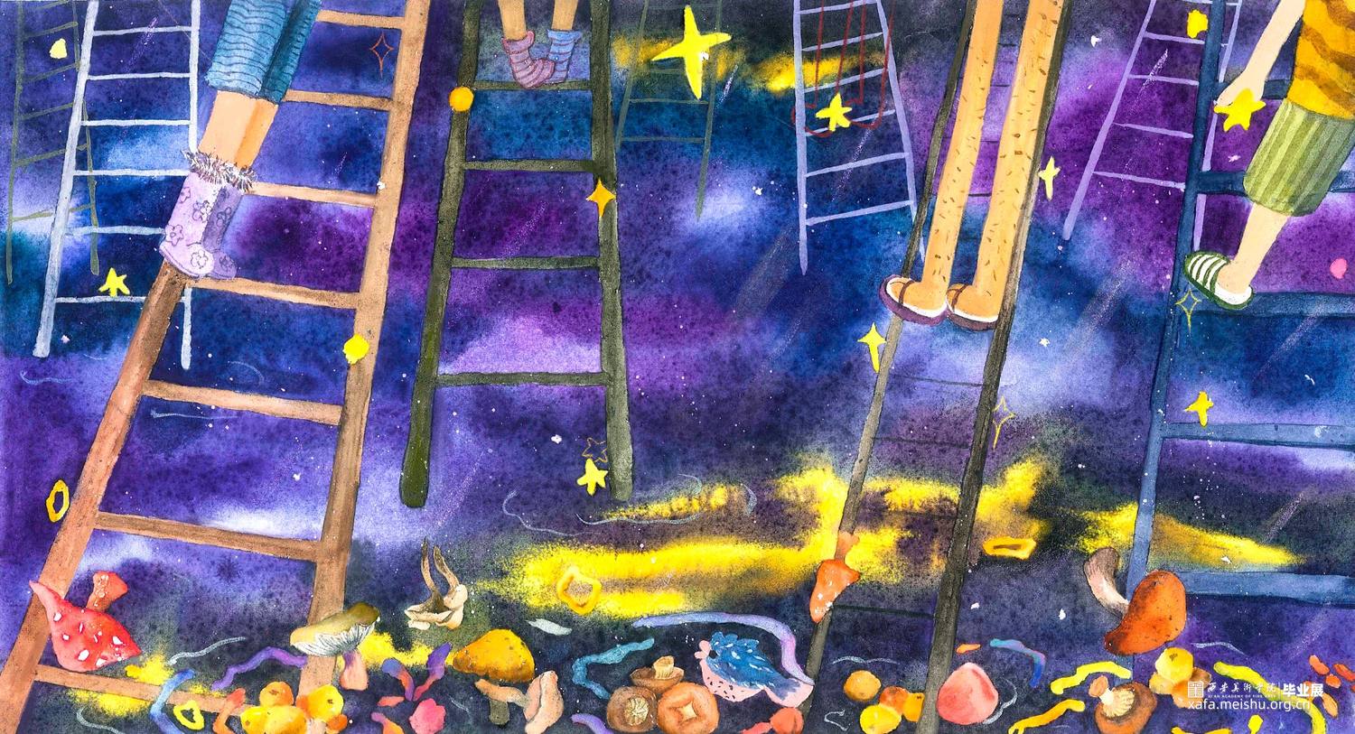 这组作品是以一个童话故事——《摘月亮的蜜朵》为背景创作的12张偏装饰性的插画水彩。