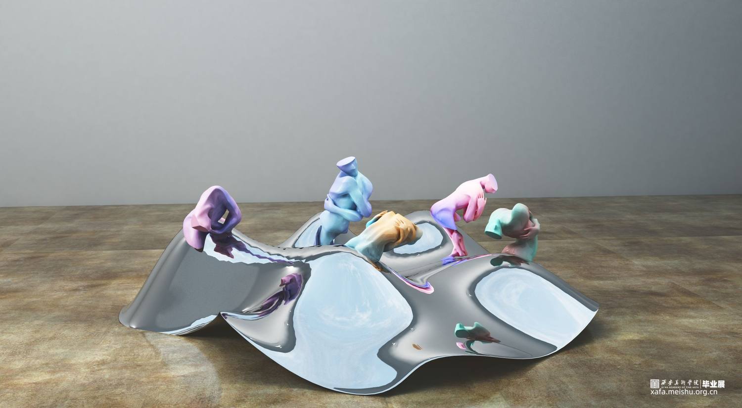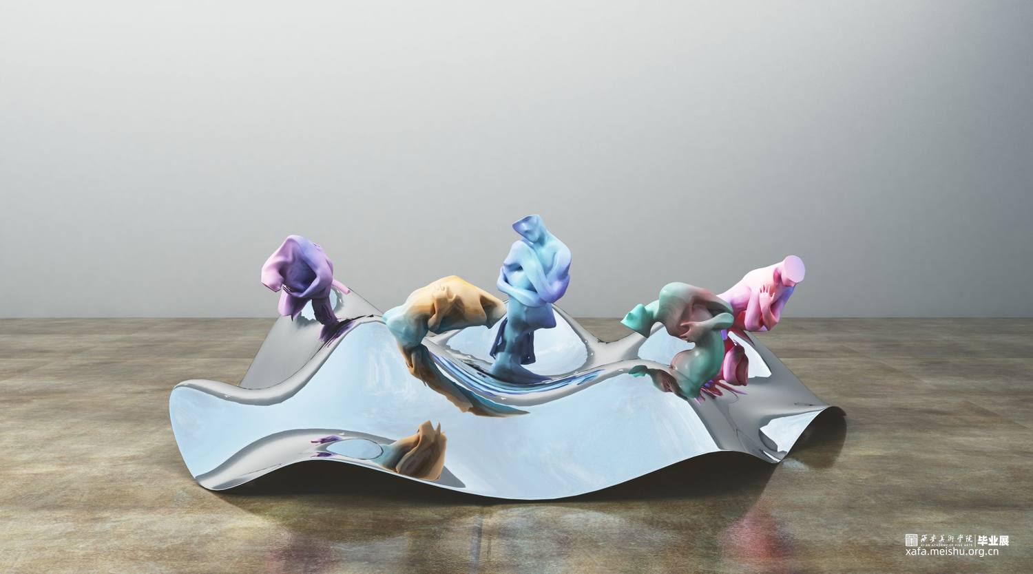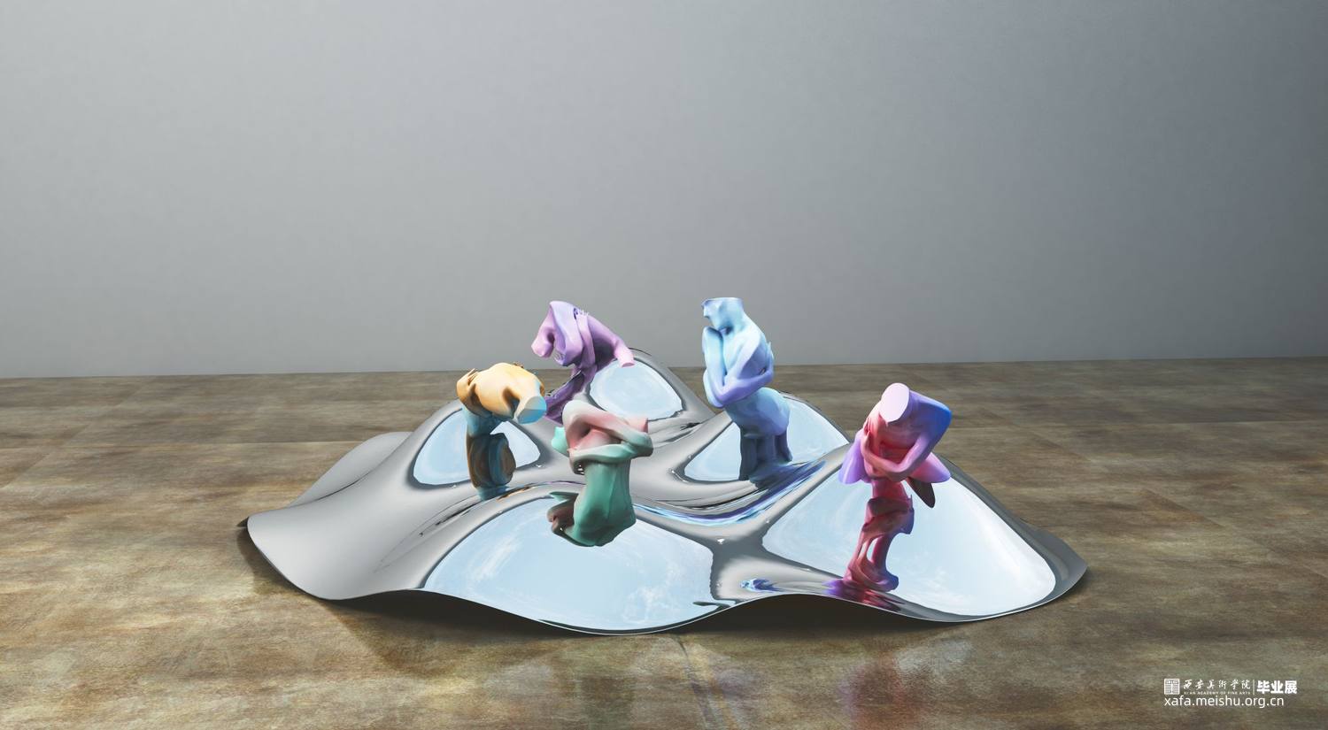 当作品的主体造型已经确定之后,作品的配色以及展陈效果就成了要思考的重点。在颜色方面,纯粹的单色和单色的渐变都显得缺乏新意,因此我选择了运用当下具有潮流特色的亮色作为基础色,并结合另外一种反差较大的颜色,两种相互矛盾碰撞的颜色同时出现在一件作品之上,也更加加深了作品纠结、挣扎、矛盾、不安的思想主题。在展示效果方面,由于我的作品本身就符合一组雕塑作品的特性,如果依然选择用传统的展台形式进行展陈,就会显得枯燥乏味、缺乏新意,因此我尝试了多种展示效果,例如将传统的展柜转化成玻璃材质或将展台进行切割变形等等,最终确定了以高低错落凸起的镜面不锈钢作为作品组合的公共展台。这种展示方式使得这组作品在展示效果上更具当代性,此外由于每个单独的作品都依附在一个凸起的镜面不锈钢之上,这就使得作品的放置变得摇摆不定,加深了作品的不安与无助之感。其次不锈钢的镜面成像效果也让这组作品在视觉上更加丰富。