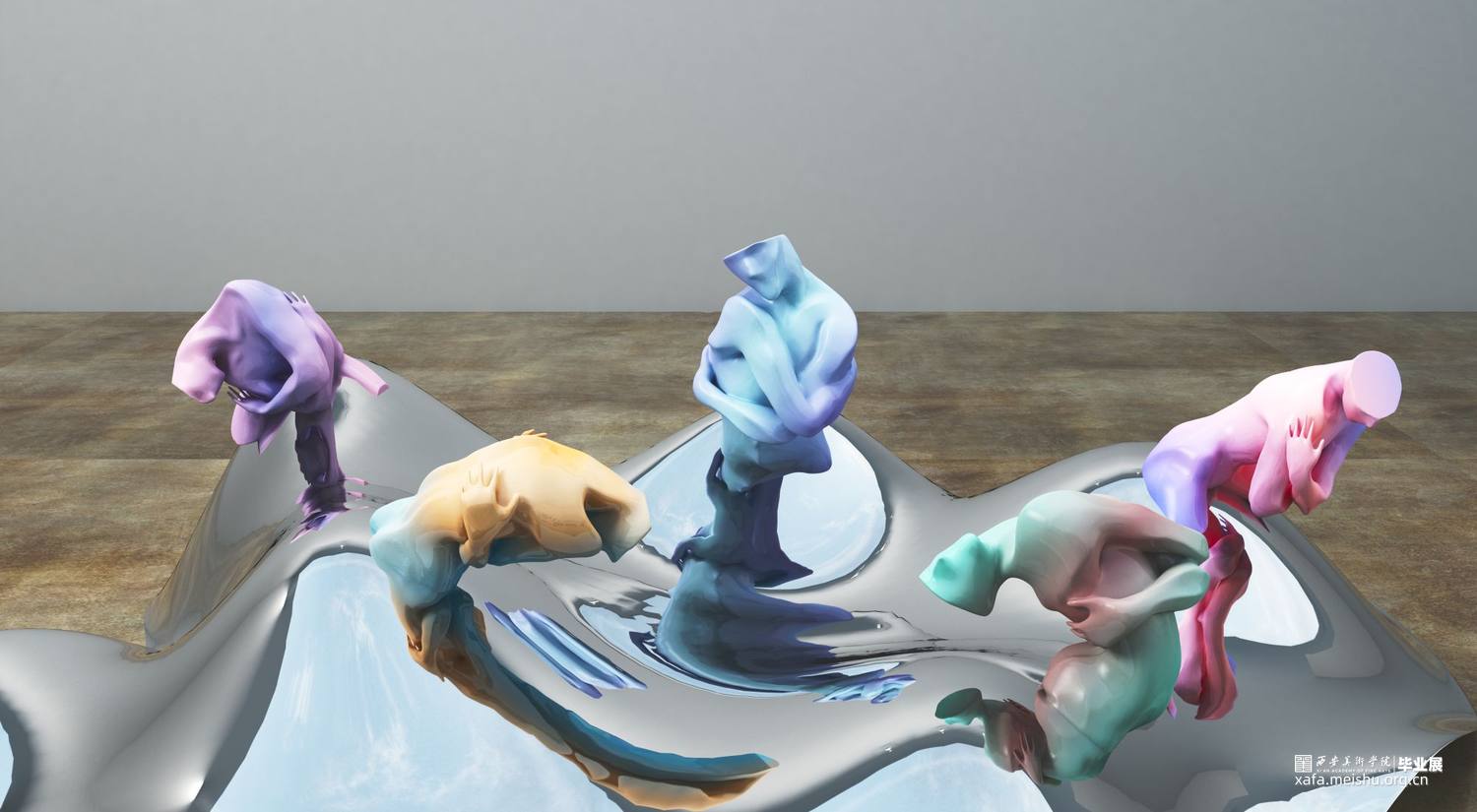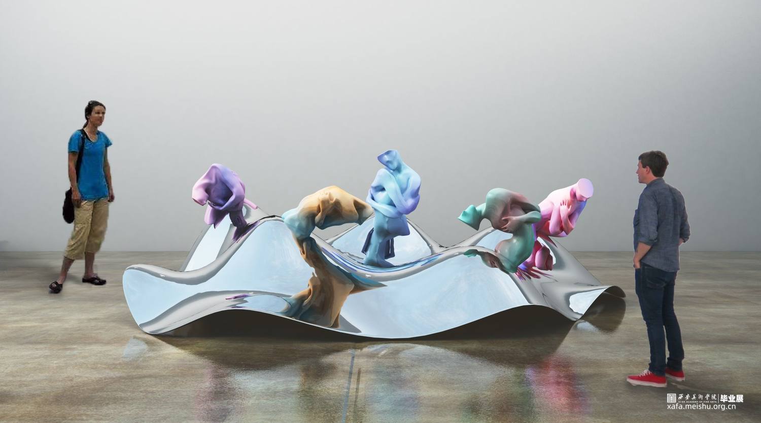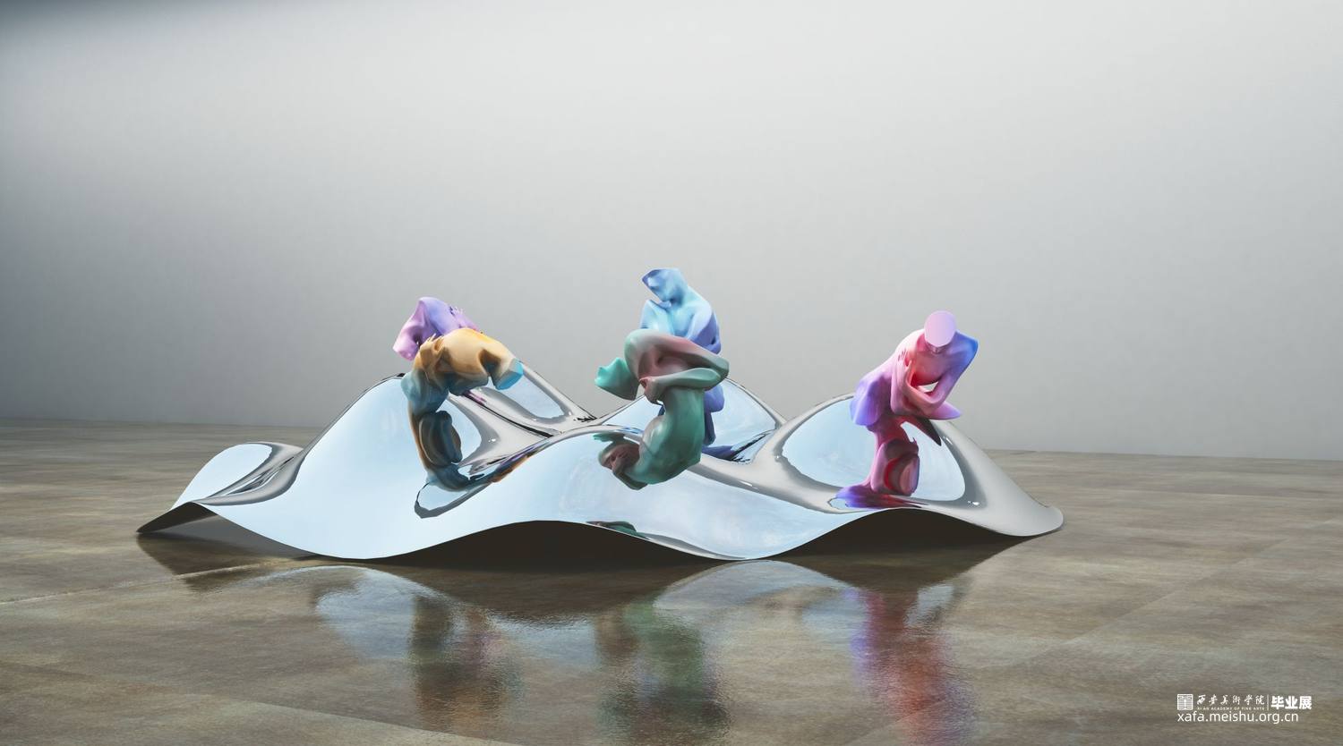 当作品的主体造型已经确定之后,作品的配色以及展陈效果就成了要思考的重点。在颜色方面,纯粹的单色和单色的渐变都显得缺乏新意,因此我选择了运用当下具有潮流特色的亮色作为基础色,并结合另外一种反差较大的颜色,两种相互矛盾碰撞的颜色同时出现在一件作品之上,也更加加深了作品纠结、挣扎、矛盾、不安的思想主题。在展示效果方面,由于我的作品本身就符合一组雕塑作品的特性,如果依然选择用传统的展台形式进行展陈,就会显得枯燥乏味、缺乏新意,因此我尝试了多种展示效果,例如将传统的展柜转化成玻璃材质或将展台进行切割变形等等,最终确定了以高低错落凸起的镜面不锈钢作为作品组合的公共展台。这种展示方式使得这组作品在展示效果上更具当代性,此外由于每个单独的作品都依附在一个凸起的镜面不锈钢之上,这就使得作品的放置变得摇摆不定,加深了作品的不安与无助之感。其次不锈钢的镜面成像效果也让这组作品在视觉上更加丰富。