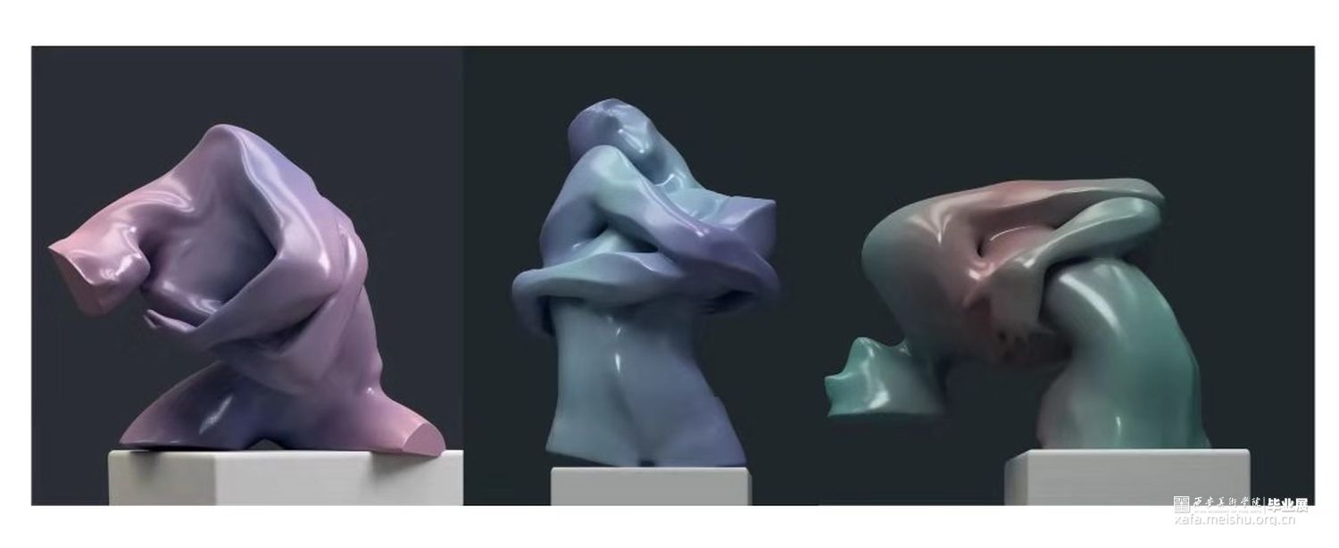 可以毫不隐讳的说,创作的过程是痛苦的,方案一次次的否定又一次次的推进,情绪也随之像过山车一样时起时落,有时方案迟迟没有起色,就会产生自我怀疑的情绪,这是非常可怕且让人沮丧的,不过好在有老师为我们保驾护航,每当思维进入瓶颈时,总能给予我们宝贵的引导。创作同样也是一件幸福的事,回顾过去的几个月,自己的作品从一个一念之间的想法成长到如今有血有肉的模样,心中的满足感也是难以言表的。在创作的初期,方案切入点的选择尤为重要,因此我选择了与自身息息相关的事件作为出发点进行创作,由于身处毕业季,因而我以自身对于毕业这一人生重要转点的来临,给人带来的迷茫感作为切入点进行创作。在创作对象的选择方面,我以人的躯体作为创作的对象,由于躯体是属于我们人类自己的,因此也是最为熟悉的生命系统,灵魂与躯壳的结合组成一个完整的人。灵魂包含了一个人的思想、性格等无形的特征;而躯体则是承接灵魂的载体,情绪的表达脱离不了人 这个本体,而除了面部五官可以传达人的情绪之外,人体躯干、四肢的造型变化同样也可以作为肢体语言来传达情绪。所以本人利用人体为基础进行切割、拉伸、夸张、变形,保留最能体现人物情绪特征的部分 ,从而传达毕业之际内心对于未来将要面对未知世界的不安。