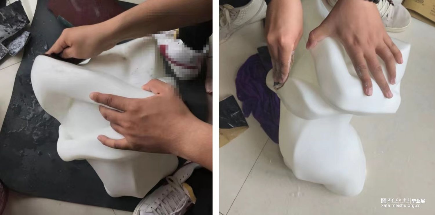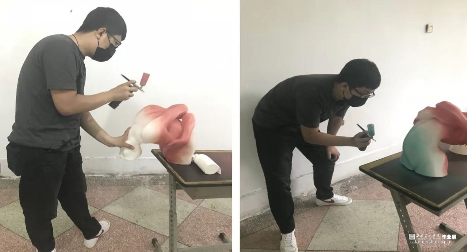 以上的呈现均是线上的虚拟效果,在现实中我采用了3D打印技术来实现作品的真实呈现,这也让我直接体验到了艺术与科技结合为创作所带来的便捷。3D打印主要以光敏树脂为材料,即轻盈又坚固,刷新了我对日常所见常规雕塑的认识,在我看来3D技术未来一定会在艺术特别是雕塑领域大放光彩。为了更好的体验完整的创作过程,同时也为了节约资金,我选择了自己动手给模型进行喷涂,在喷漆之前,需要将模型表面由于打印而产生的细小纹路打磨抛光 ,这是一个非常考验耐心的过程。打磨过后,我利用了给玩具模型着色的便携式喷笔对作品进行了着色。