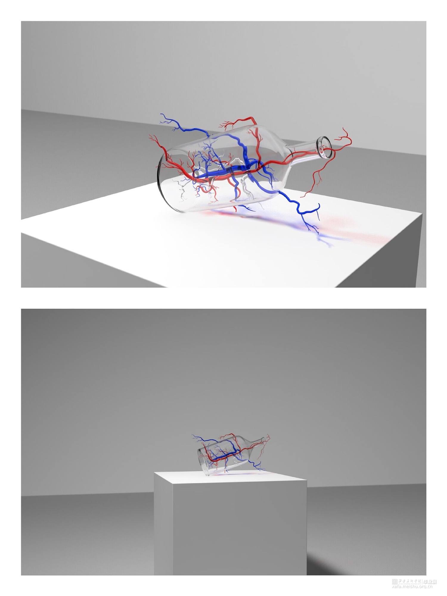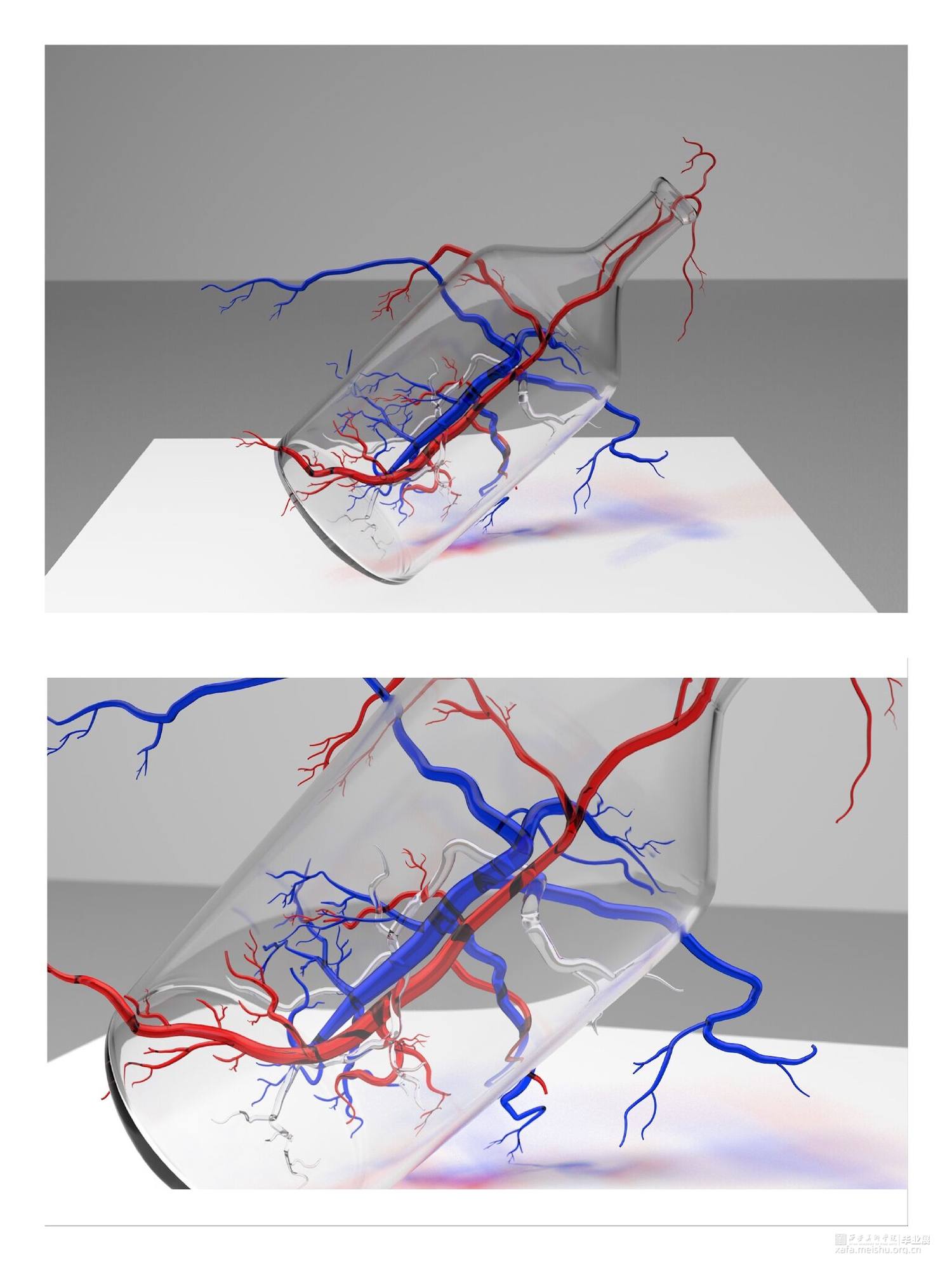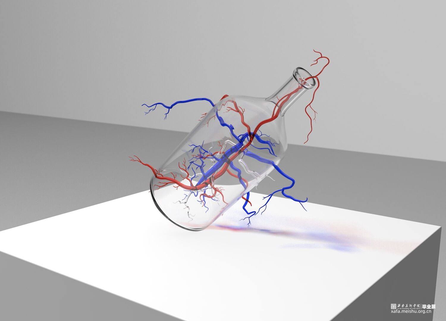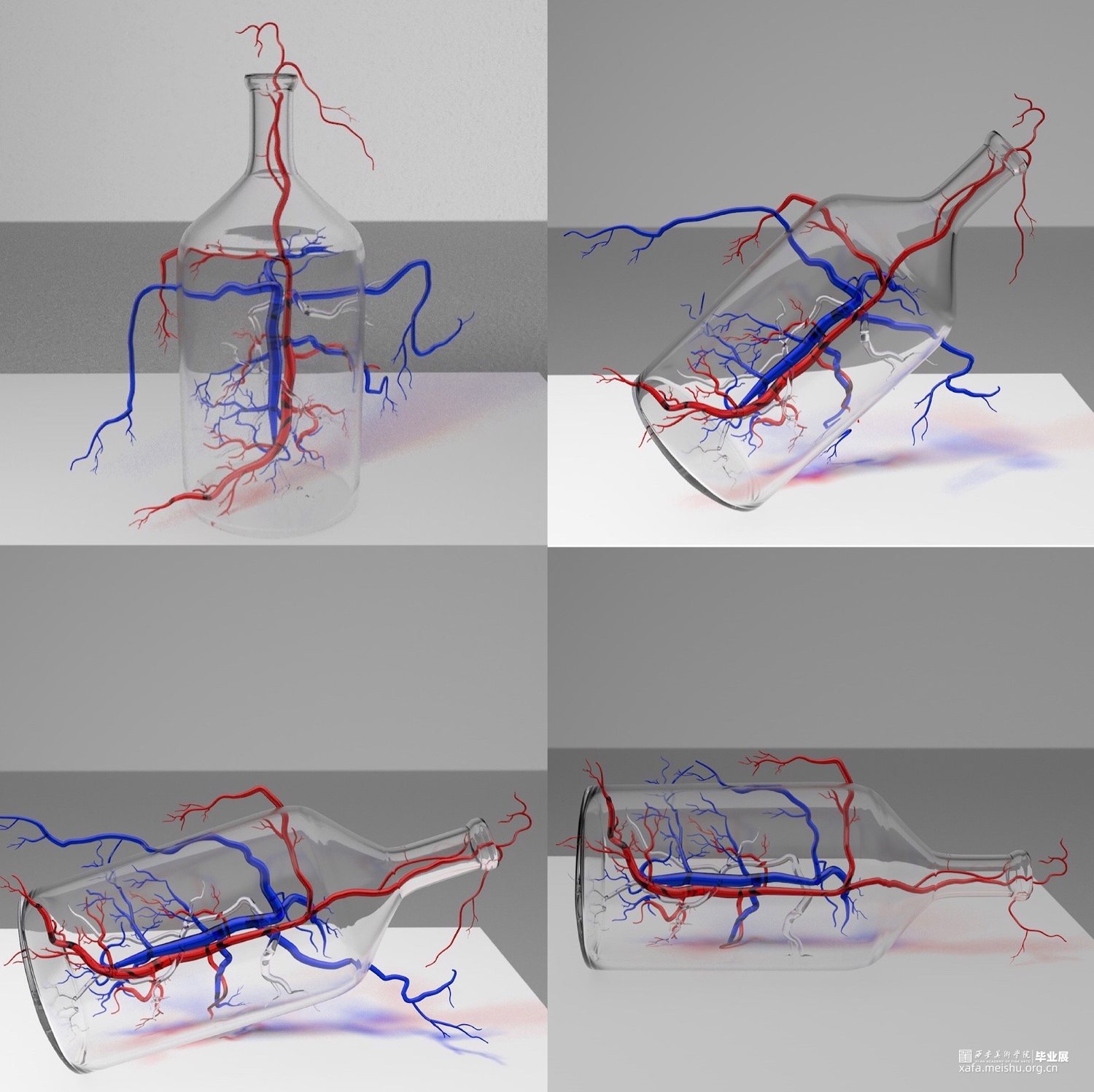 大四第一学年,我们的毕业创作就正式开始了。首先是前期准备工作,邢戈老师给我们上了毕业创作相关的理论课,让我们了解到毕业创作分为哪些步骤,该从哪里入手,也给我们看了很多案例,启发了我们的思维。接下来就从草图开始了,每个人都尽可能地多想一些方案,老师看过后觉得可行的方案就会让我们继续深入完善。在pass掉很多个方案后,我通过一张图有了新的灵感,决定从人体和血管入手。用针织制作外骨骼和内脏,用透明橡胶管模拟血管。然后老师给我的建议是去掉外骨骼和内脏,只做血管,因为全部都做就会看起来太杂,什么都想表达,就容易什么都表达不好。听取老师的意见后,我做了修改,去掉了骨骼和内脏,把血管模拟在了人体表面,更像是一种肌理纹路。在给老师看了之后,老师说血管的载体可以再抽象一点,不一定要具体的人体,可以是别的物体。然后我就改成了单个体量更小,但是数量变成四个的系列作品,血管我也改得更加接近于真实效果了。血管材质是玻璃,载体用亚克力板组装成的方盒似乎又有点没新意,也没有任何能联系实际的意义,于是我将方盒又改成了玻璃酒瓶。注入红色和蓝色液体的玻璃管像遍布人体全身的动静脉血管一样,横向延长,就像一个躺着的人。从头到脚的“血管”都穿过玻璃酒瓶,代表这个人一生都被酒精所包围、浸泡,越来越倾斜,然后倒下的酒瓶也预示着这个人的最后将会被“酒”所击垮。