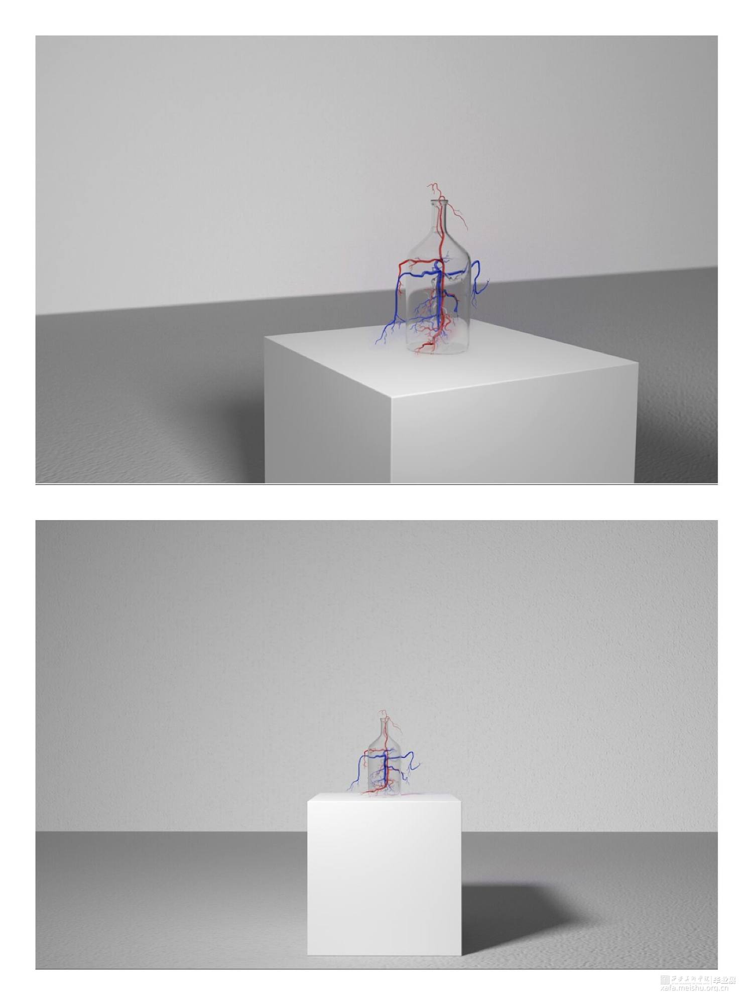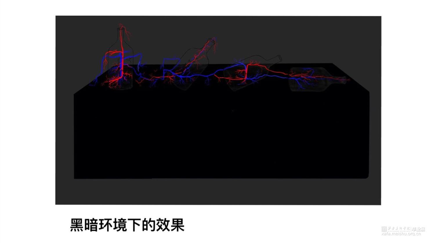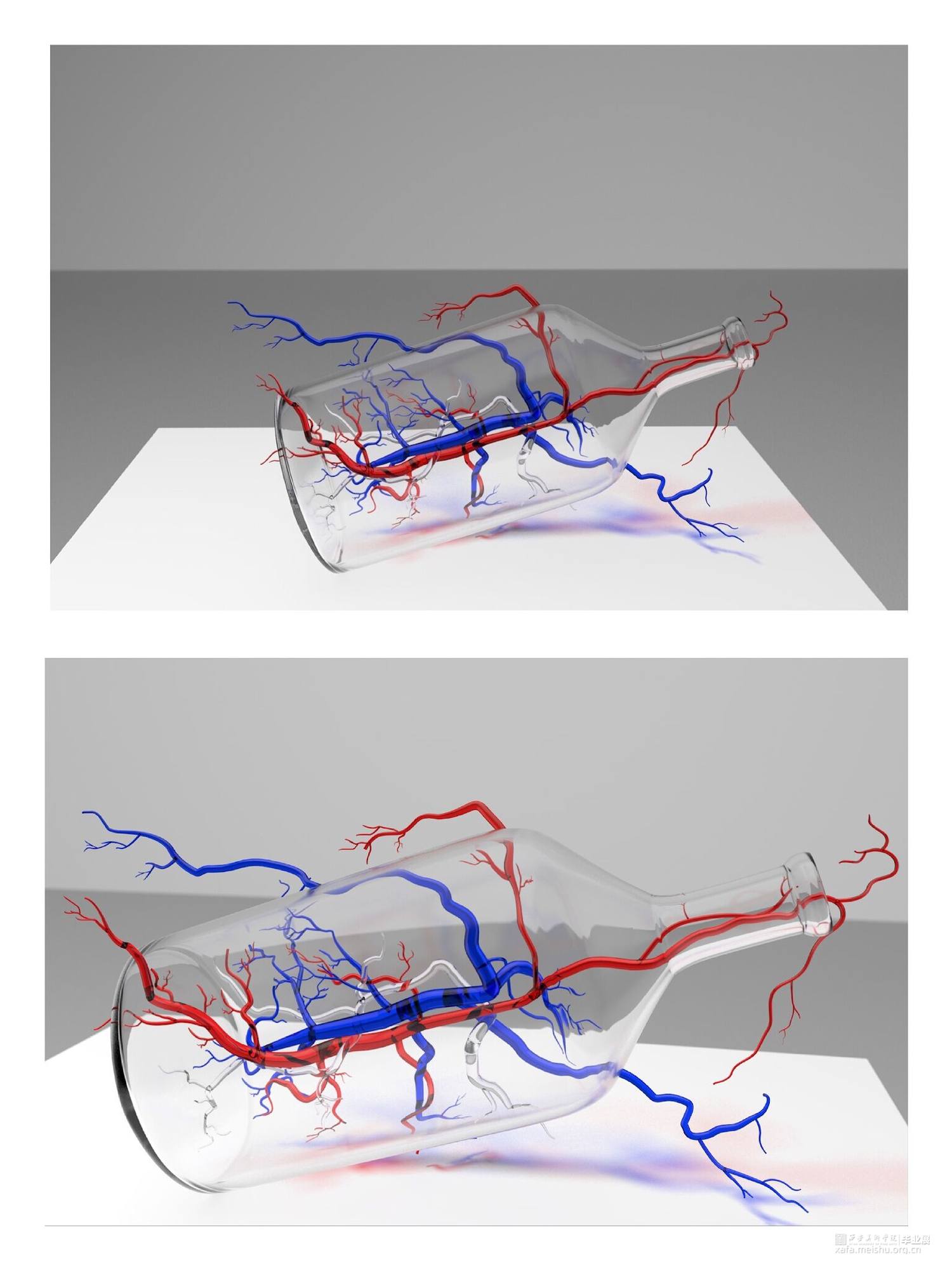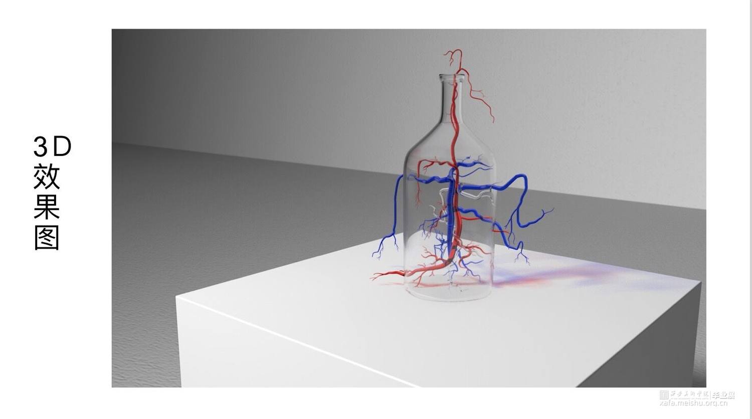 大四第一学年,我们的毕业创作就正式开始了。首先是前期准备工作,邢戈老师给我们上了毕业创作相关的理论课,让我们了解到毕业创作分为哪些步骤,该从哪里入手,也给我们看了很多案例,启发了我们的思维。接下来就从草图开始了,每个人都尽可能地多想一些方案,老师看过后觉得可行的方案就会让我们继续深入完善。在pass掉很多个方案后,我通过一张图有了新的灵感,决定从人体和血管入手。用针织制作外骨骼和内脏,用透明橡胶管模拟血管。然后老师给我的建议是去掉外骨骼和内脏,只做血管,因为全部都做就会看起来太杂,什么都想表达,就容易什么都表达不好。听取老师的意见后,我做了修改,去掉了骨骼和内脏,把血管模拟在了人体表面,更像是一种肌理纹路。在给老师看了之后,老师说血管的载体可以再抽象一点,不一定要具体的人体,可以是别的物体。然后我就改成了单个体量更小,但是数量变成四个的系列作品,血管我也改得更加接近于真实效果了。血管材质是玻璃,载体用亚克力板组装成的方盒似乎又有点没新意,也没有任何能联系实际的意义,于是我将方盒又改成了玻璃酒瓶。注入红色和蓝色液体的玻璃管像遍布人体全身的动静脉血管一样,横向延长,就像一个躺着的人。从头到脚的“血管”都穿过玻璃酒瓶,代表这个人一生都被酒精所包围、浸泡,越来越倾斜,然后倒下的酒瓶也预示着这个人的最后将会被“酒”所击垮。
