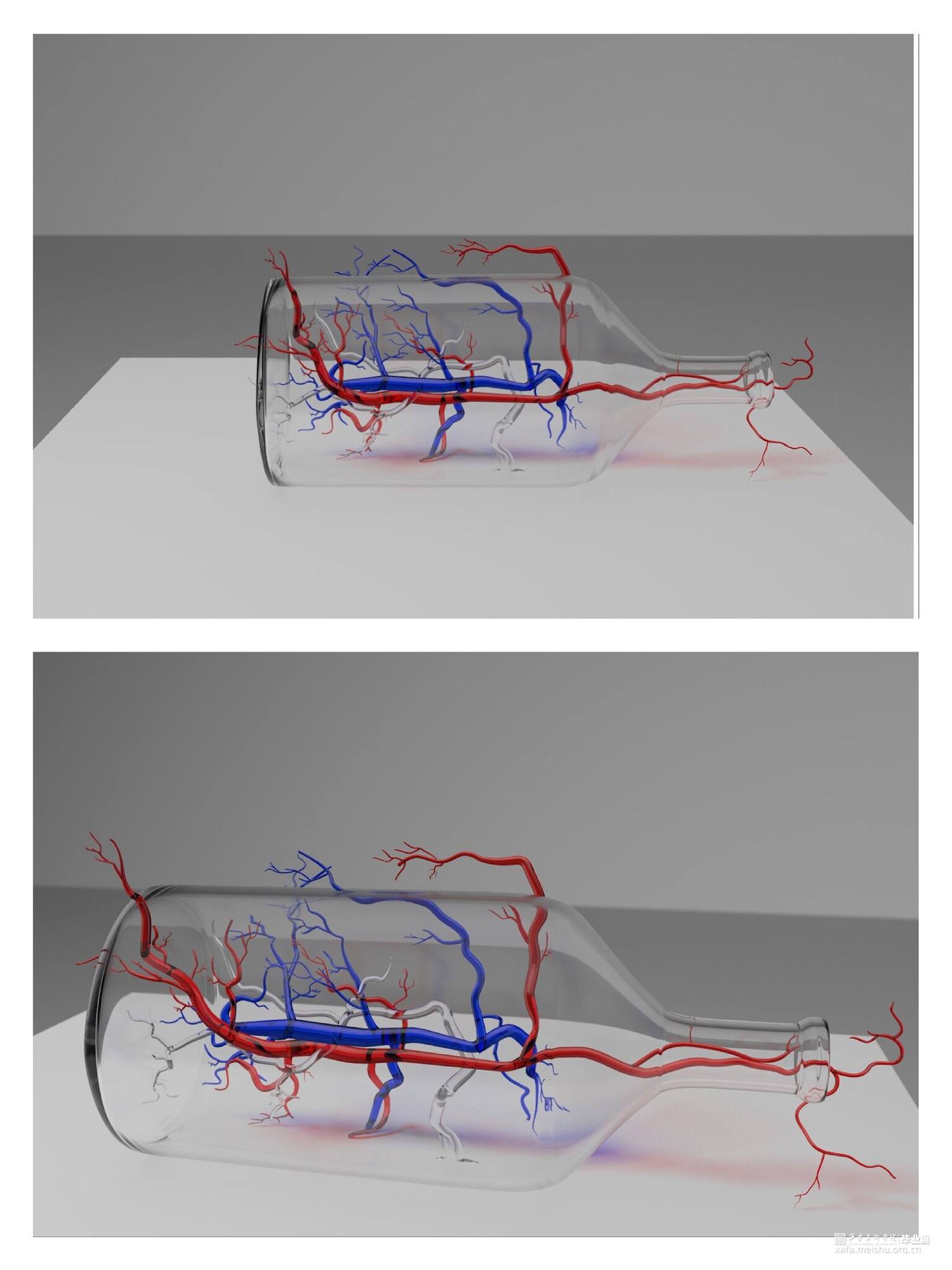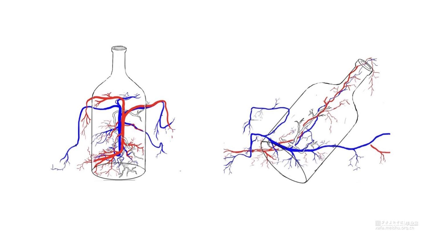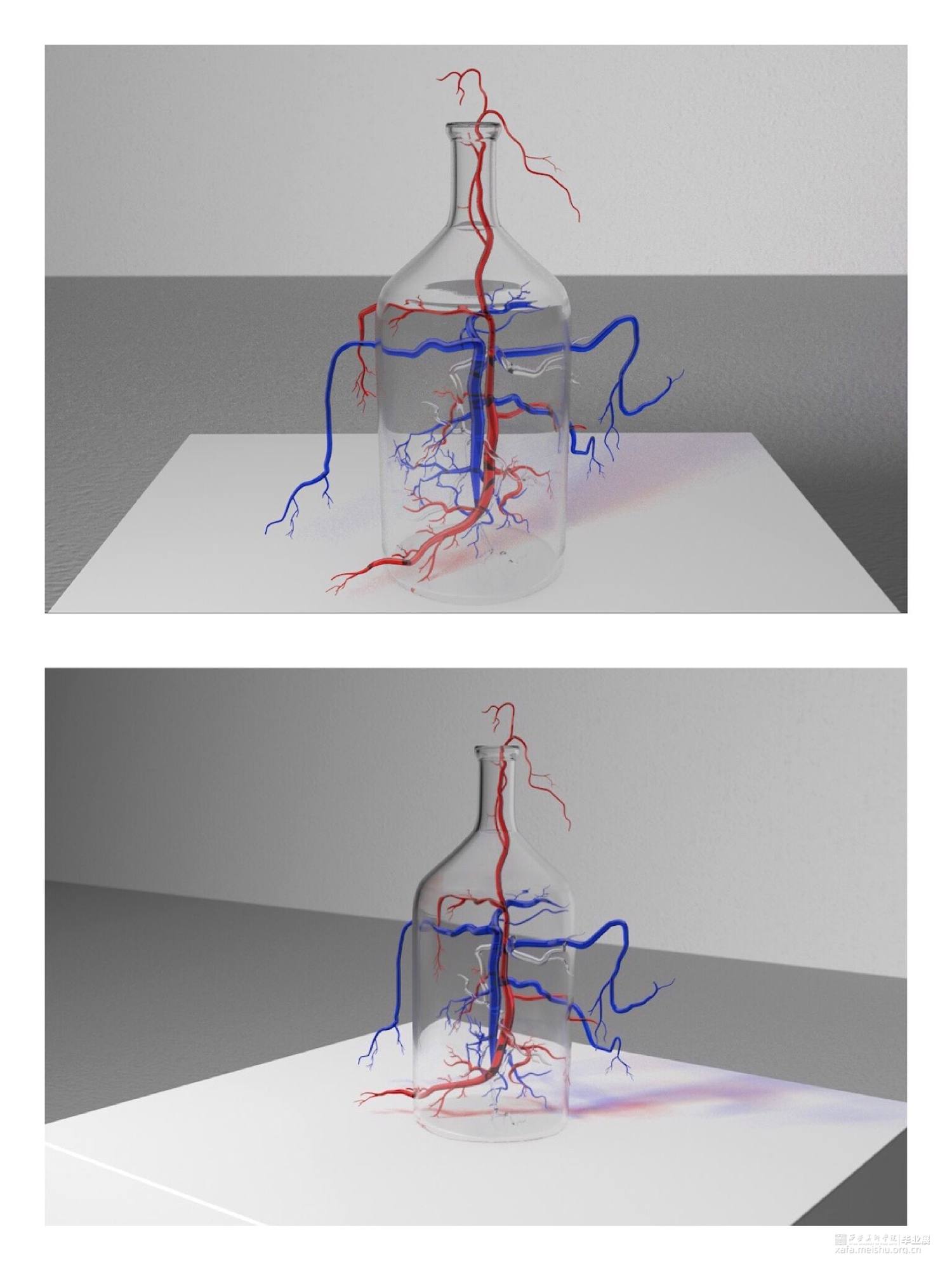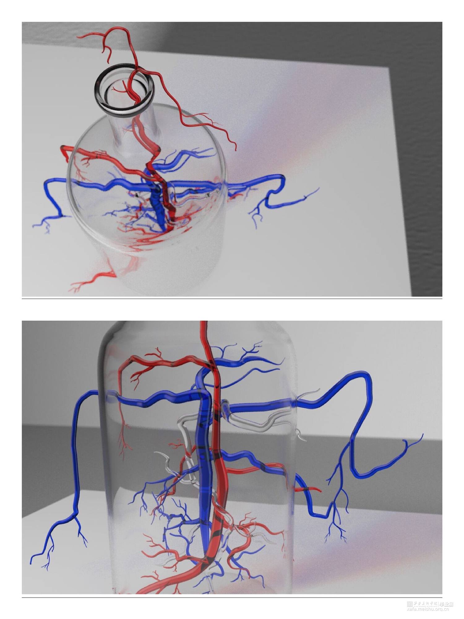 大四第一学年,我们的毕业创作就正式开始了。首先是前期准备工作,邢戈老师给我们上了毕业创作相关的理论课,让我们了解到毕业创作分为哪些步骤,该从哪里入手,也给我们看了很多案例,启发了我们的思维。接下来就从草图开始了,每个人都尽可能地多想一些方案,老师看过后觉得可行的方案就会让我们继续深入完善。在pass掉很多个方案后,我通过一张图有了新的灵感,决定从人体和血管入手。用针织制作外骨骼和内脏,用透明橡胶管模拟血管。然后老师给我的建议是去掉外骨骼和内脏,只做血管,因为全部都做就会看起来太杂,什么都想表达,就容易什么都表达不好。听取老师的意见后,我做了修改,去掉了骨骼和内脏,把血管模拟在了人体表面,更像是一种肌理纹路。在给老师看了之后,老师说血管的载体可以再抽象一点,不一定要具体的人体,可以是别的物体。然后我就改成了单个体量更小,但是数量变成四个的系列作品,血管我也改得更加接近于真实效果了。血管材质是玻璃,载体用亚克力板组装成的方盒似乎又有点没新意,也没有任何能联系实际的意义,于是我将方盒又改成了玻璃酒瓶。注入红色和蓝色液体的玻璃管像遍布人体全身的动静脉血管一样,横向延长,就像一个躺着的人。从头到脚的“血管”都穿过玻璃酒瓶,代表这个人一生都被酒精所包围、浸泡,越来越倾斜,然后倒下的酒瓶也预示着这个人的最后将会被“酒”所击垮。