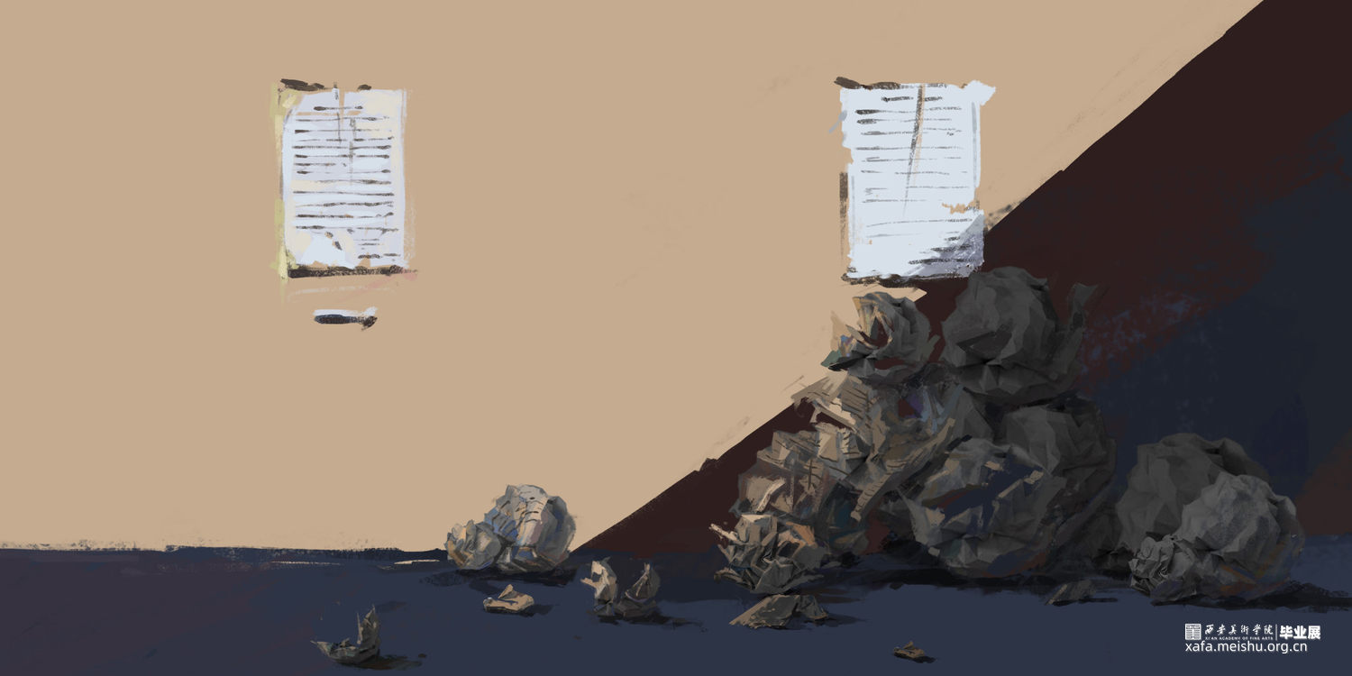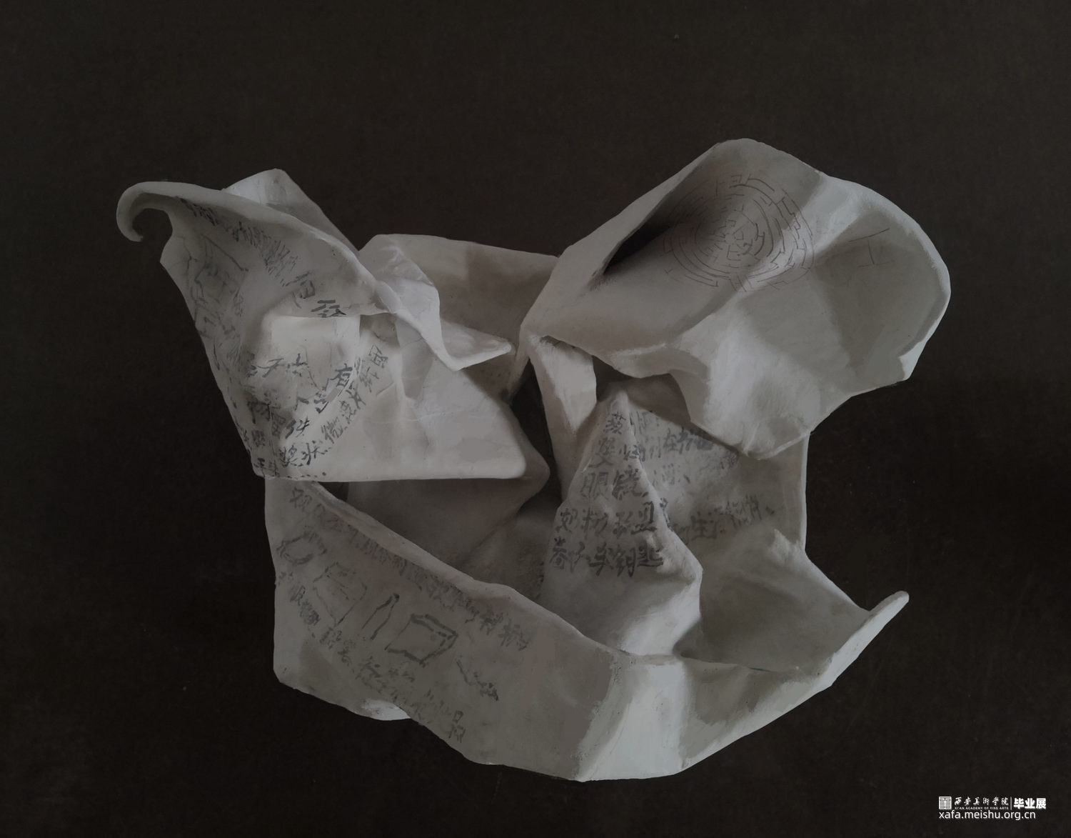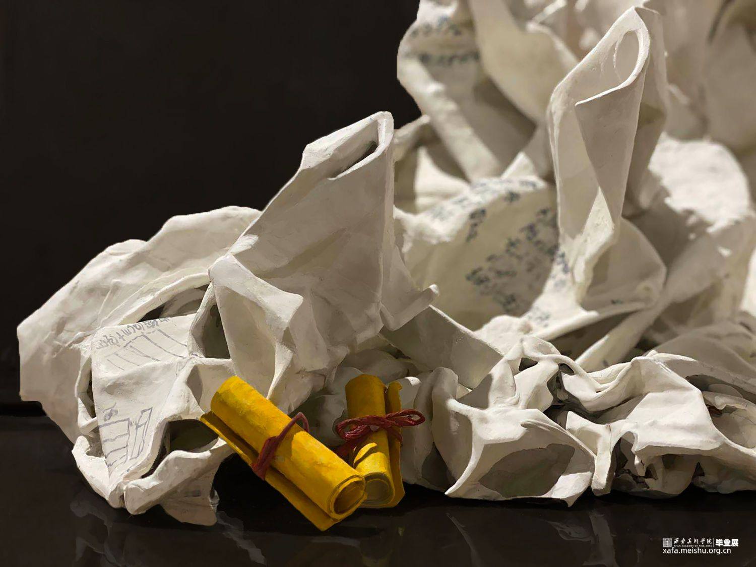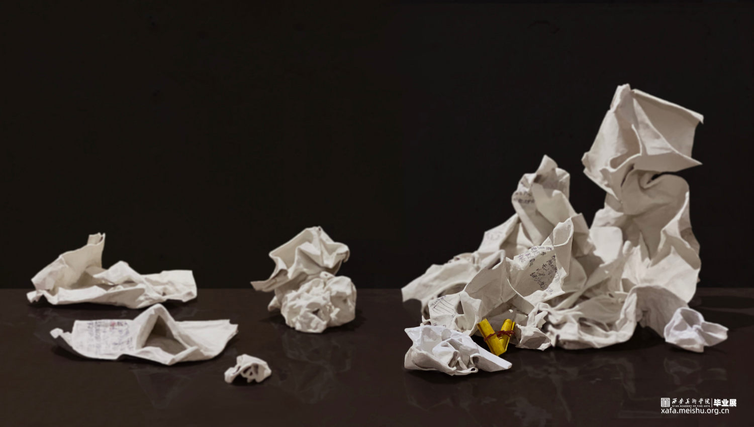 当代的快节奏社会下,我们往往忽略了过程中那些所谓的错误,只顾着向上向前,将创作过程提炼成纸团。这一创作中的具象物体,提醒人们有时候也需要停下脚步回溯自我。