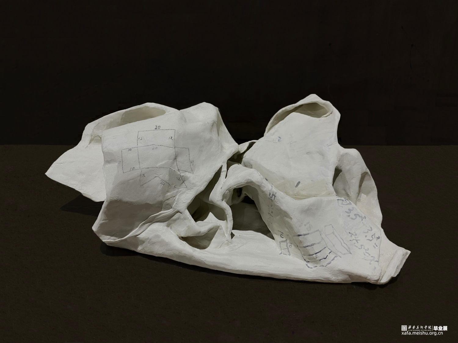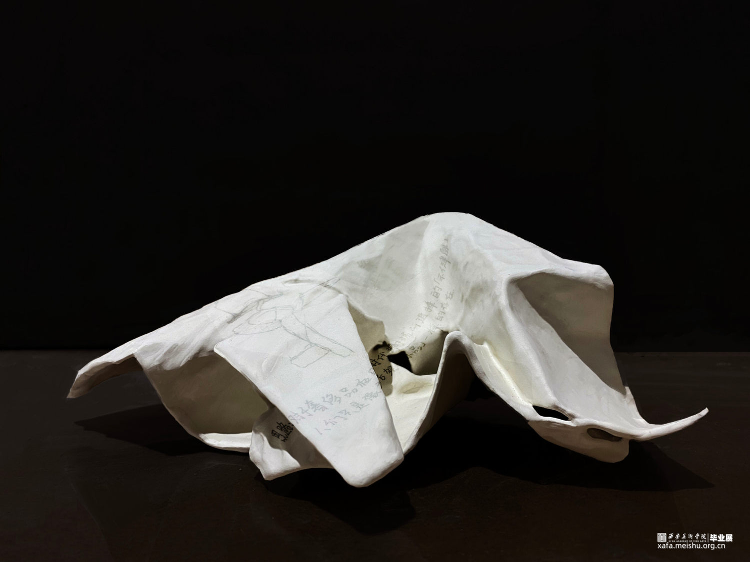 后来。刘老师为我开拓了一种新的创作思路模式。参考纸张的制作工艺,将纸张与泥浆混合。泥浆中保留纸张的纤维作为作品的内部支撑。但还是出现了裂纹的问题,我也在多次尝试改良自己制作的不足。同时,我将进行了