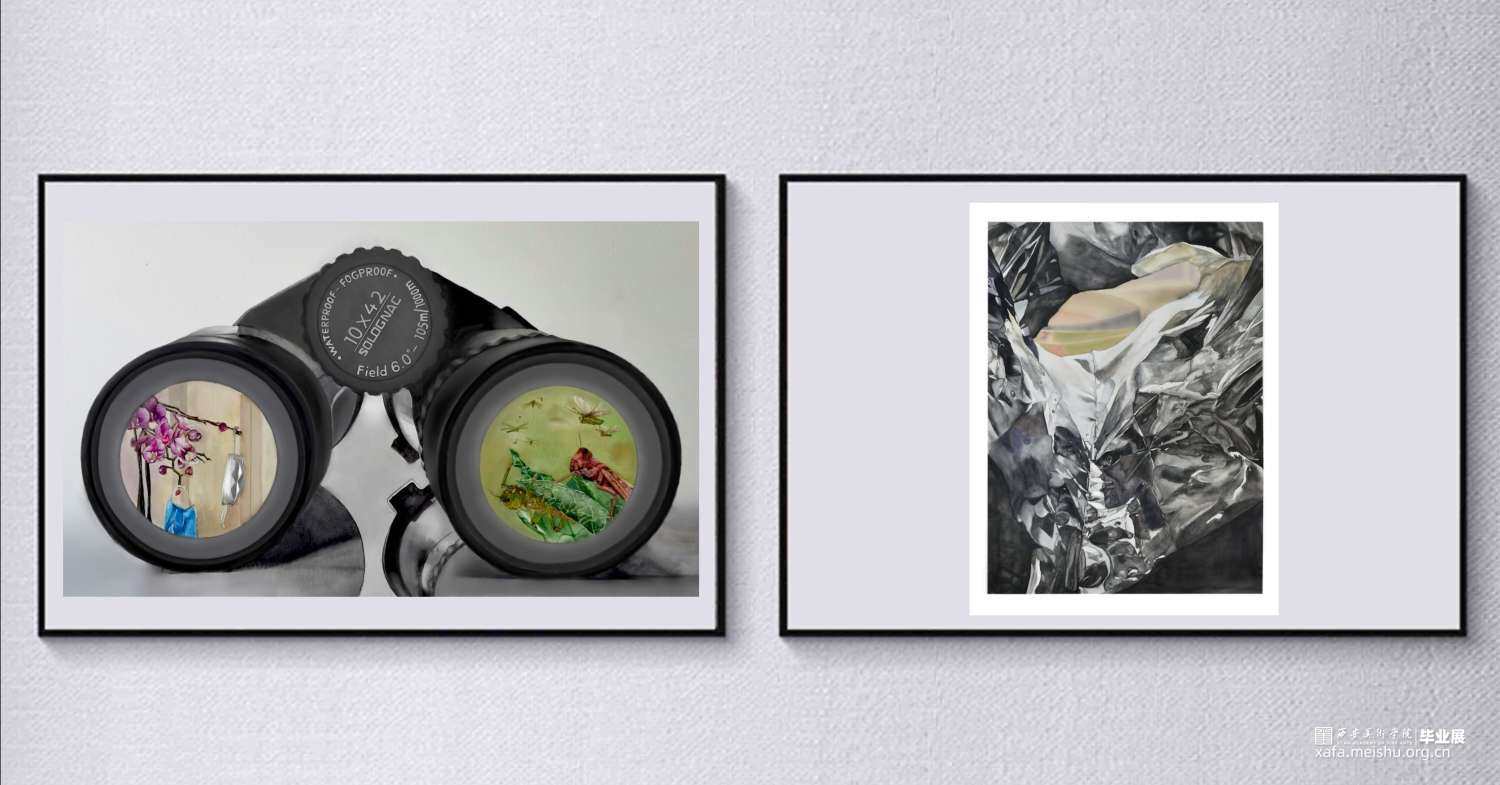 《( )望》:决定以疫情为创作的一个主题,于是我开始在家里探索以前没有注意过的有趣事物,我从一个柜子里翻找了出来一部望远镜,举着它在家里四处张望,突然有一天,镜头略过了玄关柜上放着的一盆蝴蝶兰,疫情期间,这盆花不仅仅是家里的装饰物,还巧妙地变成了口罩架,枝头的花骨朵就是拦住口罩下滑趋势的钩子,我突然对镜头里的画面起了兴趣。我开始不断地调整距离,用手机摄像机对着望远镜的一个镜头抓拍了很多张照片,最后选取了这样的一张照片。