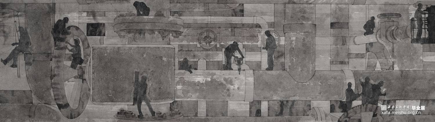 版块(二):用生活常见的水管道或是工业废弃的运输管道,进行有序的排列来描绘疫情虽然爆发但是社会依旧井然有序的画面,之所以社会可以如此临危不乱有条理有秩序的继续发展,离不开有着像水管道维修工人们一样的默默无闻的社会基层人员的不懈努力和恪尽职守,使得水管道(社会)才能正常的运作;