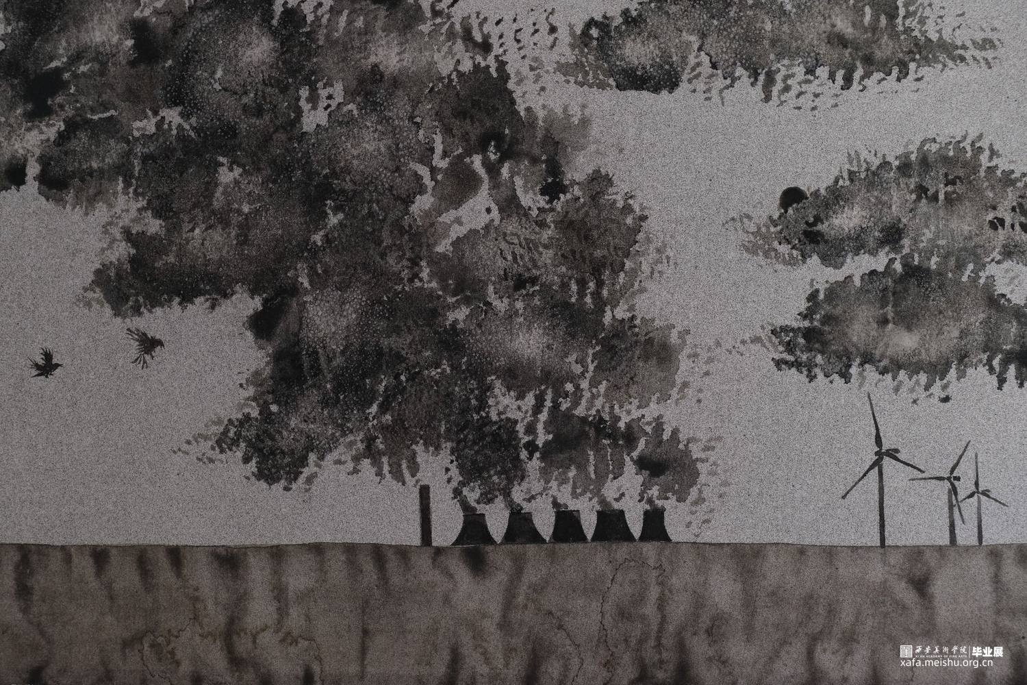板块(一):描绘一幅社会问题就像是工厂的工业废烟废气一样,最终都会通过某些渠道(画面中用烟囱来形容),渐渐的都会暴露在世人的面前,让这些废烟废气(社会的负面问题以及相关疫情真相的谎报谎言谣言等)为世人看的一清二楚。同时加一些风车来吹散这些扰人的烟尘(就像真相浮出水面时会有各界媒体通过舆论手段将其埋没,试图蒙混过去,欺骗世人的眼睛一样),最后加一些具有象征意义的鸟儿。在烟从旁边加一些乌鸦,乌鸦的嗅觉敏锐,能远远地感受到腐败死亡的气味,所以我觉得在我的画面当中,用乌鸦来衬托废烟废气(疫情真相、政府腐败以及人性险恶)是在合适不过了。最后在画面的右上角加上一些折返的大雁或是白鸽,象征着春回大地,象征着抗疫勇士凯旋归来,象征着和平和全新的未来。