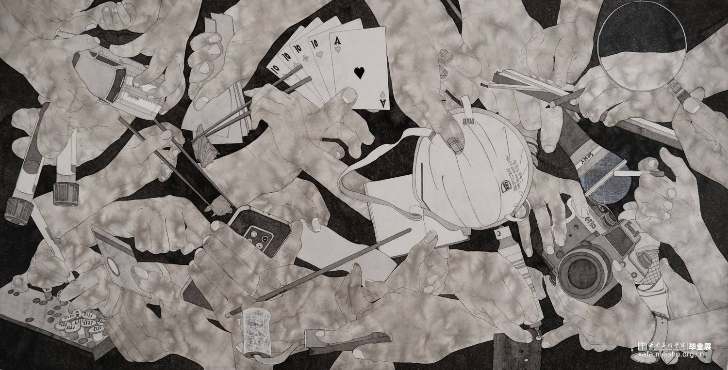 综上所述画面整体分为四个大的板块,通过对生活日常所见所闻的事物进行描绘,将其通过艺术渲染的表现手法转化为一种具有特殊寓意的符号语言,从而暗喻疫情期间发生的种种动人的事迹,亦好亦坏,让知者动心,这就是我的画面所追求的目标也即是我内心所想。