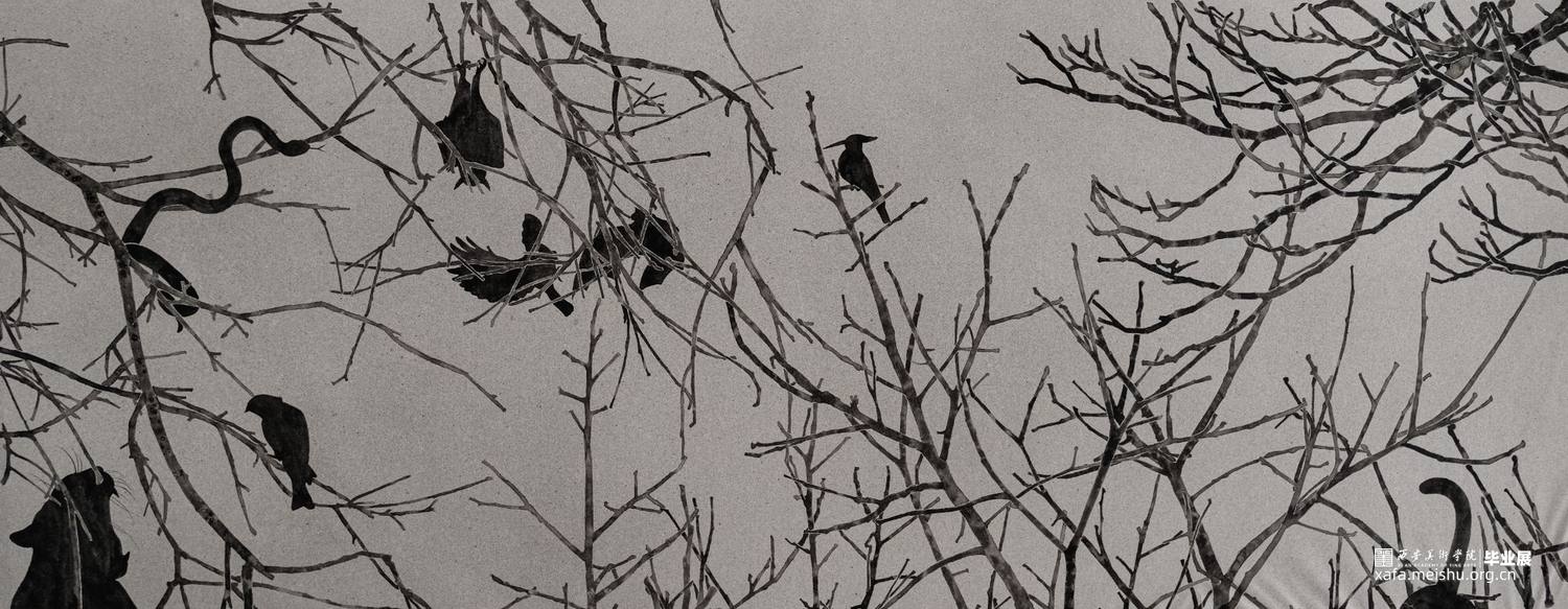板块(三):描绘一幅林中争斗的场景,用动物的行为来暗示疫情爆发后,武汉政府那些对病毒有着威胁力的医疗机构或是有着一定危险论发言权的人,形同虚设,就像蝙蝠伏击在森林深处,作为它的天敌老虎、蛇们一般,只是目光威慑但并未做出实际行动的情节,画面当中暗藏在错落的树枝背后的一只鸟儿站出来勇敢的和蝙蝠做撕扯,鸟儿虽然不是蝙蝠的天敌,对它构不成致命的威胁,就像李文亮医生生前并不是专业的病毒研究学专家,也非可以对此次疫情病毒本身构成威胁的直接发言人,他仅仅只是一个普通的眼科医师,面对即将到来的危险却勇敢的站出来与之斗争到底,即便粉身碎骨也浑然不怕,用鸟儿作为一种符号语言来表达和暗喻一些疫情初期站出来勇敢的与之较量的勇士们;