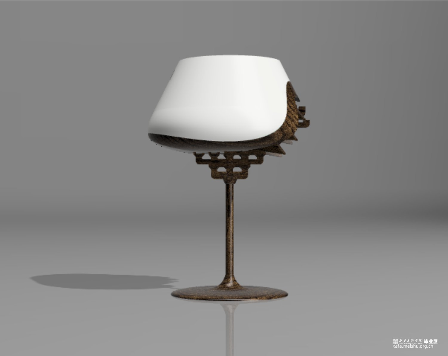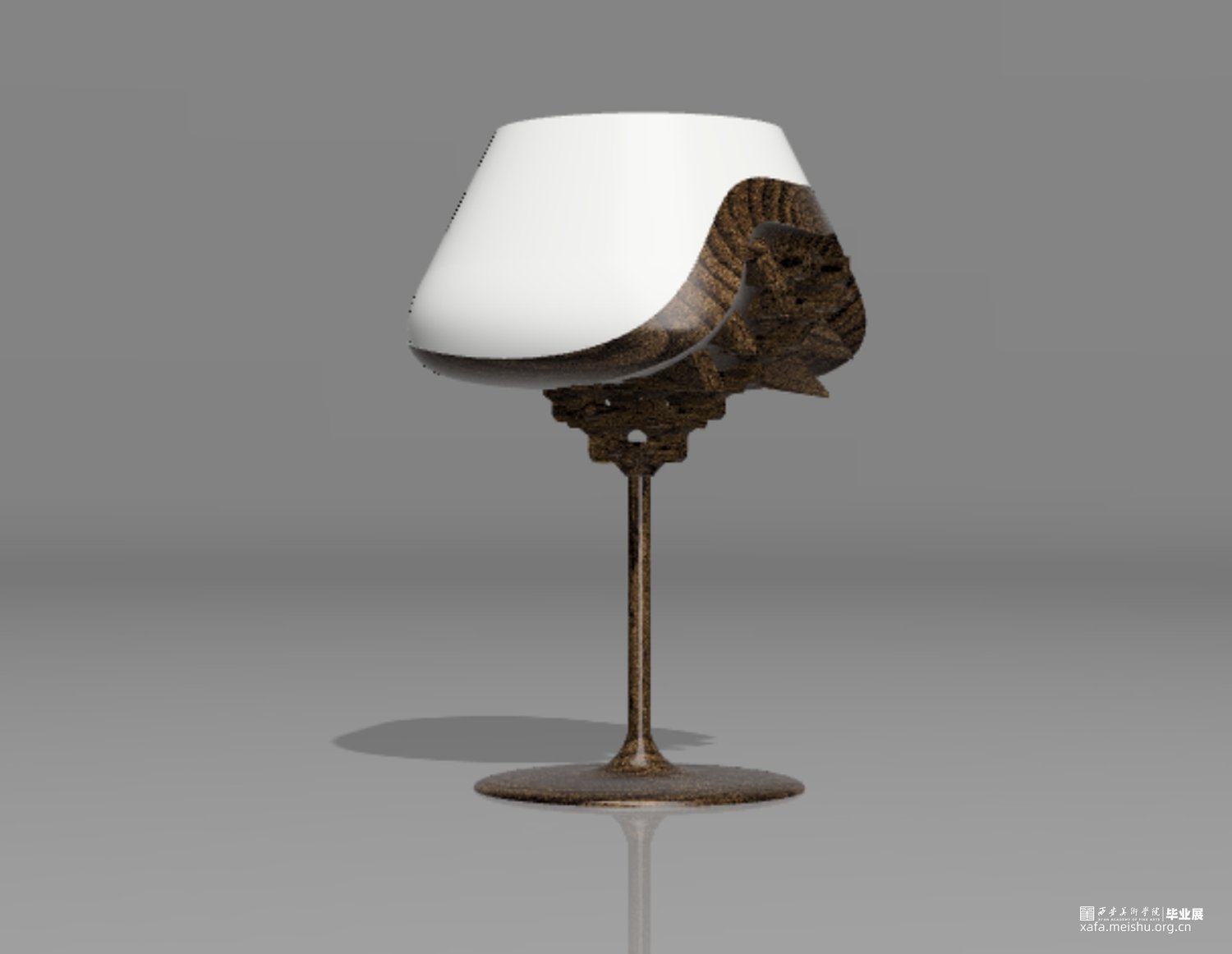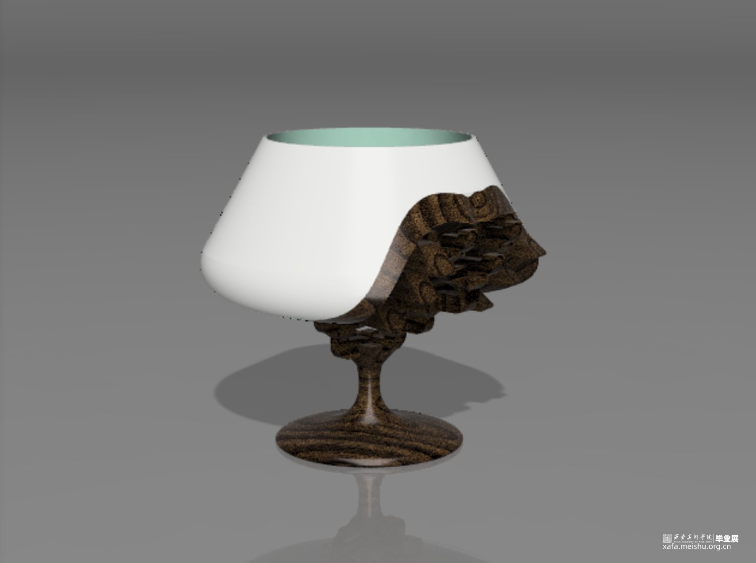 整件作品将斗拱与高足杯做了一个同构,用斗栱的形状替换了高足杯的下半部分,杯体使用陶瓷材质,杯足使用木材,在陶瓷与木材之间增加了过渡部分,表现出了一种内部结构被包裹隐藏起来的感觉。用榫卯结构的特点将上下两部分牢牢地结合在一起,斗栱在建筑中最重要的作用便是承重,因此我将这一特点也运用到了作品中,用斗栱结构来支撑起整个杯体的重量,使上半部分陶瓷的重量可以被各个结构分散,最终传到杯足上,斗栱的承重作用在这里得到了很好的体现,而斗栱特有的精美外形,也给作品增添了色彩,不再单调。