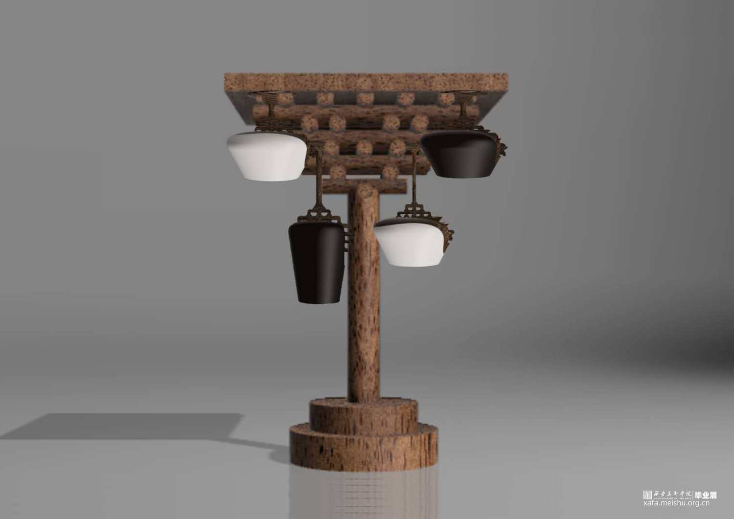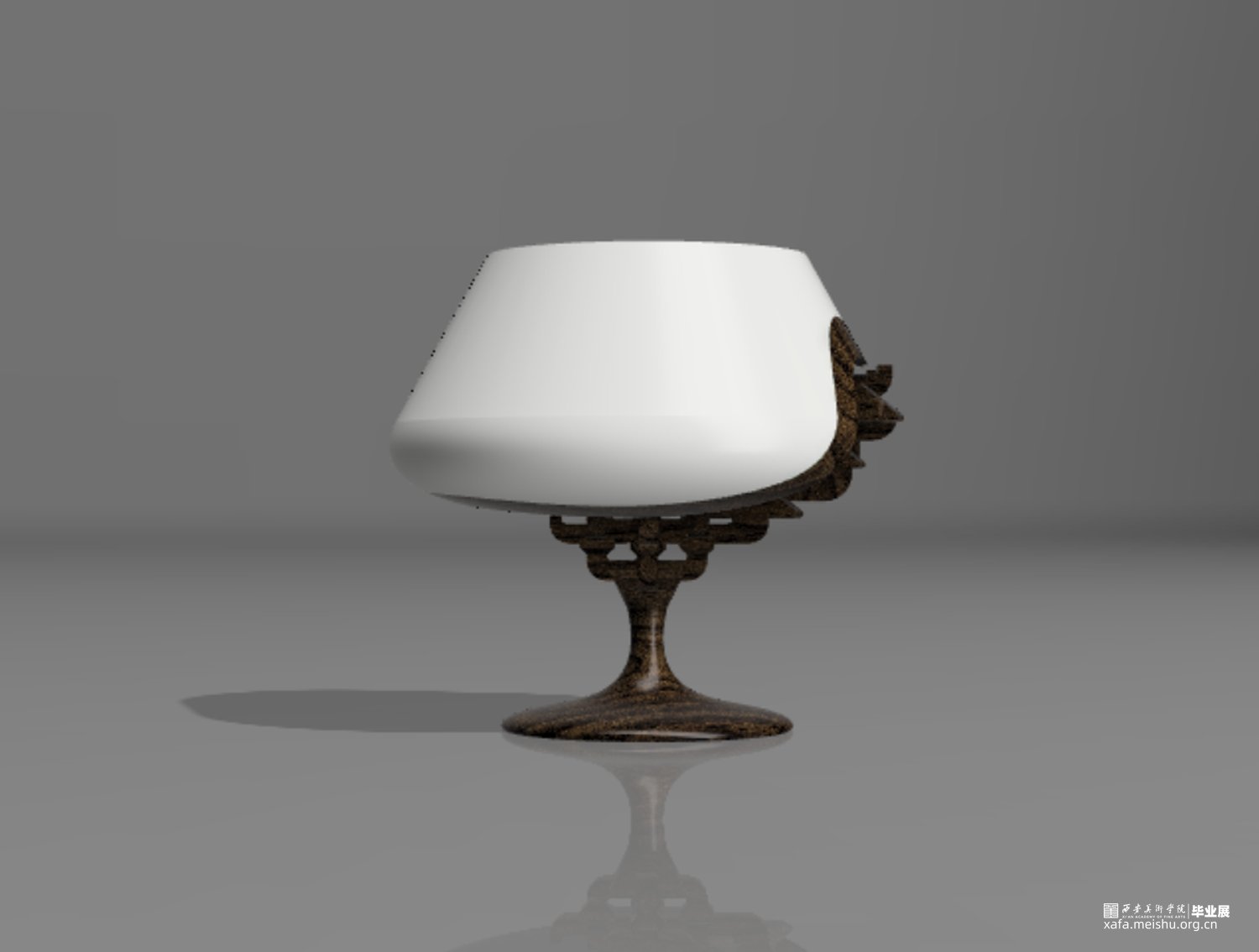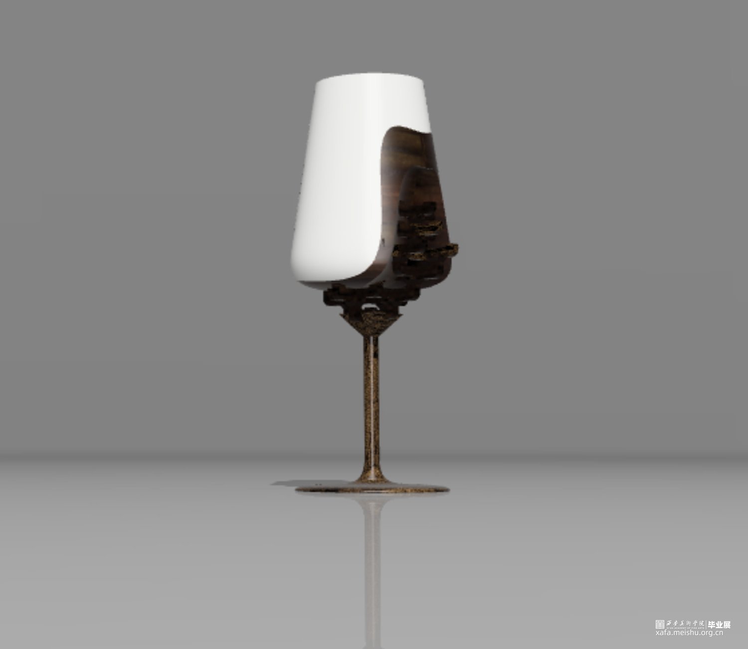 整件作品将斗拱与高足杯做了一个同构,用斗栱的形状替换了高足杯的下半部分,杯体使用陶瓷材质,杯足使用木材,在陶瓷与木材之间增加了过渡部分,表现出了一种内部结构被包裹隐藏起来的感觉。用榫卯结构的特点将上下两部分牢牢地结合在一起,斗栱在建筑中最重要的作用便是承重,因此我将这一特点也运用到了作品中,用斗栱结构来支撑起整个杯体的重量,使上半部分陶瓷的重量可以被各个结构分散,最终传到杯足上,斗栱的承重作用在这里得到了很好的体现,而斗栱特有的精美外形,也给作品增添了色彩,不再单调。