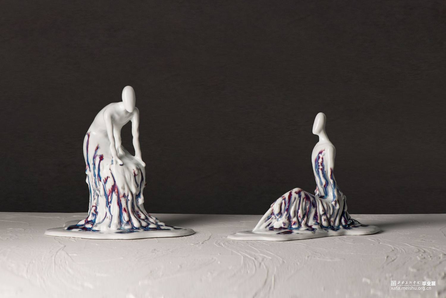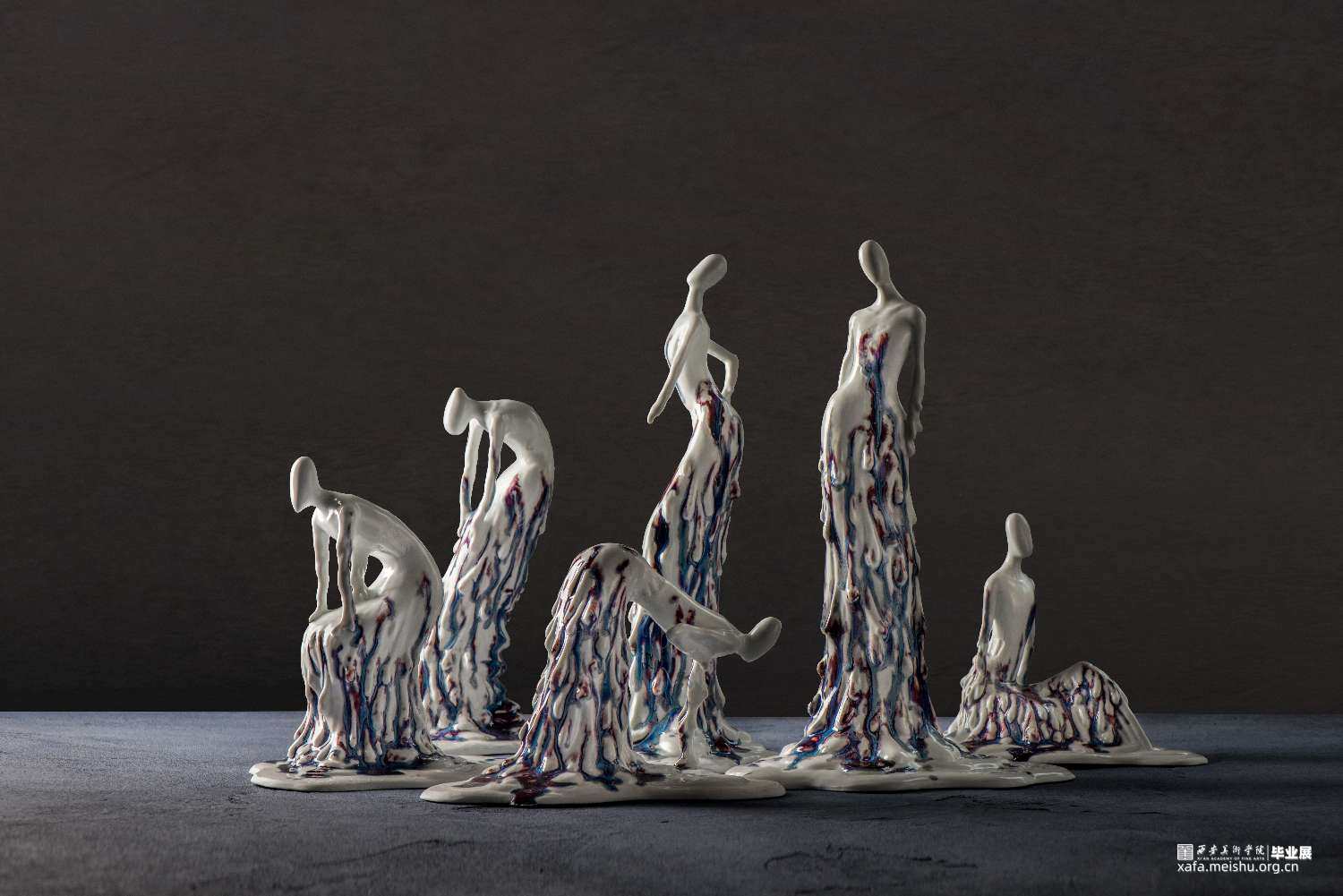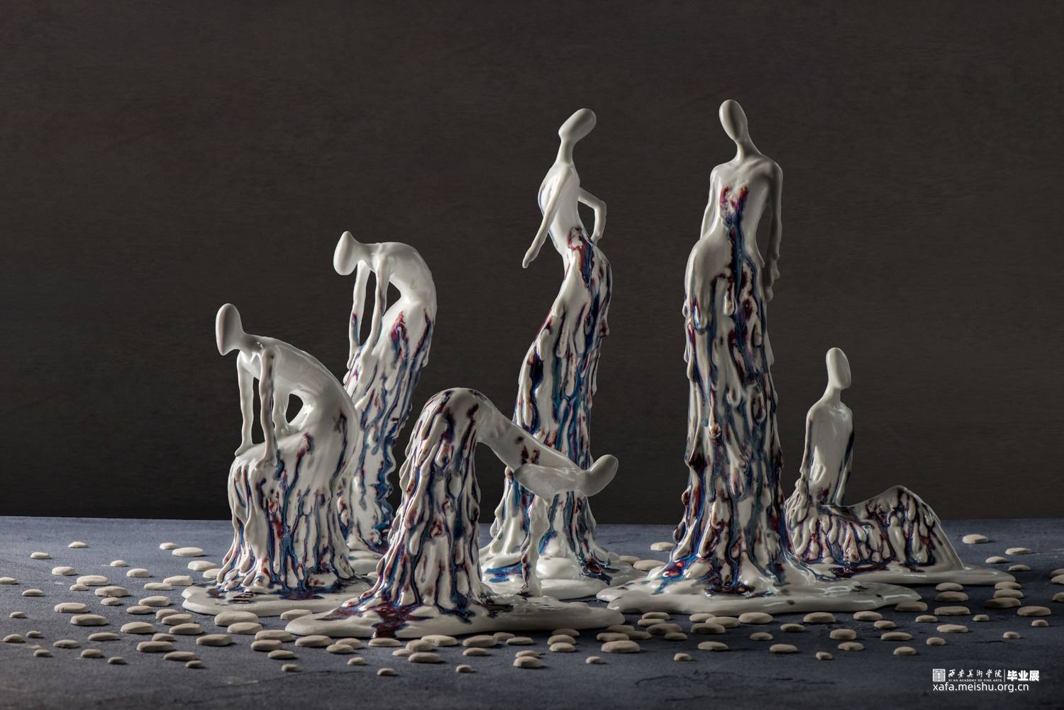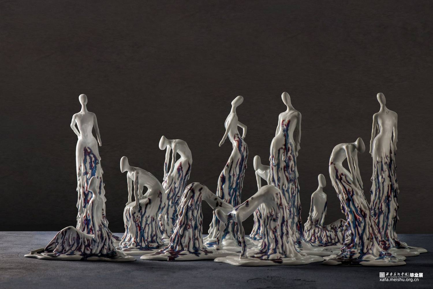 在《城》中,作者以抽象人物雕塑形态为主要研究方向,寻求不断加速的城市化进程与“人”之间的戏剧表达,作品的造型是“人”对“城市消耗”概念所做出的个性表达,同时在塑造单体上简化了形体的细节,选择了“无性人”为造型特征。体肤似蜡烛一般流淌、消耗,或无动于衷,或忸怩起舞,或无可奈何,有的“人”伤痕累累,这是城市的痕迹;有的“人”却早已融为城市,与之相伴相生。釉料上选取了陶瓷艺术釉料中的流动花釉,这种流光溢彩的釉料与蜡烛流淌相辅相成,体现生命的张力和变化莫测。2020年初,突如其来的新冠状病毒肺炎疫情打破了城市的平静,不安的情绪蔓延在城市的上空。这次疫情让人不禁思考,若没有封锁城市,这场灾难会蔓延到哪里,若无城市,又如何管理那分散而居的人们。因此城市的发展与城市的束缚是同为一体的,在人类社会发展过程中失去了什么?又得到了什么?值得人类深思。