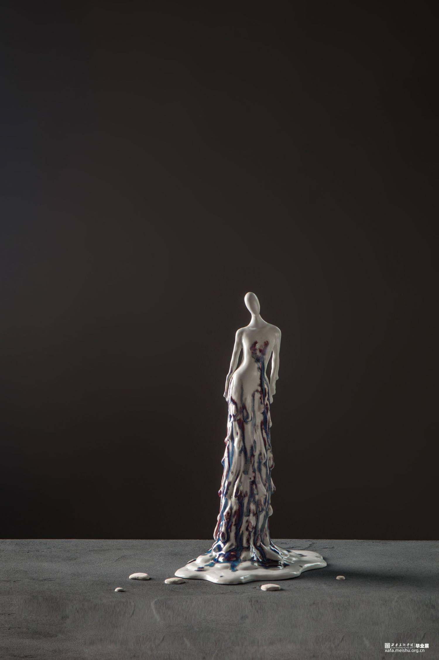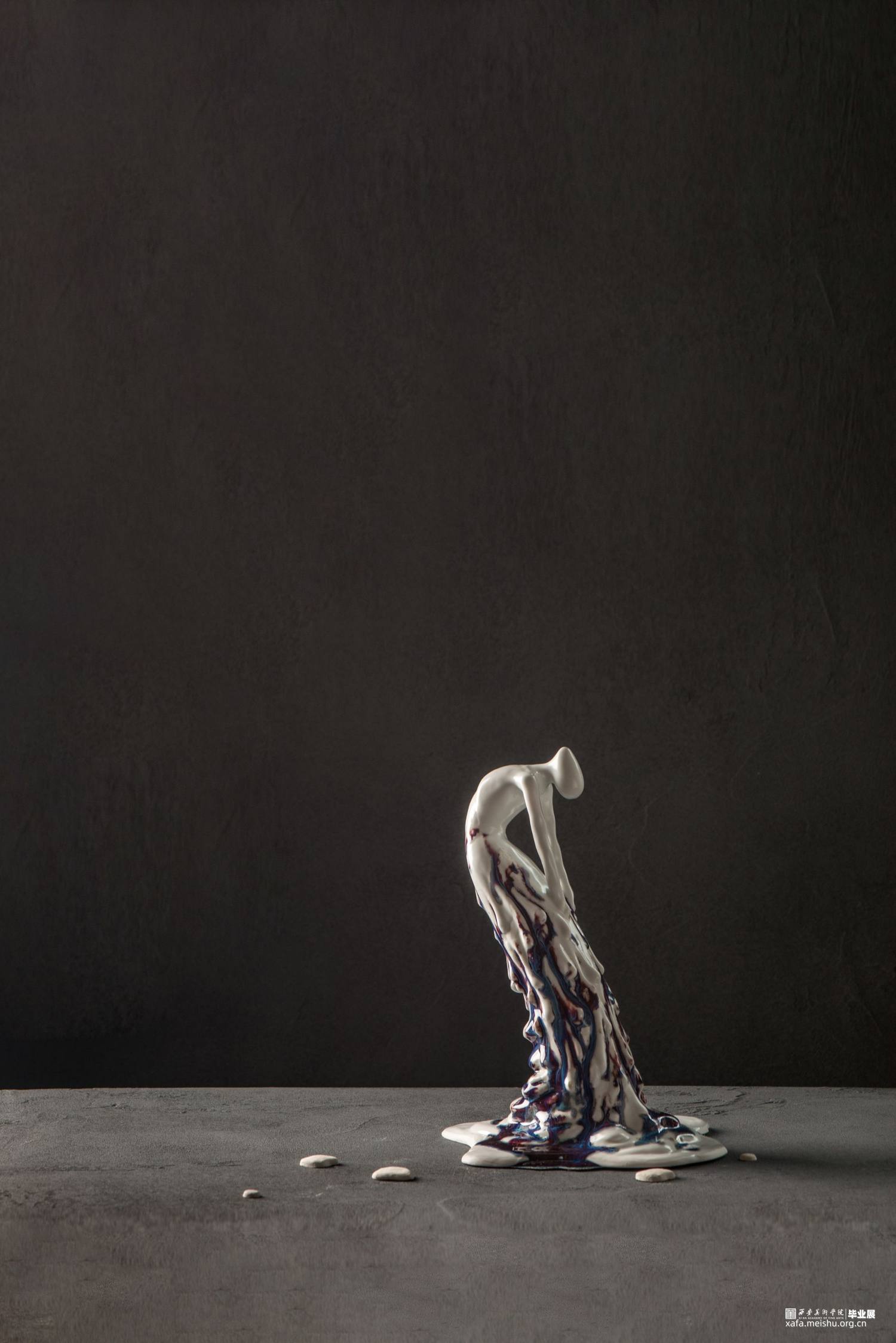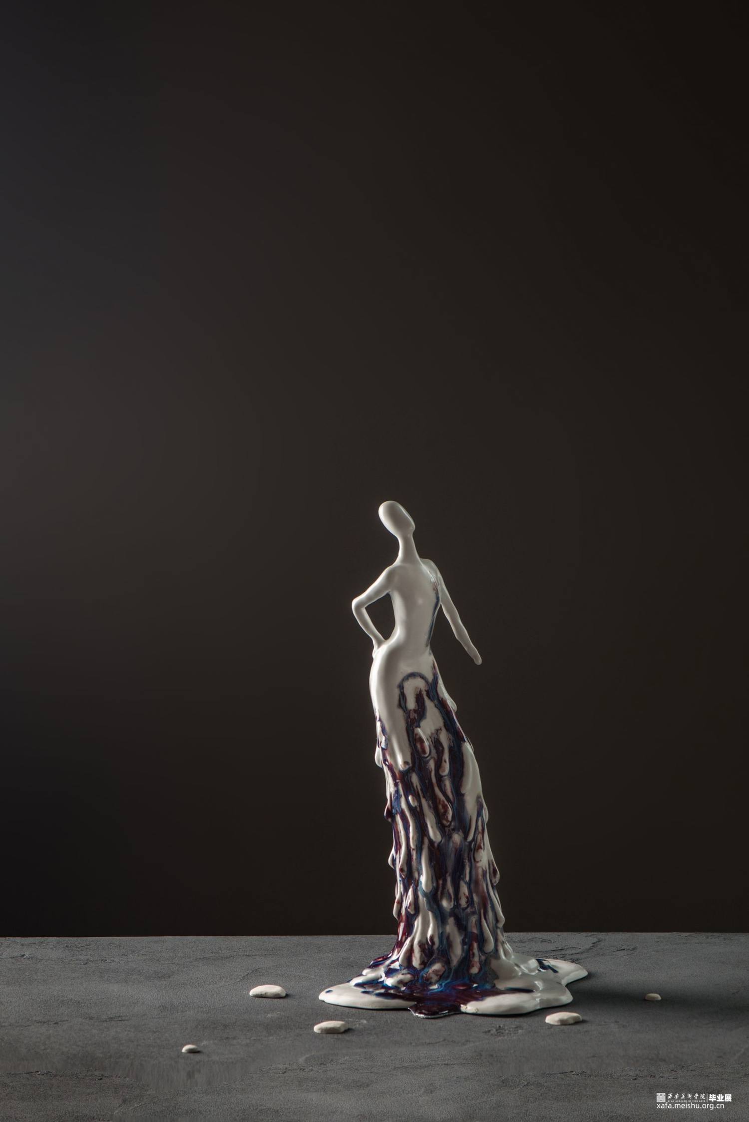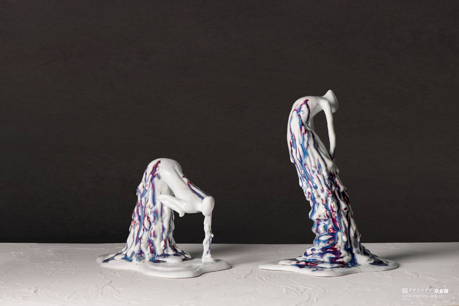 在《城》中,作者以抽象人物雕塑形态为主要研究方向,寻求不断加速的城市化进程与“人”之间的戏剧表达,作品的造型是“人”对“城市消耗”概念所做出的个性表达,同时在塑造单体上简化了形体的细节,选择了“无性人”为造型特征。体肤似蜡烛一般流淌、消耗,或无动于衷,或忸怩起舞,或无可奈何,有的“人”伤痕累累,这是城市的痕迹;有的“人”却早已融为城市,与之相伴相生。釉料上选取了陶瓷艺术釉料中的流动花釉,这种流光溢彩的釉料与蜡烛流淌相辅相成,体现生命的张力和变化莫测。2020年初,突如其来的新冠状病毒肺炎疫情打破了城市的平静,不安的情绪蔓延在城市的上空。这次疫情让人不禁思考,若没有封锁城市,这场灾难会蔓延到哪里,若无城市,又如何管理那分散而居的人们。因此城市的发展与城市的束缚是同为一体的,在人类社会发展过程中失去了什么?又得到了什么?值得人类深思。