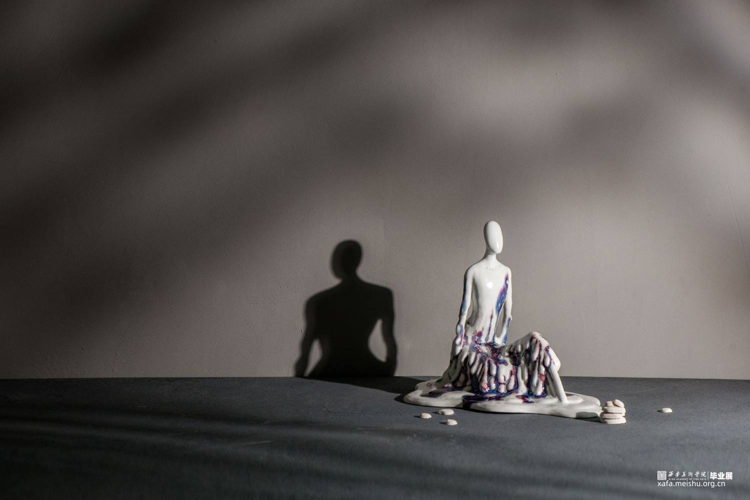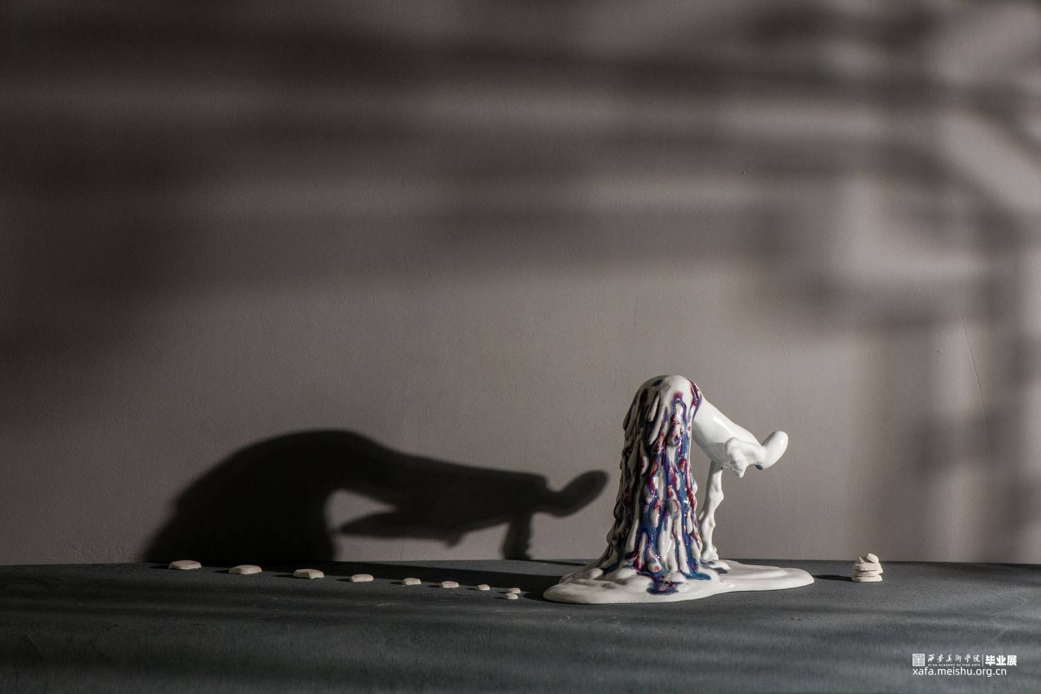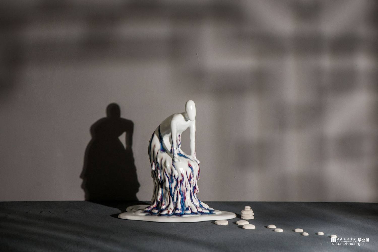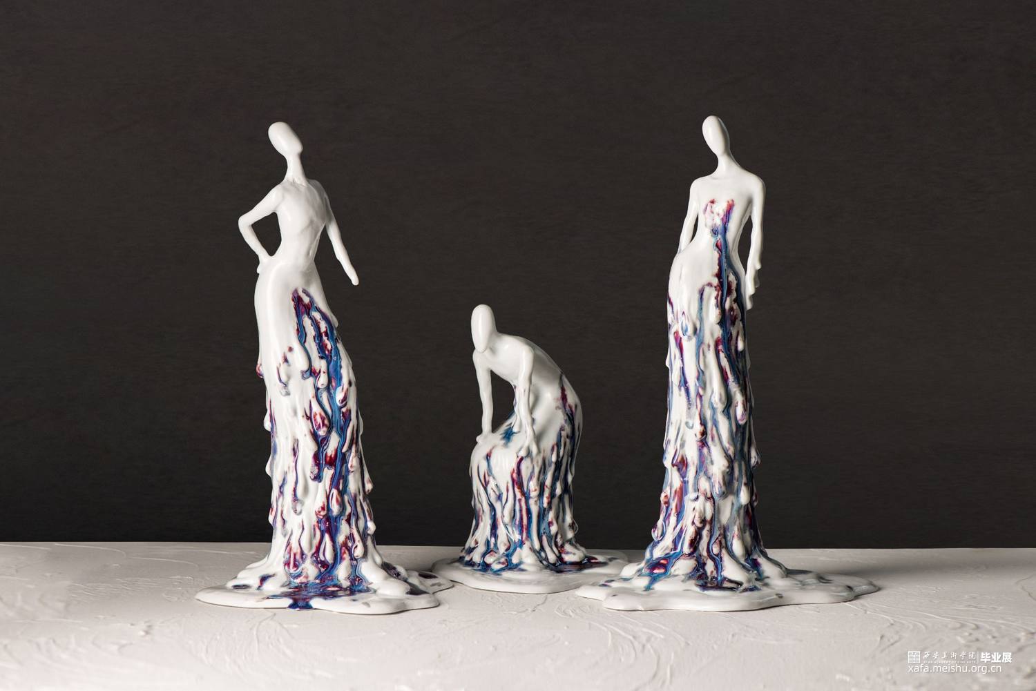 在《城》中,作者以抽象人物雕塑形态为主要研究方向,寻求不断加速的城市化进程与“人”之间的戏剧表达,作品的造型是“人”对“城市消耗”概念所做出的个性表达,同时在塑造单体上简化了形体的细节,选择了“无性人”为造型特征。体肤似蜡烛一般流淌、消耗,或无动于衷,或忸怩起舞,或无可奈何,有的“人”伤痕累累,这是城市的痕迹;有的“人”却早已融为城市,与之相伴相生。釉料上选取了陶瓷艺术釉料中的流动花釉,这种流光溢彩的釉料与蜡烛流淌相辅相成,体现生命的张力和变化莫测。2020年初,突如其来的新冠状病毒肺炎疫情打破了城市的平静,不安的情绪蔓延在城市的上空。这次疫情让人不禁思考,若没有封锁城市,这场灾难会蔓延到哪里,若无城市,又如何管理那分散而居的人们。因此城市的发展与城市的束缚是同为一体的,在人类社会发展过程中失去了什么?又得到了什么?值得人类深思。
