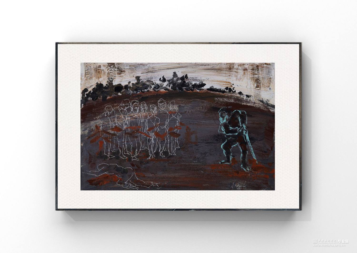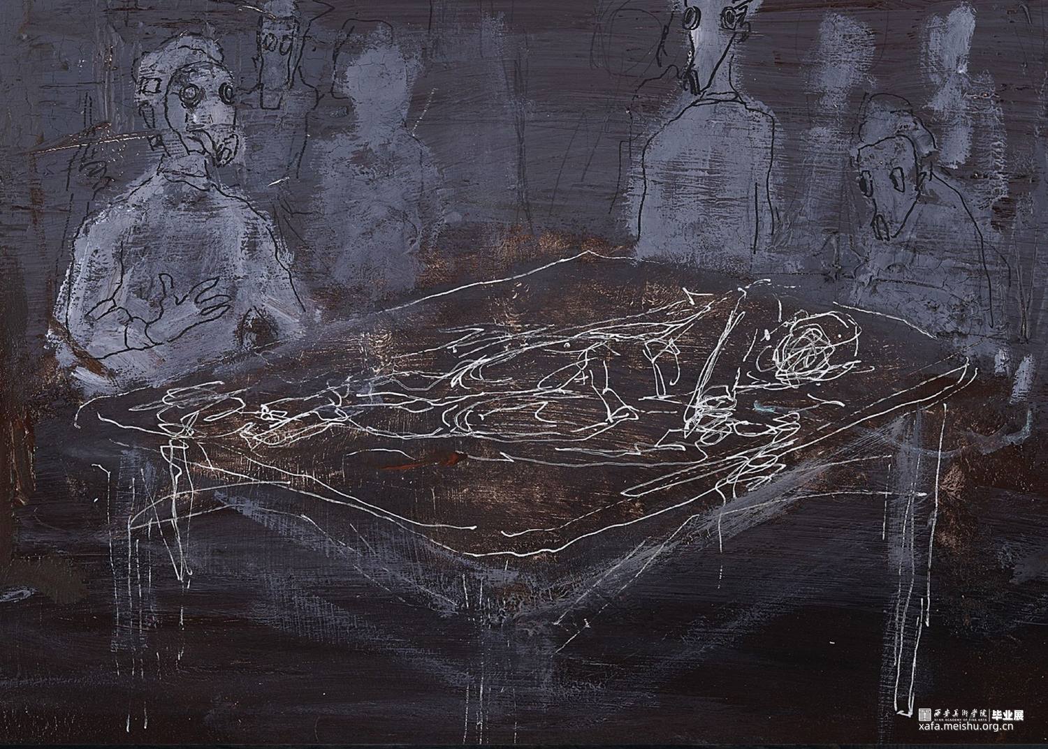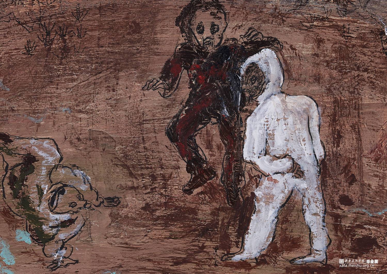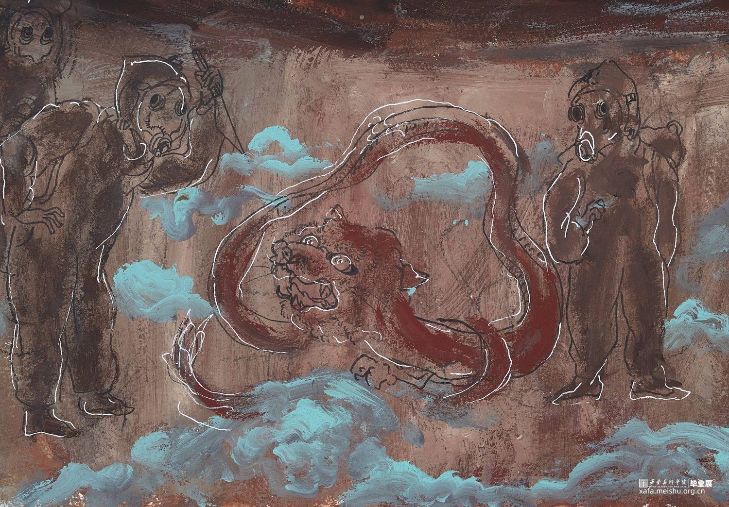 以杜布菲、基弗、塔皮埃斯等画家的艺术语言为启发,采用丙烯,水彩等综合材料进行故事创作。