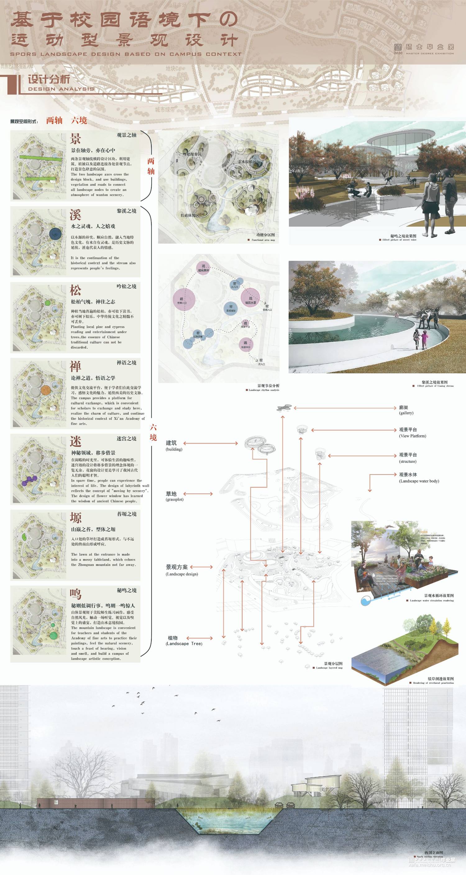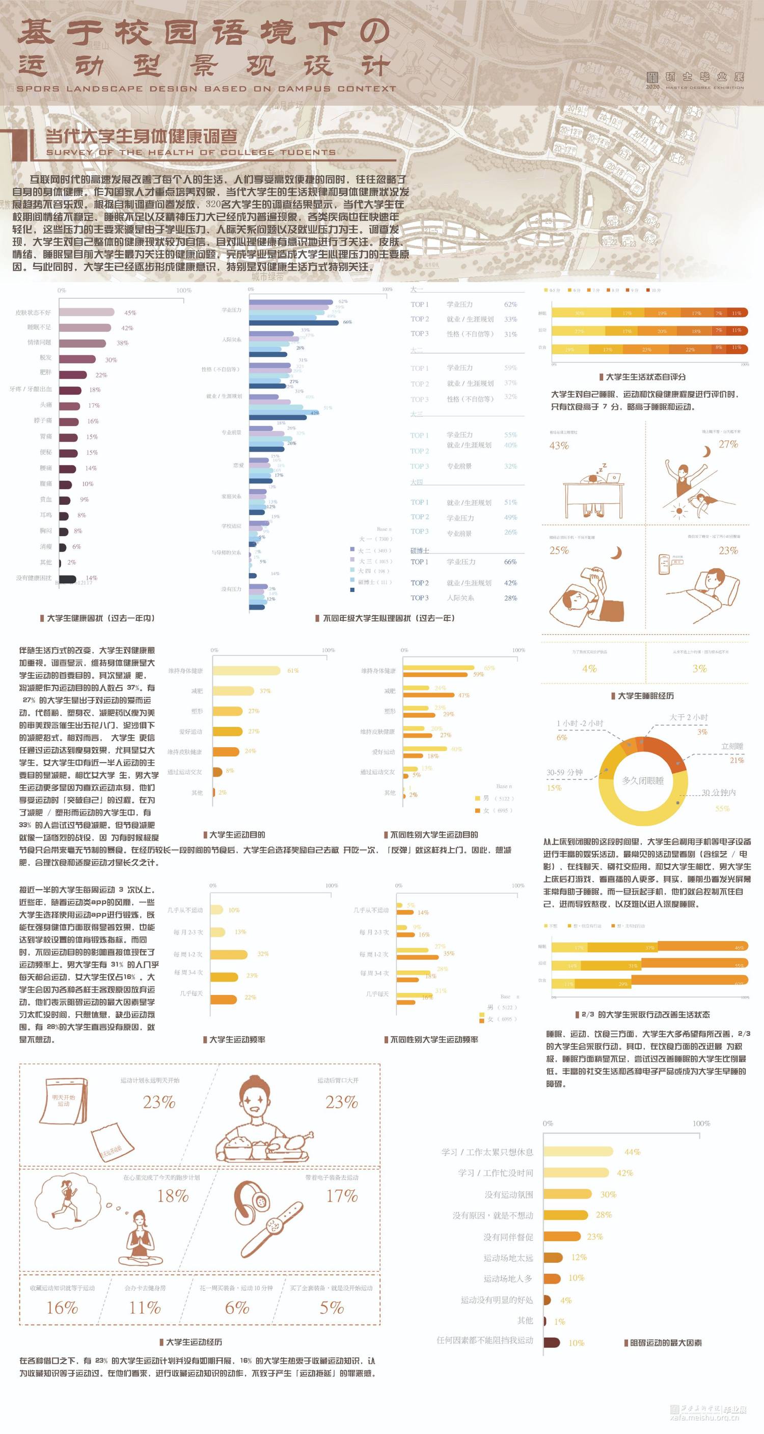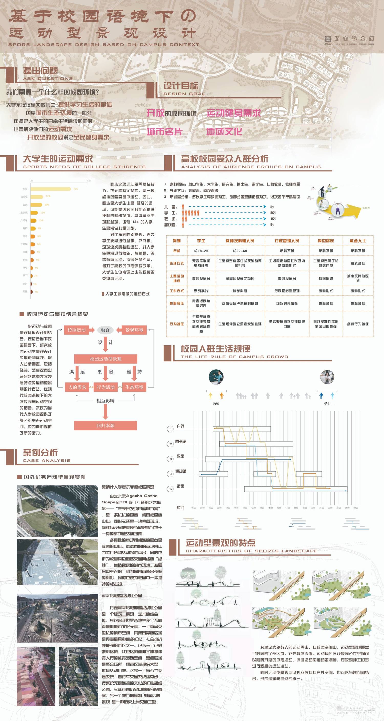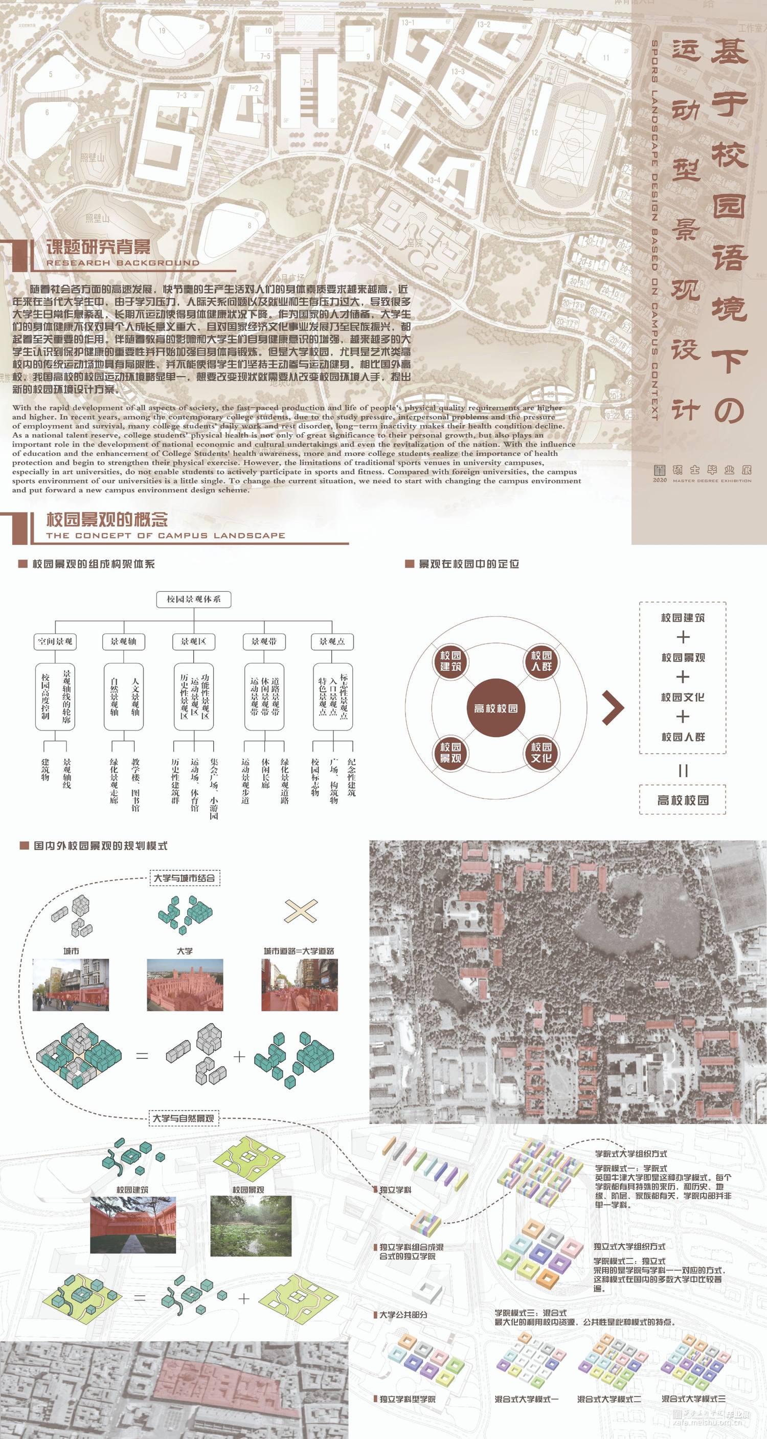 调查发现,当今大学生有近74%从不进行日常的运动锻炼,很多学生没有运动的意识,这与学生个人原因相关外,也和校园环境有着很大的关系。因此,为了提高大学生的运动意识,改善校园环境的需求,校园内需要有运动型景观的存在。本次研究将结合大学生体育运动和校园景观环境,研究大学生的行为活动、校园运动景观之间的关系,研究出一套适合在高校校园内存在的运动型景观。为了提高大学生的运动意识,改善校园环境的需求,校园内需要有运动型景观的存在。本次研究将结合大学生体育运动和校园景观环境,研究大学生的行为活动、校园运动景观之间的关系,研究出一套适合在高校校园内存在的运动型景观。本次创作以西安美院长安新校区的整体规划为基础,融入西美文化特色,结合大学生的运动使用需求,并参考国内外优秀案例进行创作。