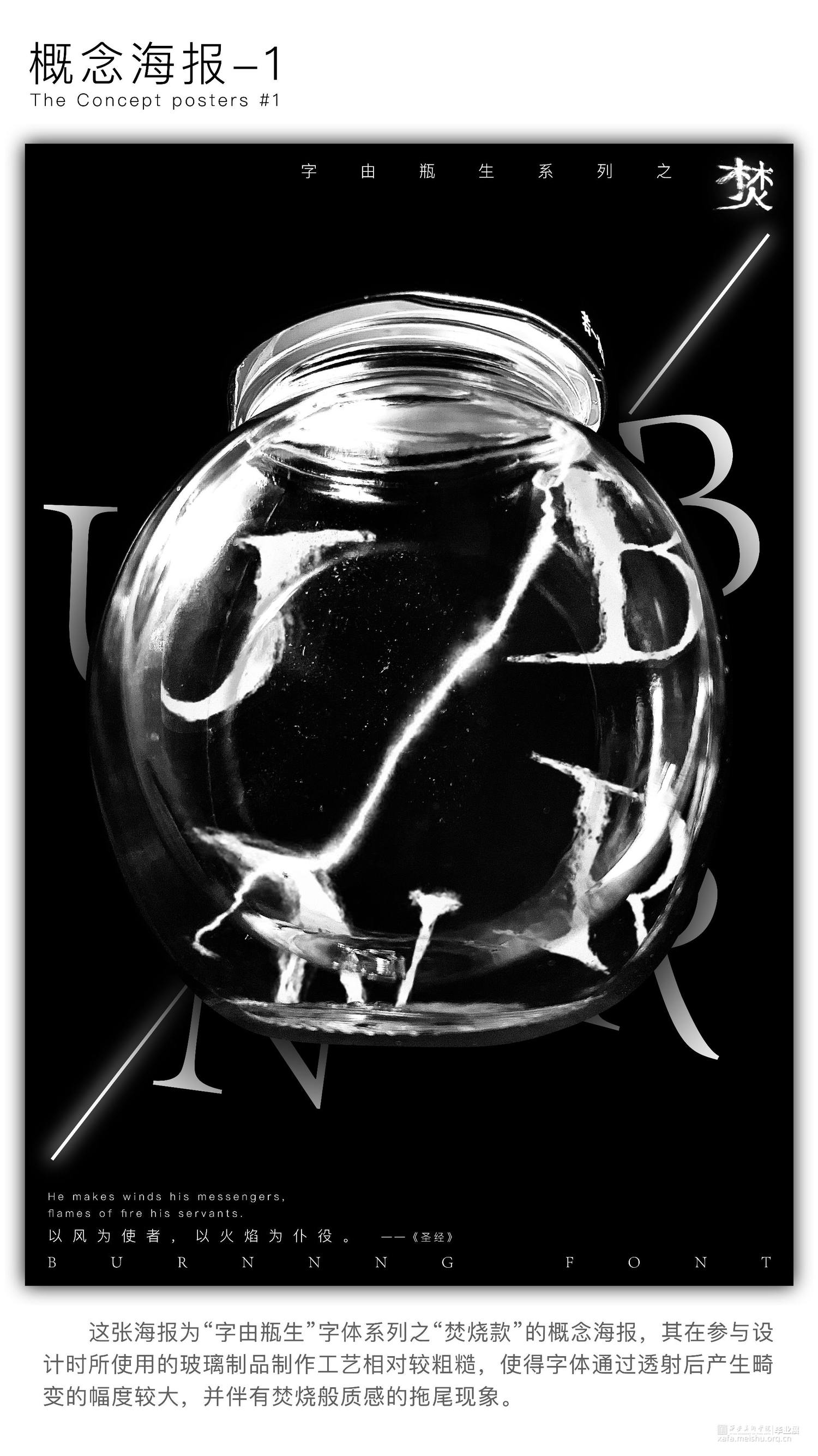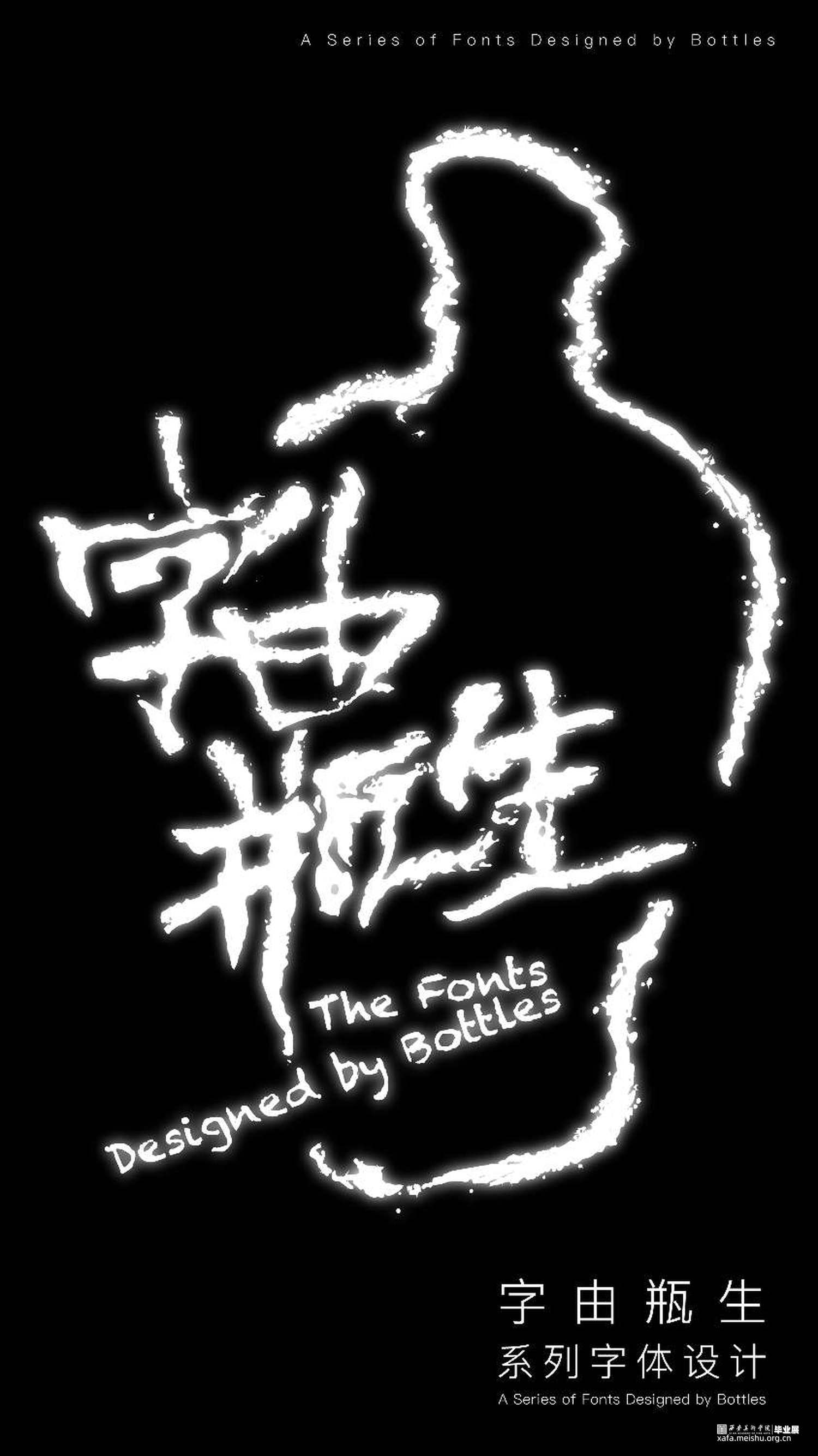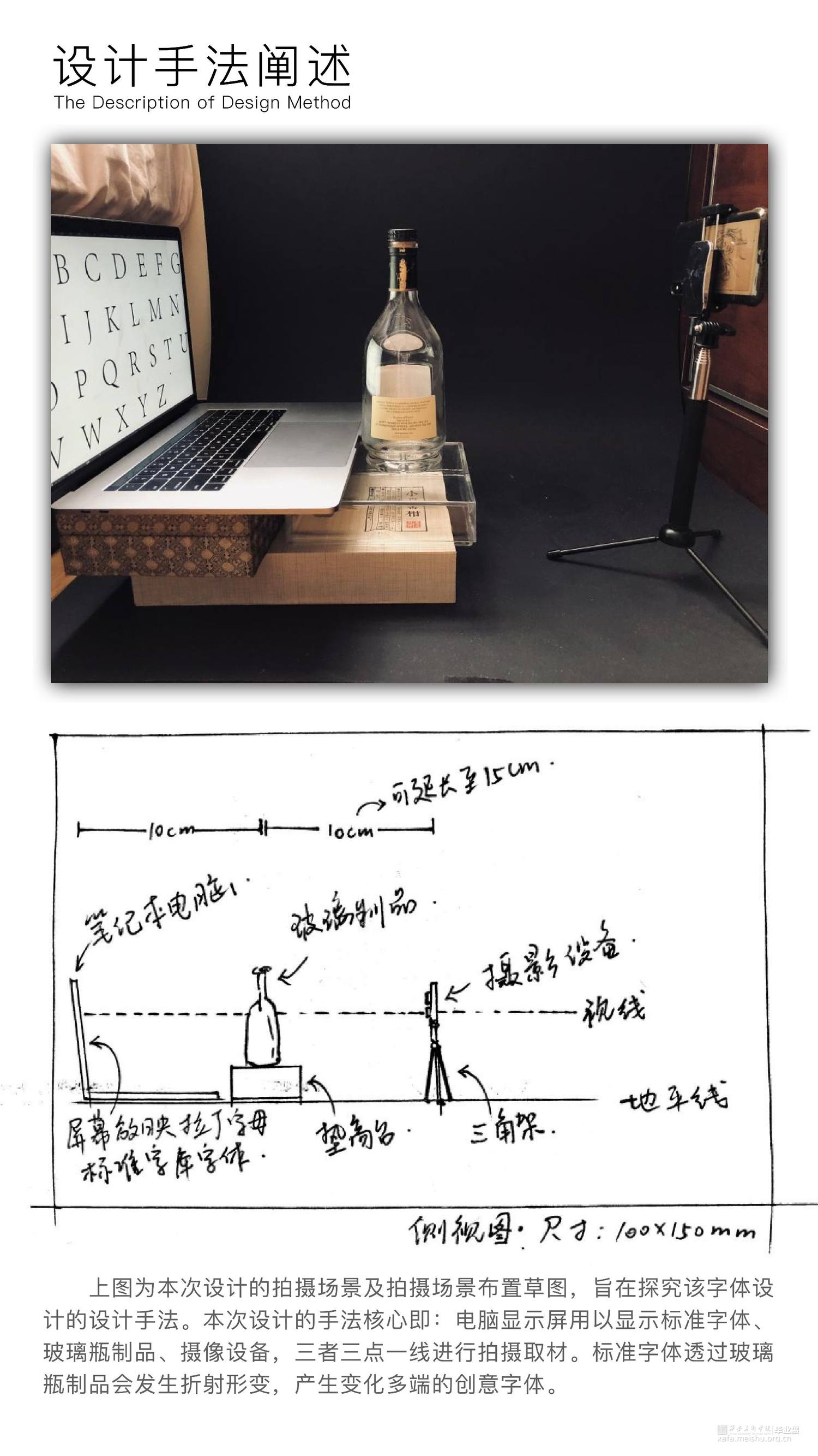 本次作品利用玻璃质地的瓶子进行设计,由于部分玻璃制品外观起伏不定,所以由于折射原理,当透过玻璃瓶看事物时,会产生一定程度的畸变。但当我们用这些玻璃瓶对着一个字体看去时,全新的创意字体将由这些普通的瓶子诞生。