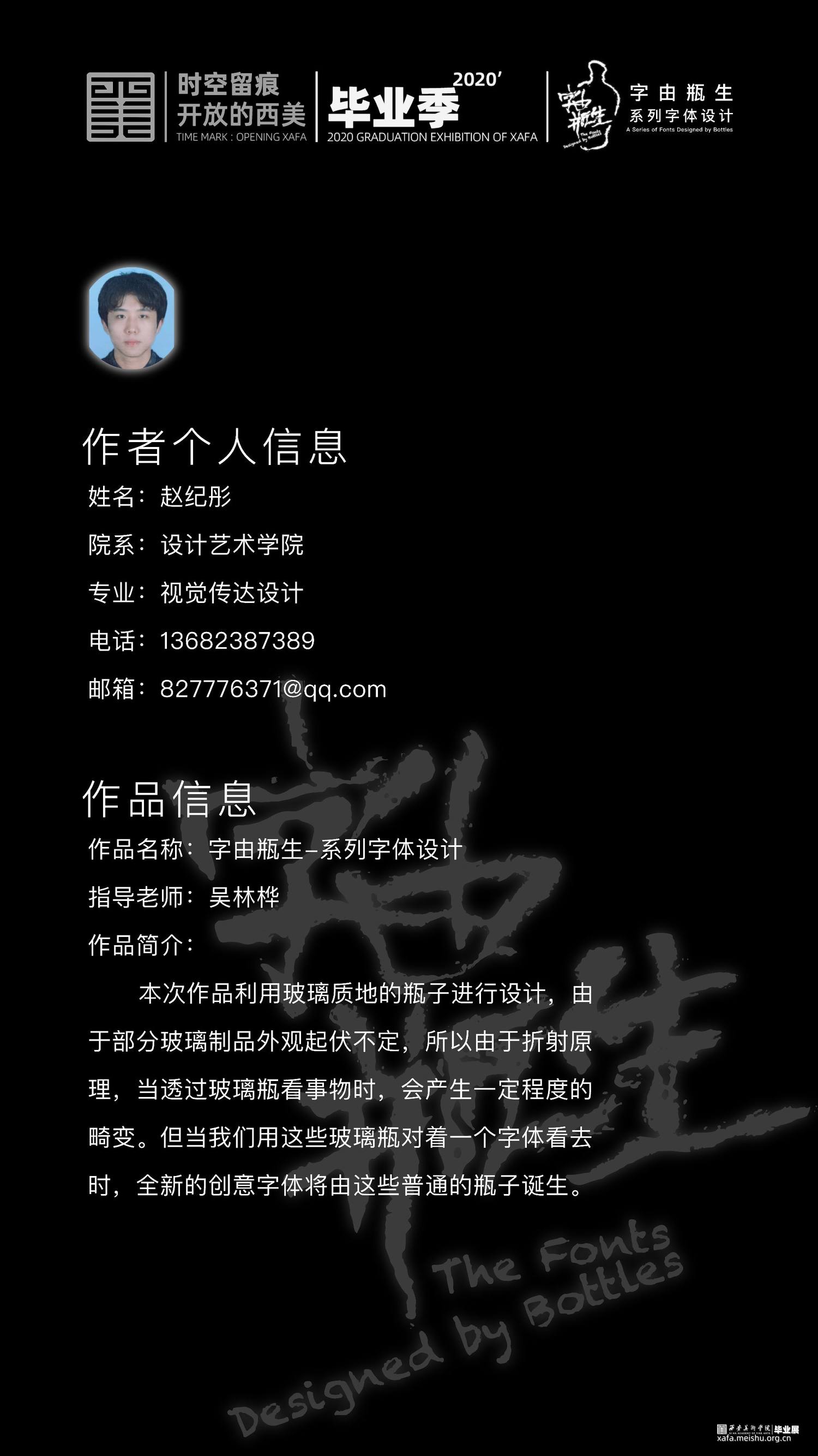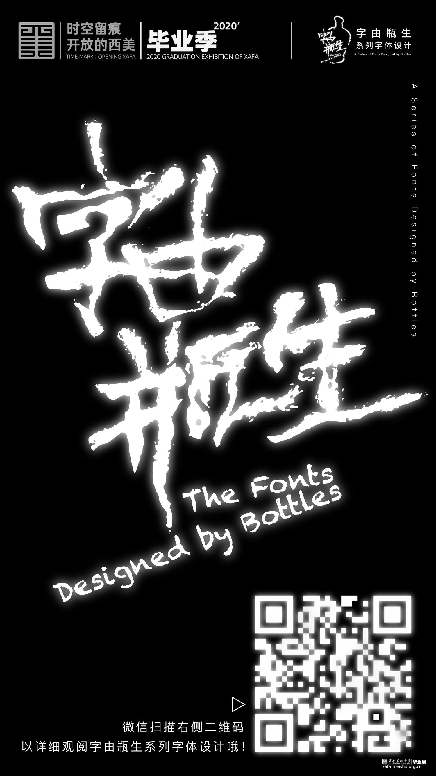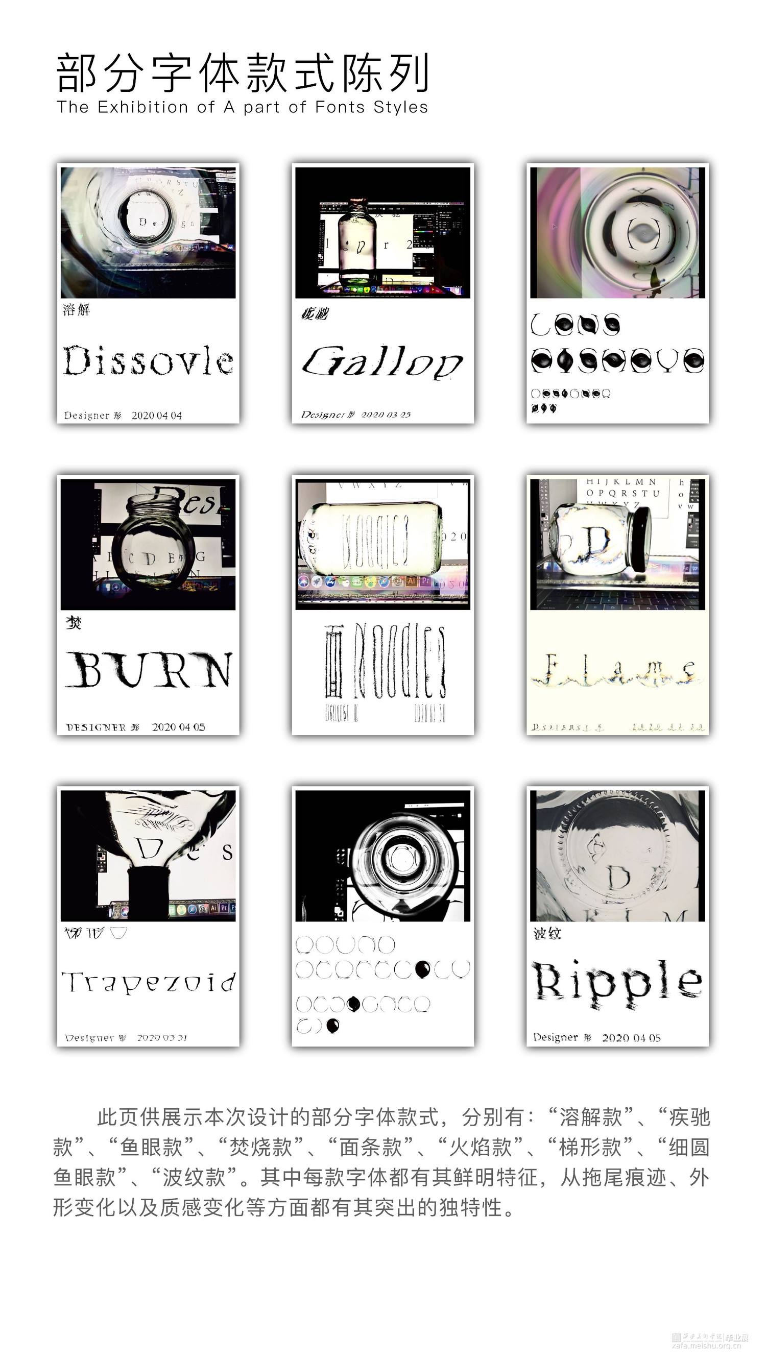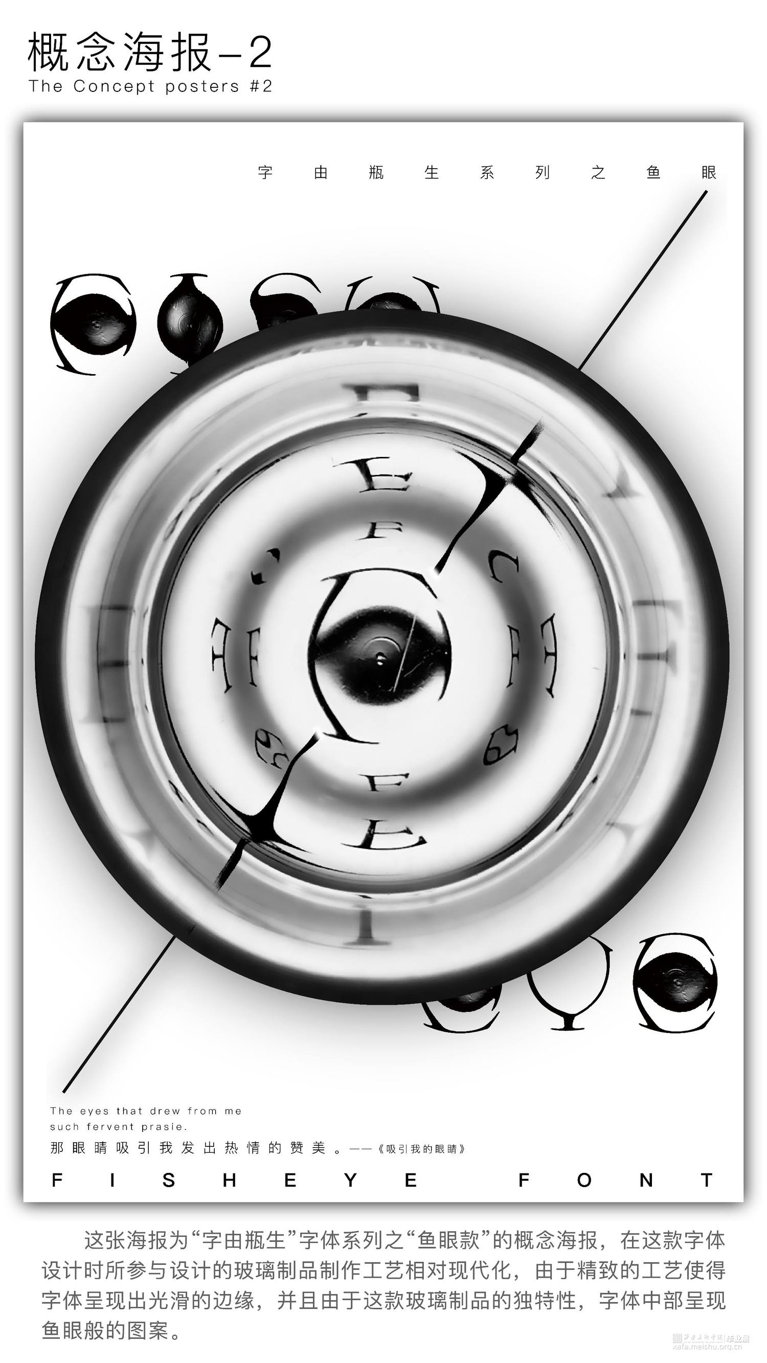 本次作品利用玻璃质地的瓶子进行设计,由于部分玻璃制品外观起伏不定,所以由于折射原理,当透过玻璃瓶看事物时,会产生一定程度的畸变。但当我们用这些玻璃瓶对着一个字体看去时,全新的创意字体将由这些普通的瓶子诞生。