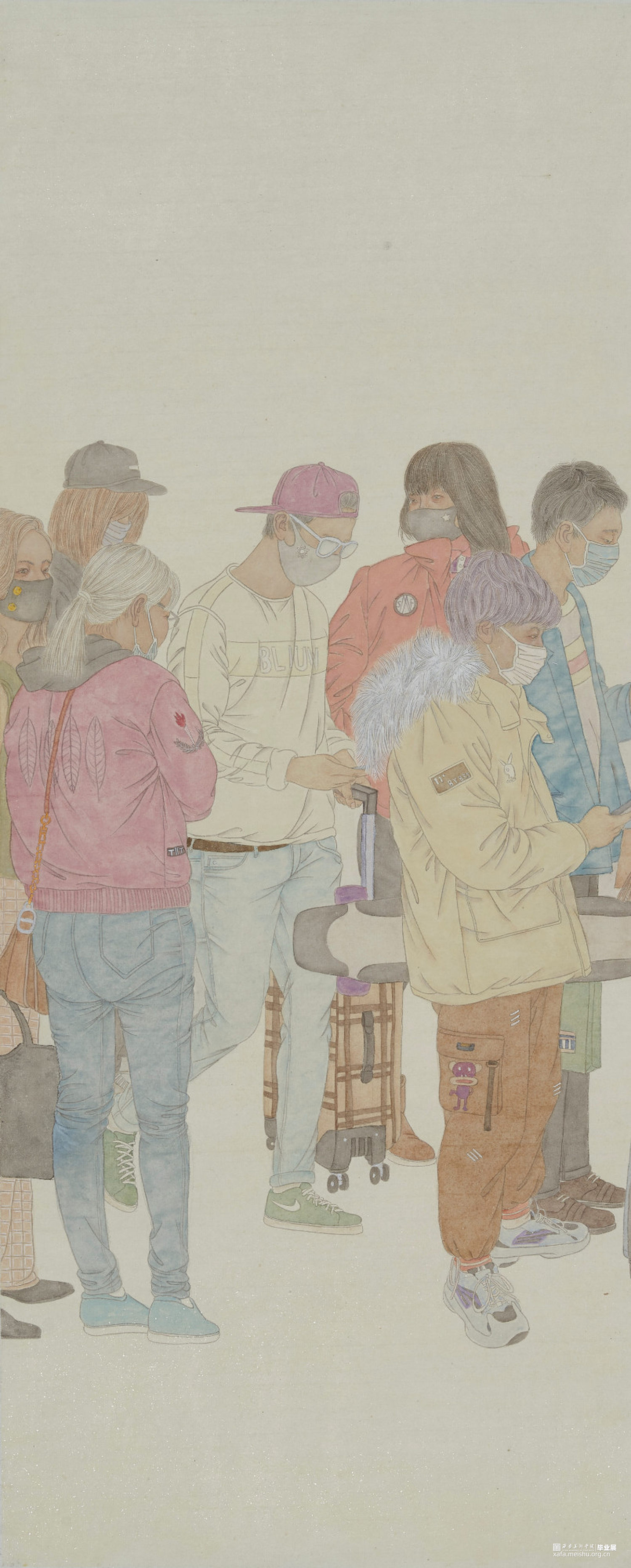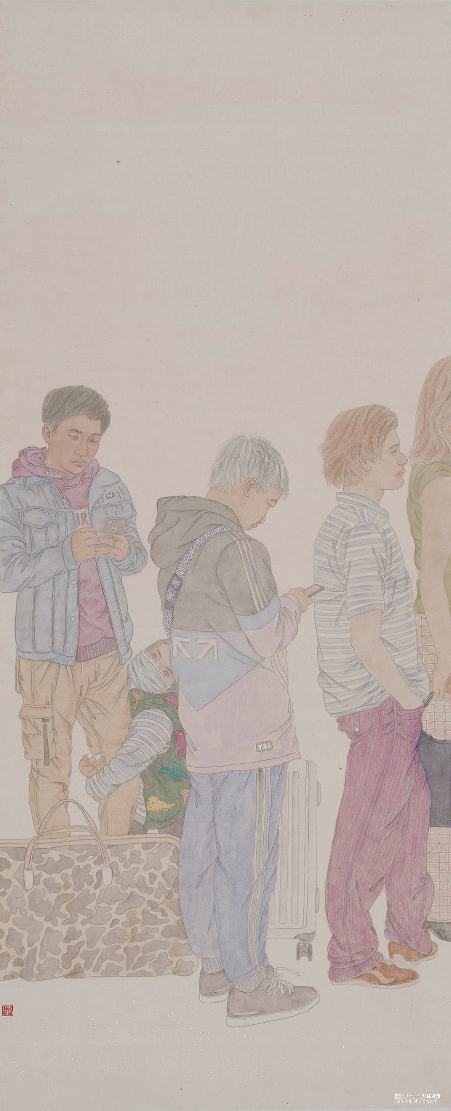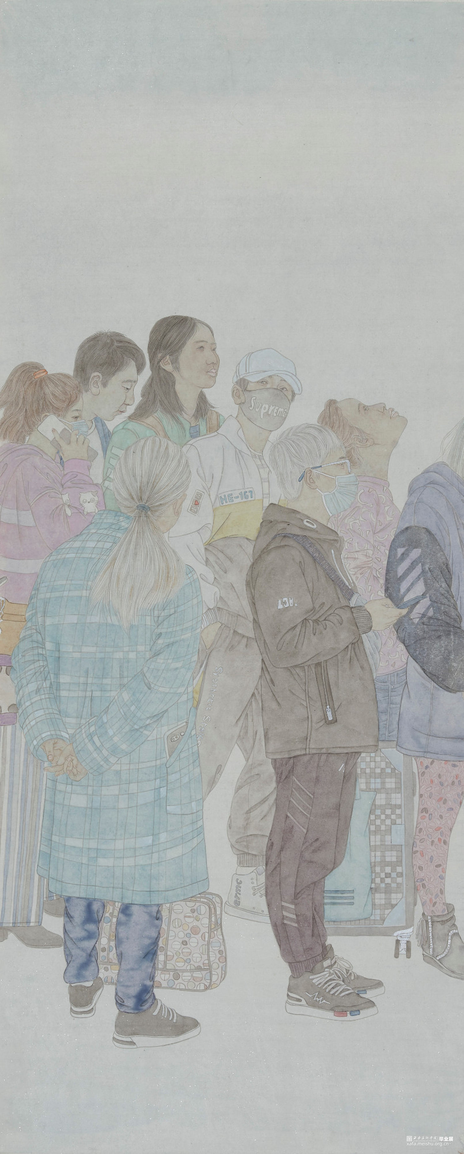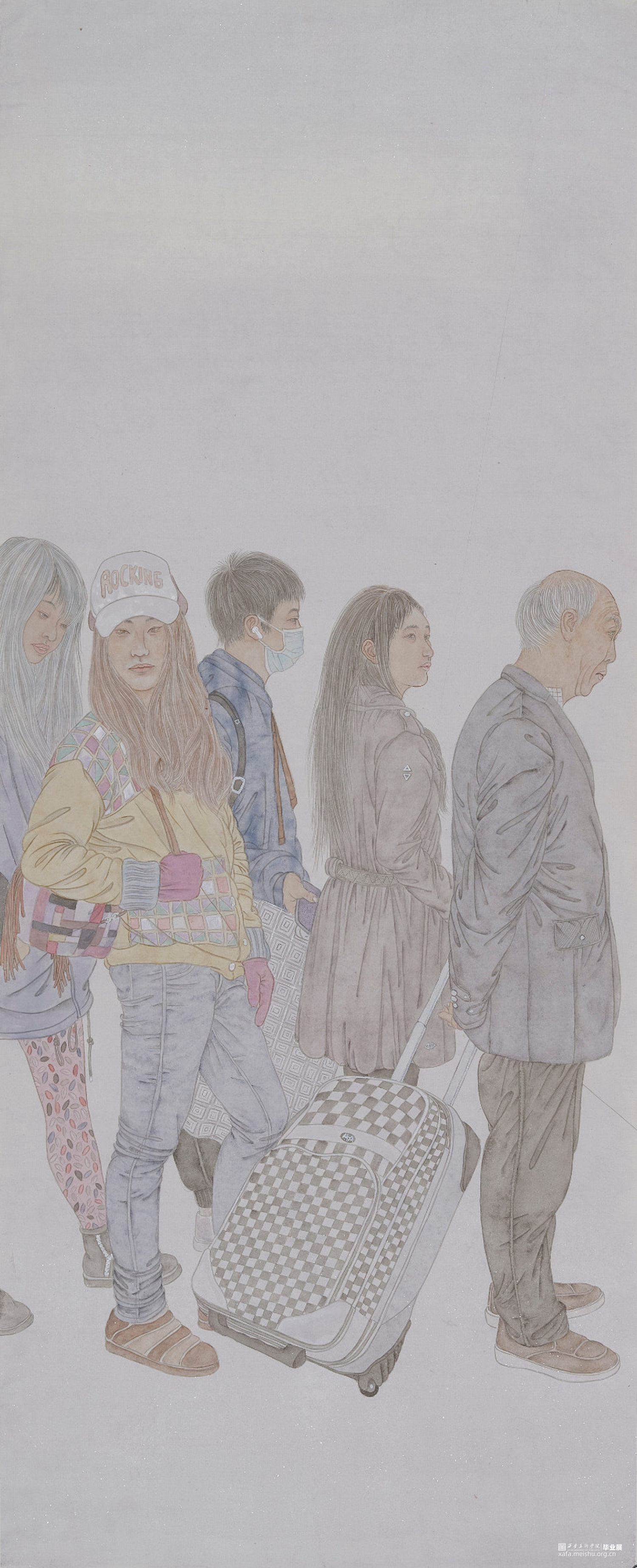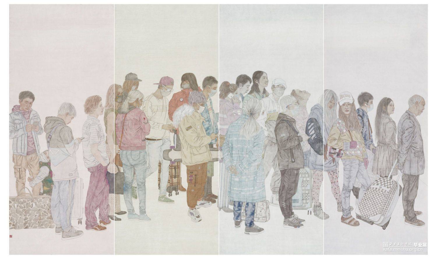 作品呈现出的是一种无头无尾,仿佛是循环往复的四季中的一个片段,一个接一个的人在不停前行着,但确是实实在在的静谧不动,在这种静中有动,动中有静中,突出行和止这对矛盾。而空虚的精神世界和背景与真实的人也体现出虚和实的对比。