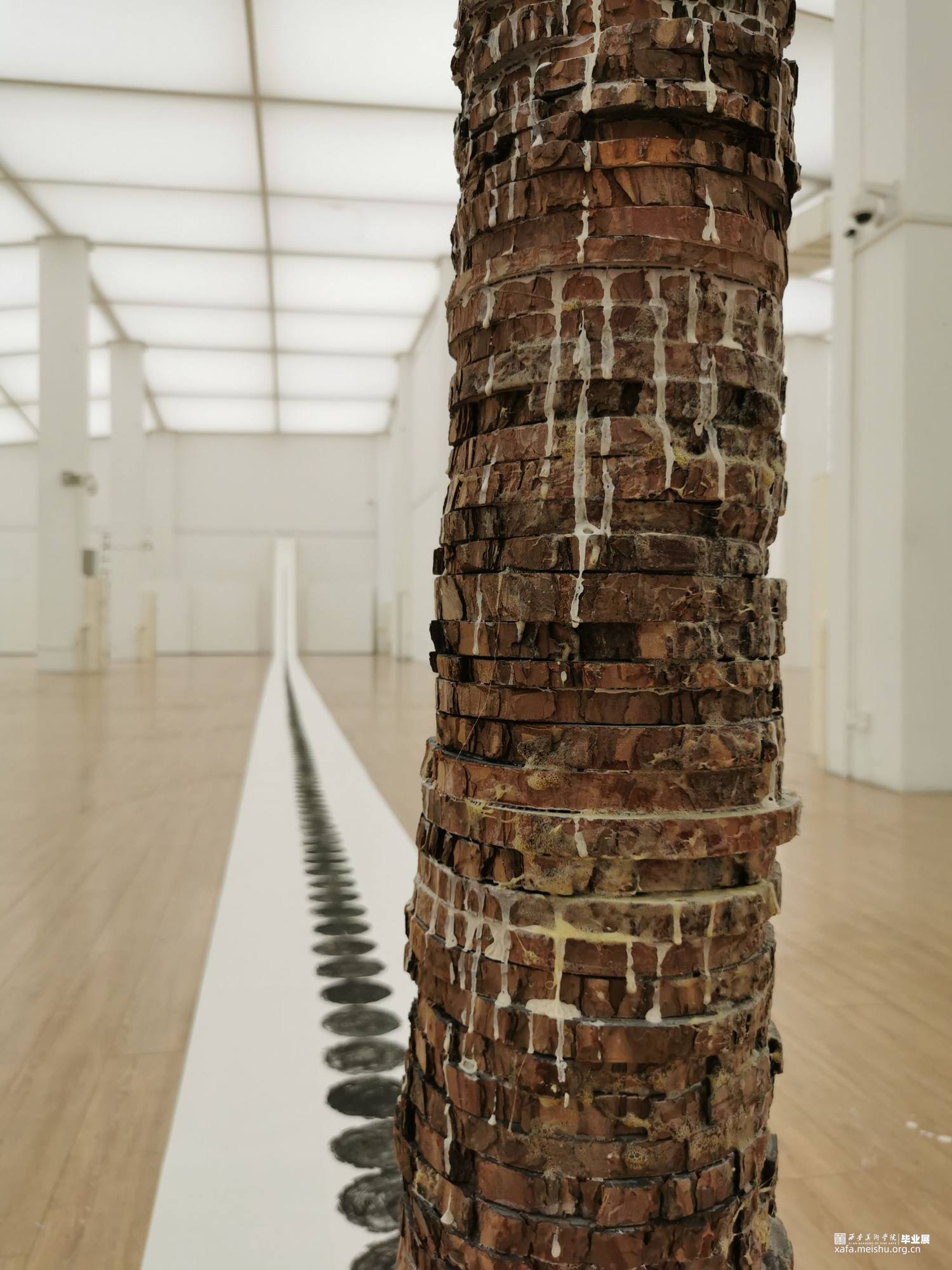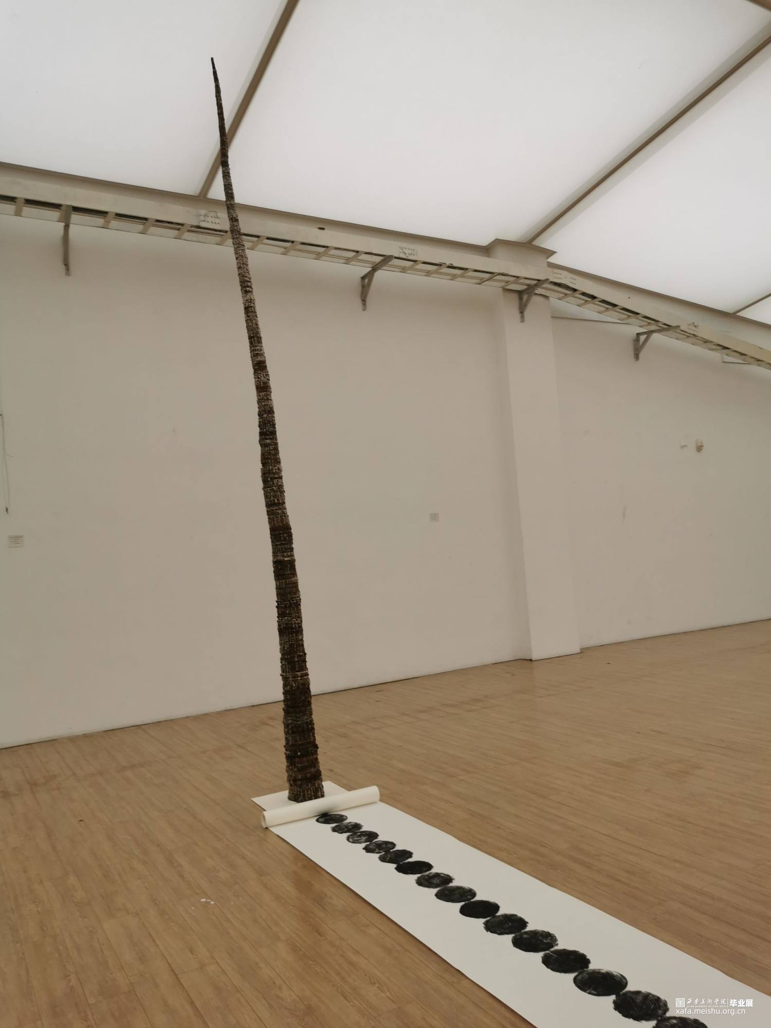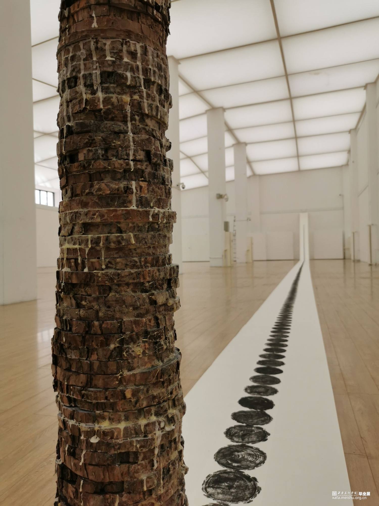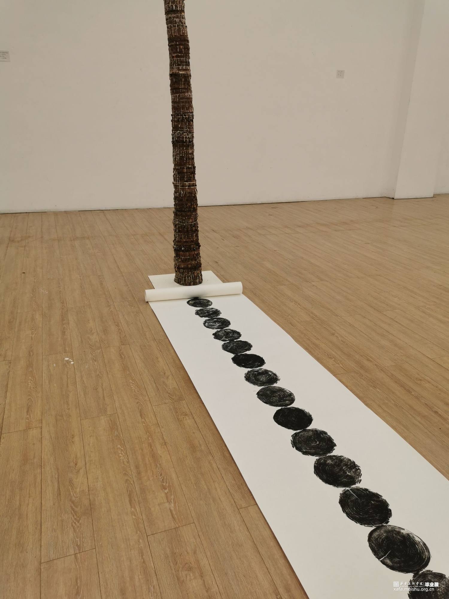 《一棵树》是一棵竹的延续作品,是我从全国各地买的四百多块大小不一的松木木口,然后再按从大到小,标上数字排列后一一印出来的,最后我再用白乳胶把印刷过的木口一个个的粘成了“一棵松树”。这个时候的一棵树是一棵树,但也不是一棵树了,不过不管一棵树还是不是一棵树,此时的前者一棵竹也许不再是一棵竹。真做假时假亦真,假做真时真亦假。