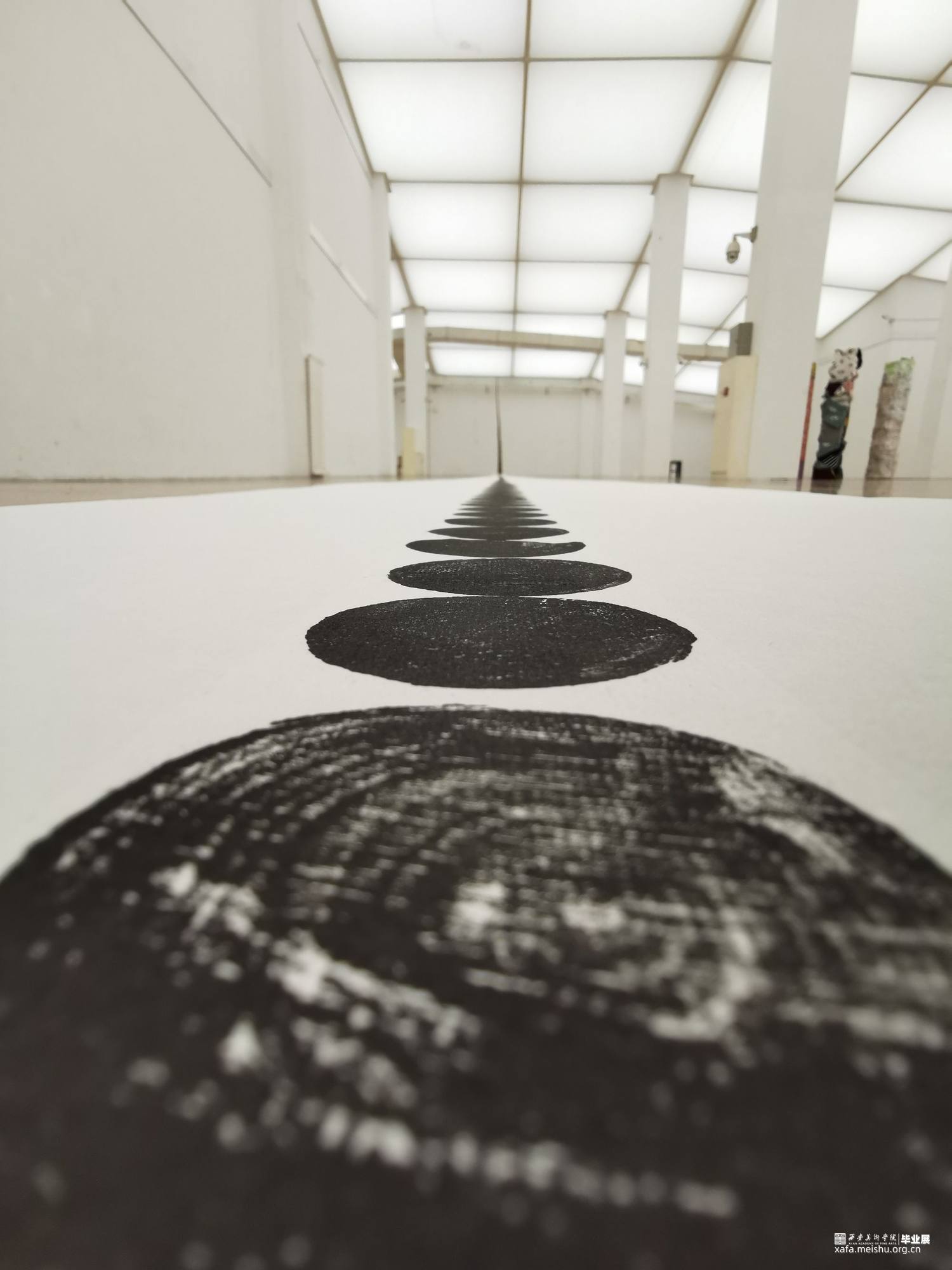 《一棵树》是我从全国各地买的四百多块大小不一的松木木口,然后再按从大到小标上数字排列后一一印出来的,最后,我再用白乳胶把印刷过的木口一个个的粘成了“一棵松树”。