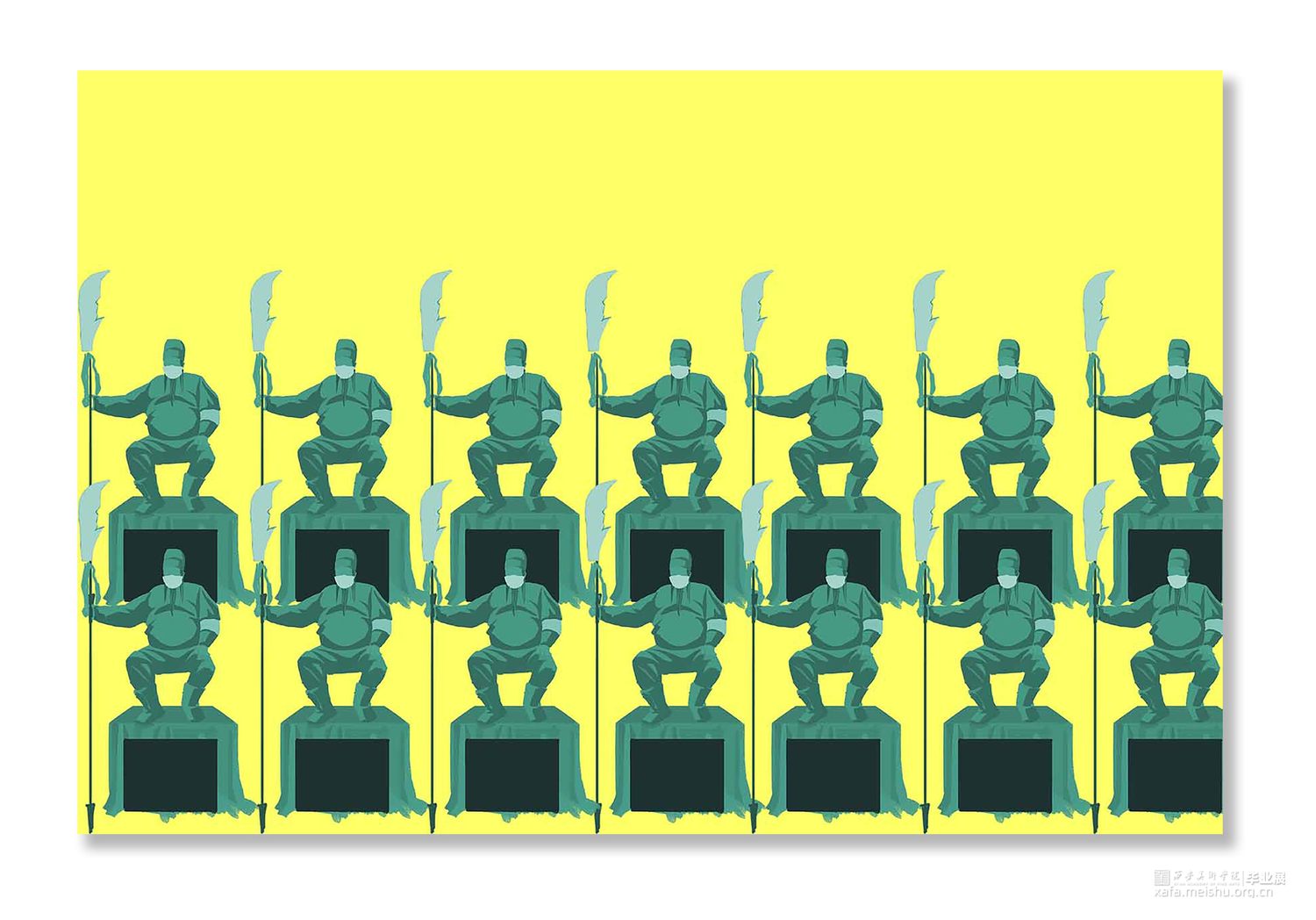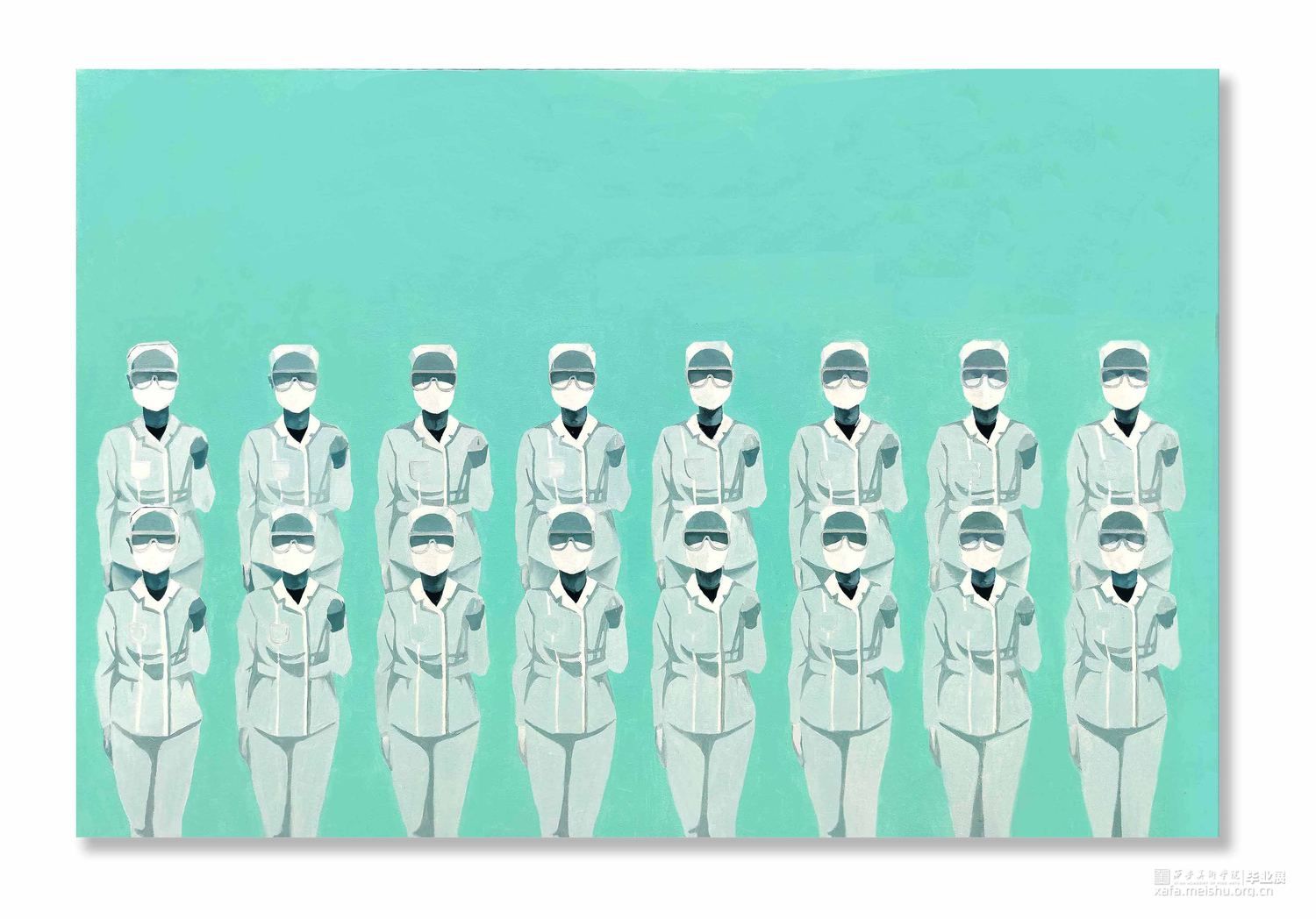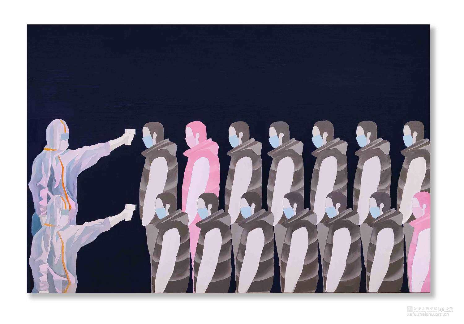 疫情的出现将人们囚禁在家中,整个社会看起来像一个大大的囚笼。每一个社区就像一所监狱,进出限制严格看守。我将每个人都格式化,重复复制排列,再加上纯色的背景,从画面上表达一种人人自危,无暇顾及其他的感觉。偶有一两个人或颜色或位置不一样,代表着群体中那些利己主义者。三幅画记录了疫情初期最令人印象深刻的三件事,护士出征,居家隔离,量体温。我还记被体温枪指着忐忑不安的感觉,护士们害怕的成了战士崩溃的奋斗在一线,外地人员隔离完整的封条成了他们自证清白的证明。画是我对疫情的记录,也是设身处地的感受,沉重,诡异,荒诞充斥