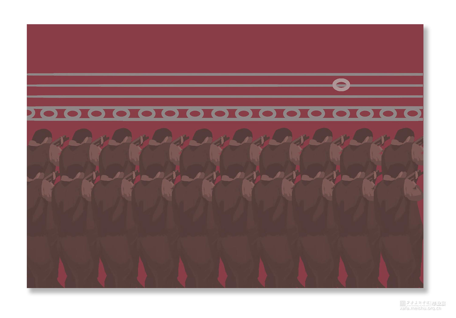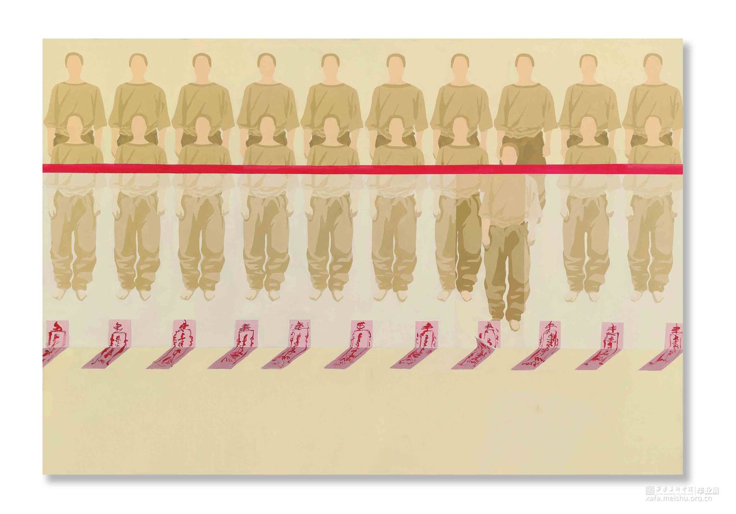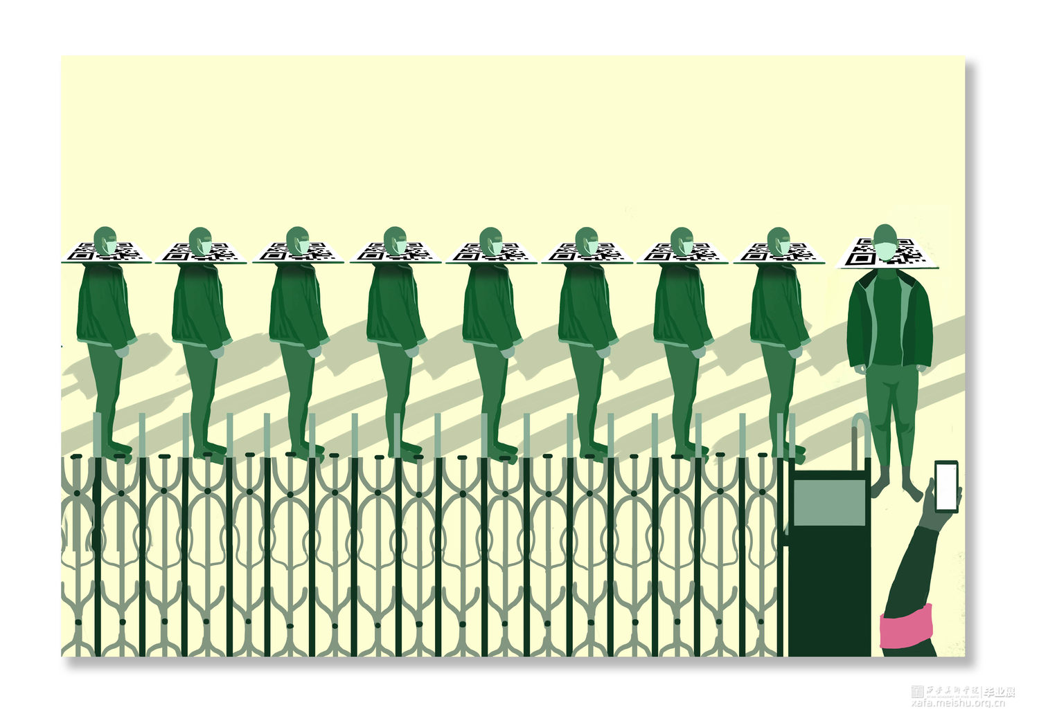 疫情的出现将人们囚禁在家中,整个社会看起来像一个大大的囚笼。每一个社区就像一所监狱,进出限制严格看守。我将每个人都格式化,重复复制排列,再加上纯色的背景,从画面上表达一种人人自危,无暇顾及其他的感觉。偶有一两个人或颜色或位置不一样,代表着群体中那些利己主义者。三幅画记录了疫情初期最令人印象深刻的三件事,护士出征,居家隔离,量体温。我还记被体温枪指着忐忑不安的感觉,护士们害怕的成了战士崩溃的奋斗在一线,外地人员隔离完整的封条成了他们自证清白的证明。画是我对疫情的记录,也是设身处地的感受,沉重,诡异,荒诞充斥