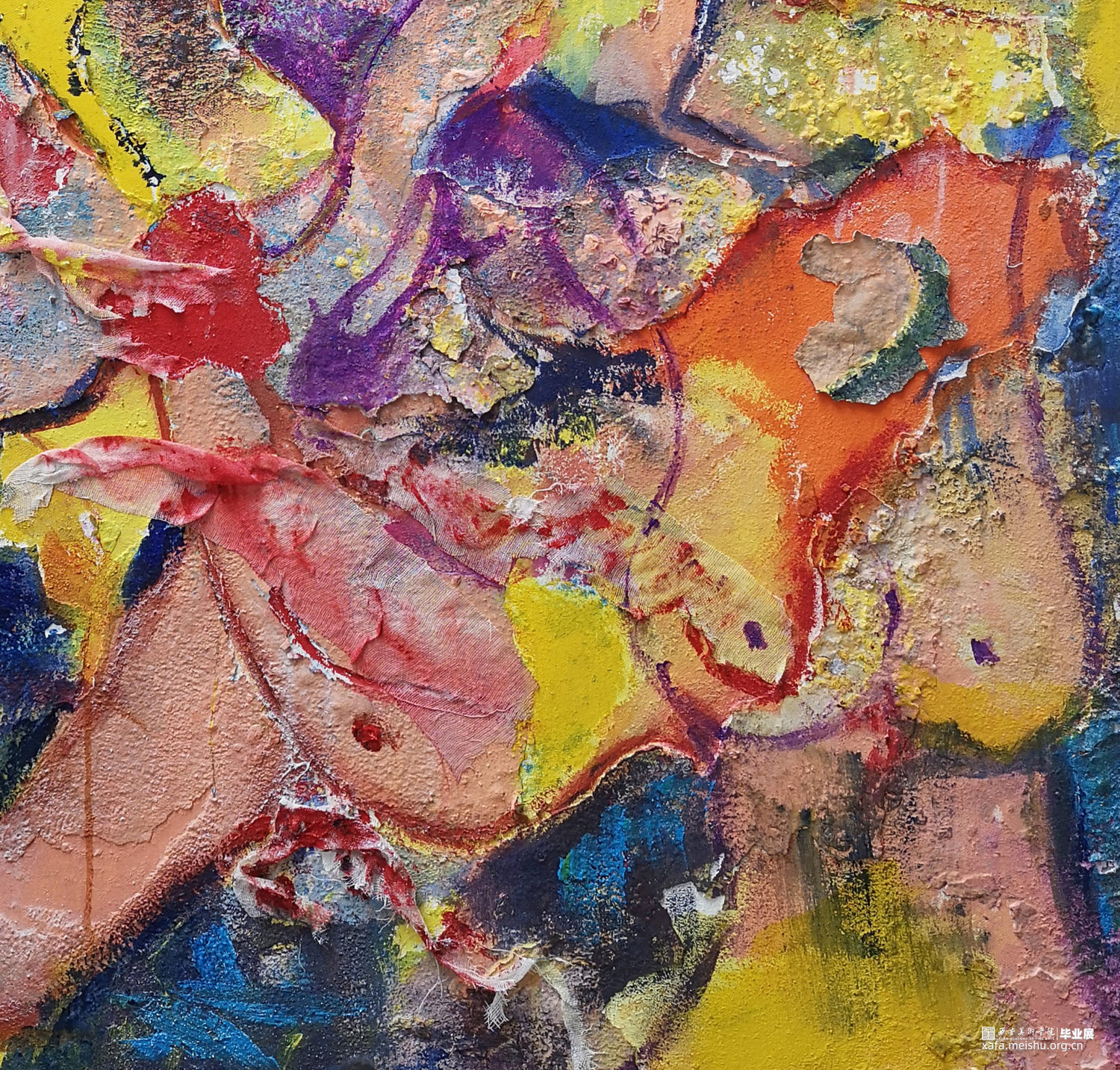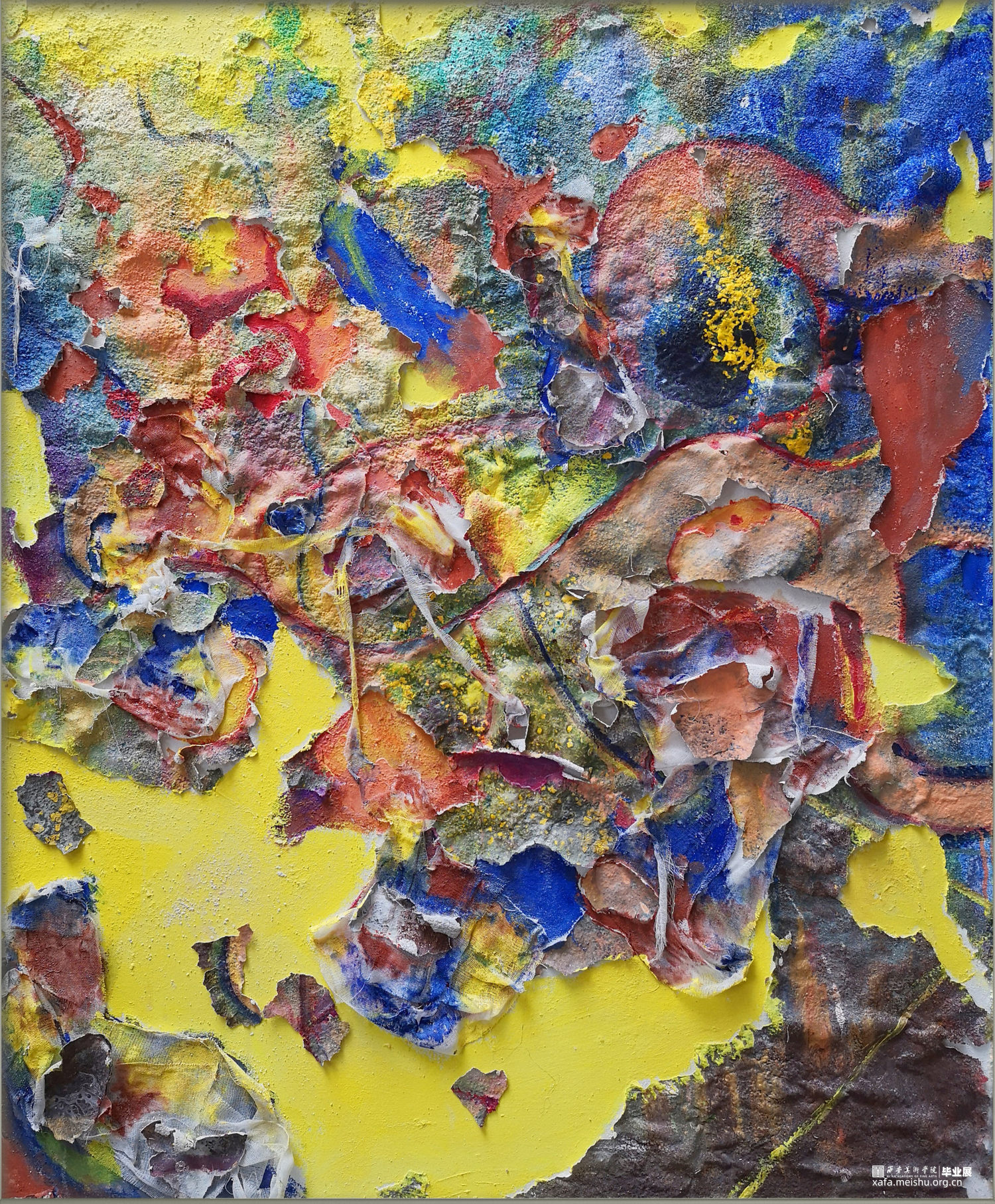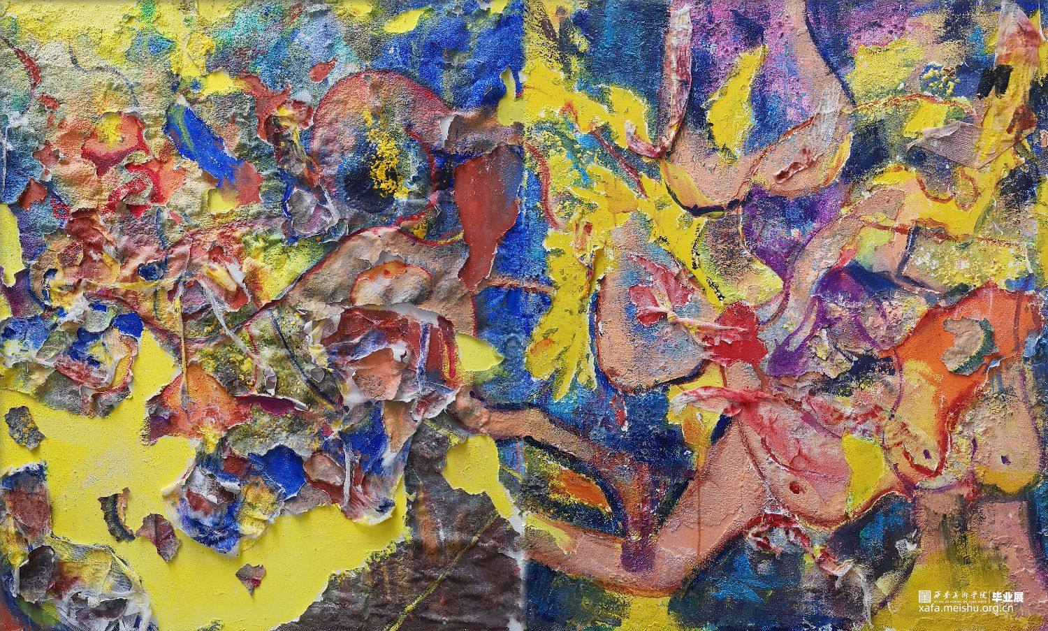《物化随机》使用石灰,丙烯树脂硅酸,白乳胶,沙子,丙烯颜料,硅油等混合而成。作品意在表达一个物化性质的画面与性的结合,画面中粗犷线条描绘的抽象概念裸体人形交缠与凹凸不平磨砂的底面,随着客观原因表面自然剥落和刻意挖空的参差跌起,与人体形态的交织。物化的因素融于形态,在我认为,人的自然野性本是与物质化的结合,随机化的物态变化也暗示了没有任何物质会是永恒,人的性欲和野性也是如此,随着时间的推移,任何事物与本性都会变化,无论是消失还是衍生亦或是改变曾经的常态。随机性的物质改变是生活的常态,过程中根据不同时期的感受不断的调整,顺其自然的由变化发展。