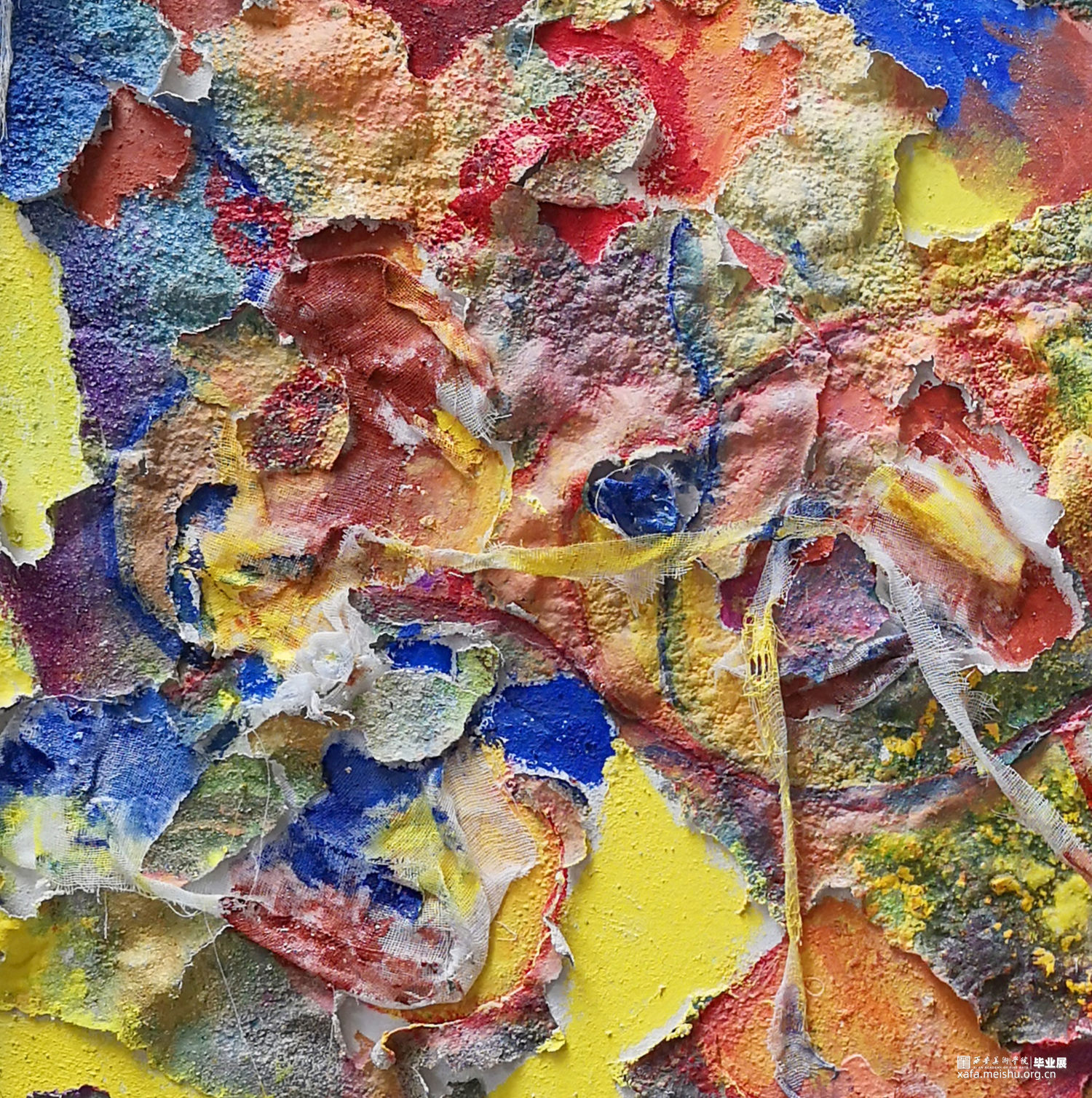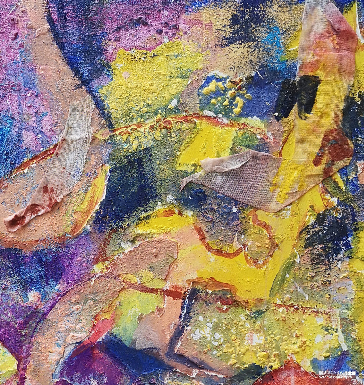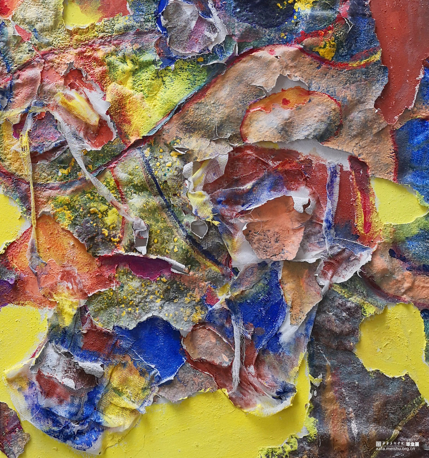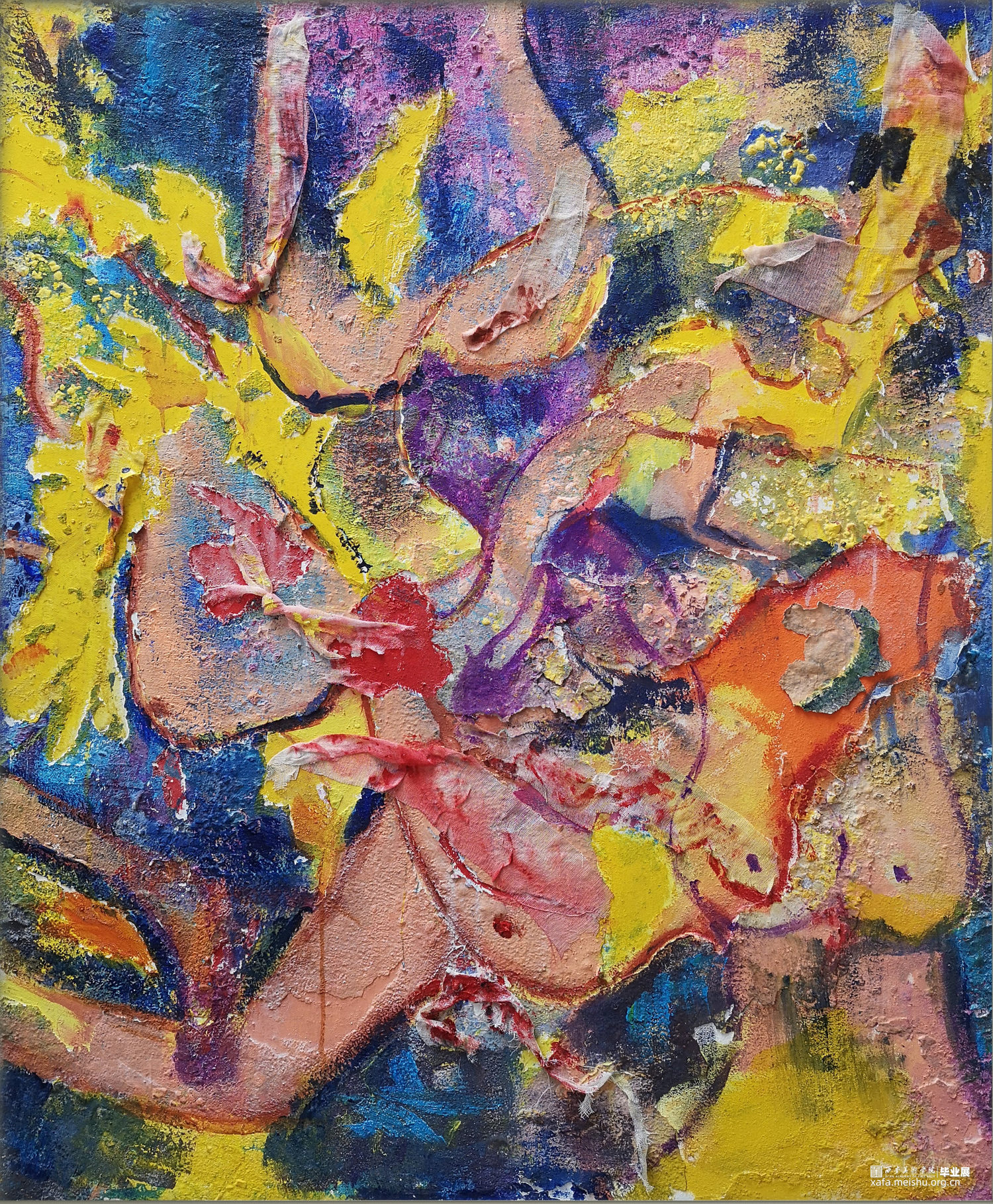 《物化随机》使用石灰,丙烯树脂硅酸,白乳胶,沙子,丙烯颜料,硅油等混合而成。作品意在表达一个物化性质的画面与性的结合,画面中粗犷线条描绘的抽象概念裸体人形交缠与凹凸不平磨砂的底面,随着客观原因表面自然剥落和刻意挖空的参差跌起,与人体形态的交织。物化的因素融于形态,在我认为,人的自然野性本是与物质化的结合,随机化的物态变化也暗示了没有任何物质会是永恒,人的性欲和野性也是如此,随着时间的推移,任何事物与本性都会变化,无论是消失还是衍生亦或是改变曾经的常态。随机性的物质改变是生活的常态,过程中根据不同时期的感受