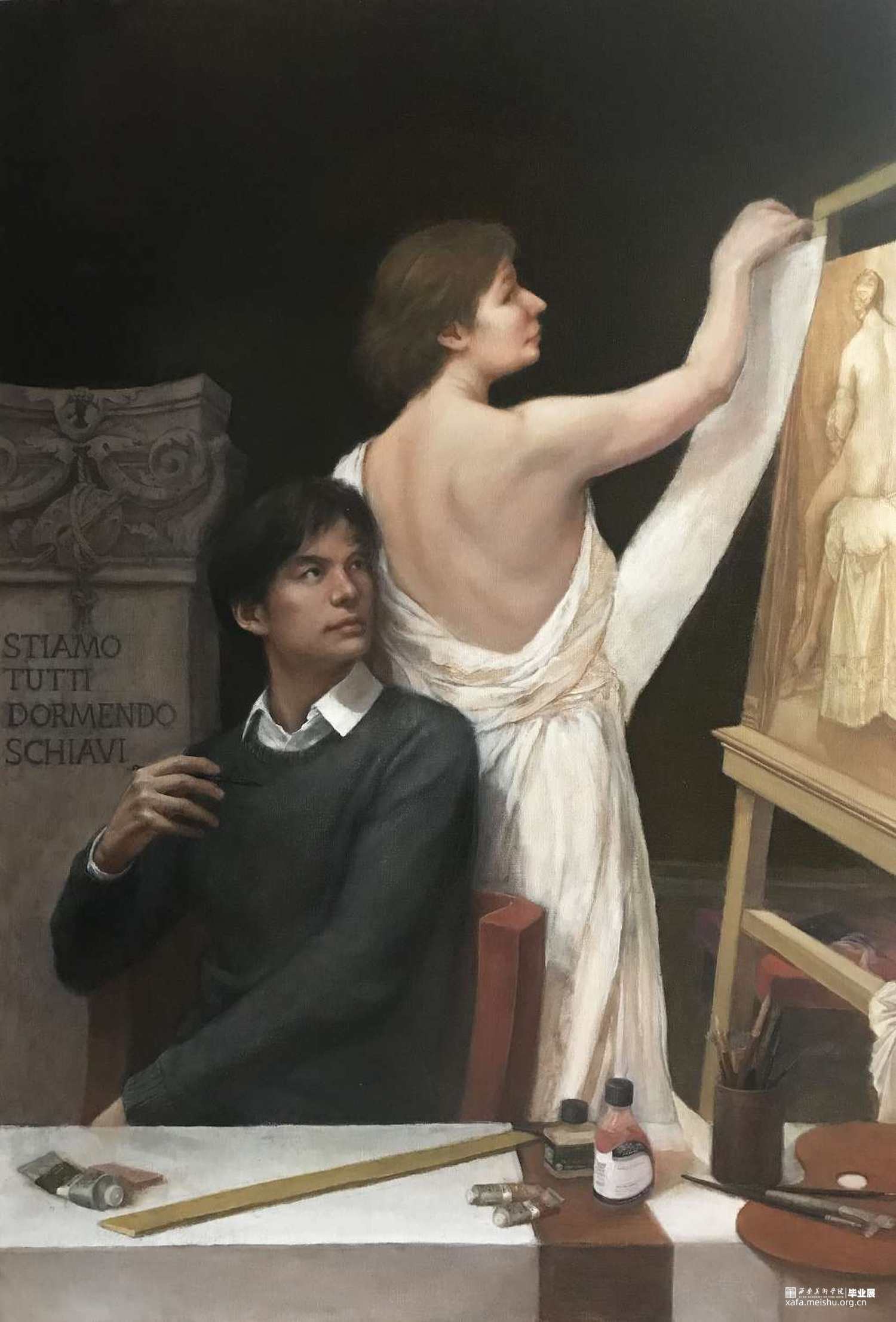 我的画作《画家与缪斯》的灵感源于一个梦,梦中自己与自己的画作交流探讨怎样才能画出满意的作品。画中画家“我”和象征着艺术的缪斯女神的互动,再现了梦境中我同自己的画交流的场面。通过两个人物的互动,将理想与现实矛盾的双方变得不再孤立。希望我有一天也可以创作出自己满意的作品。
