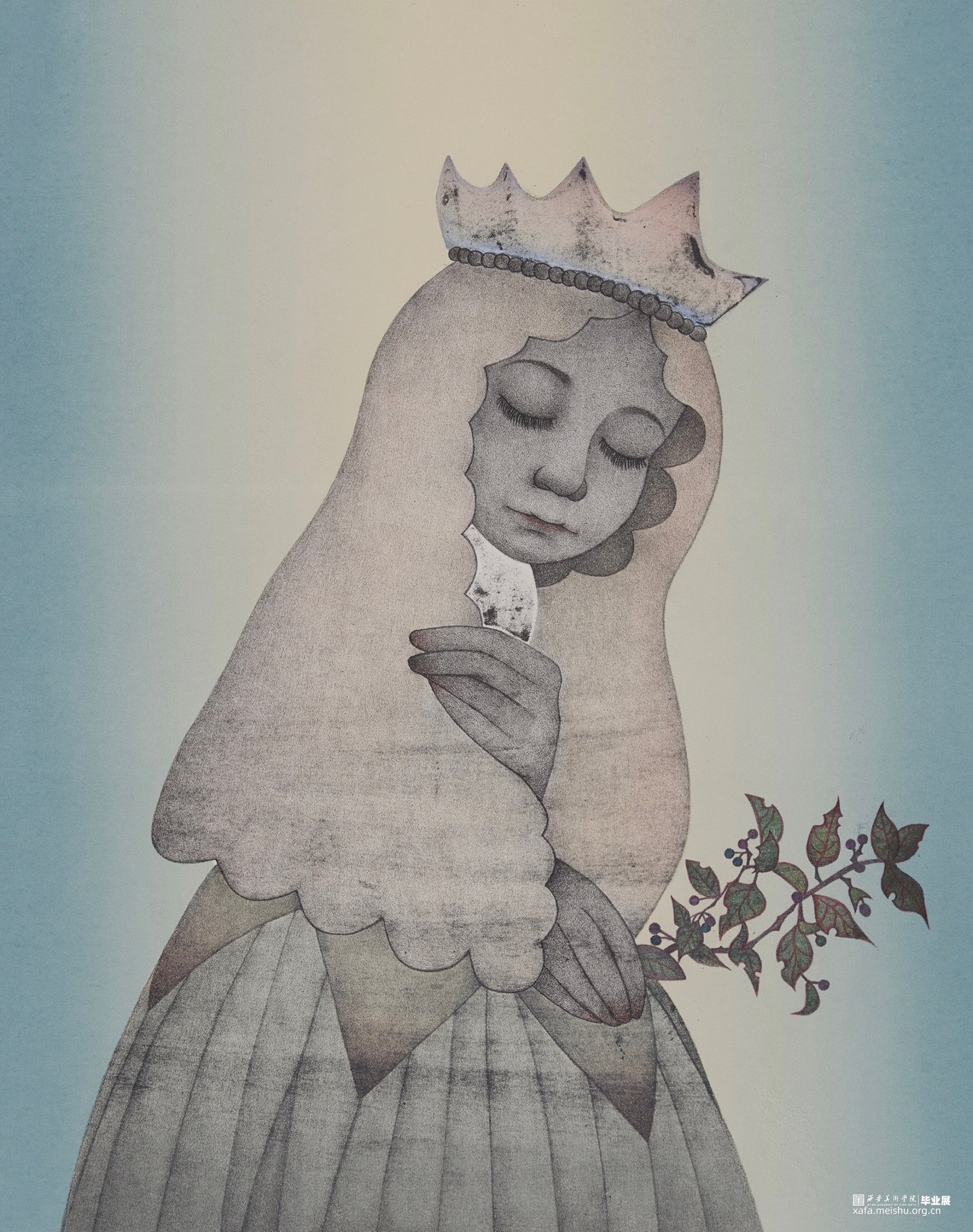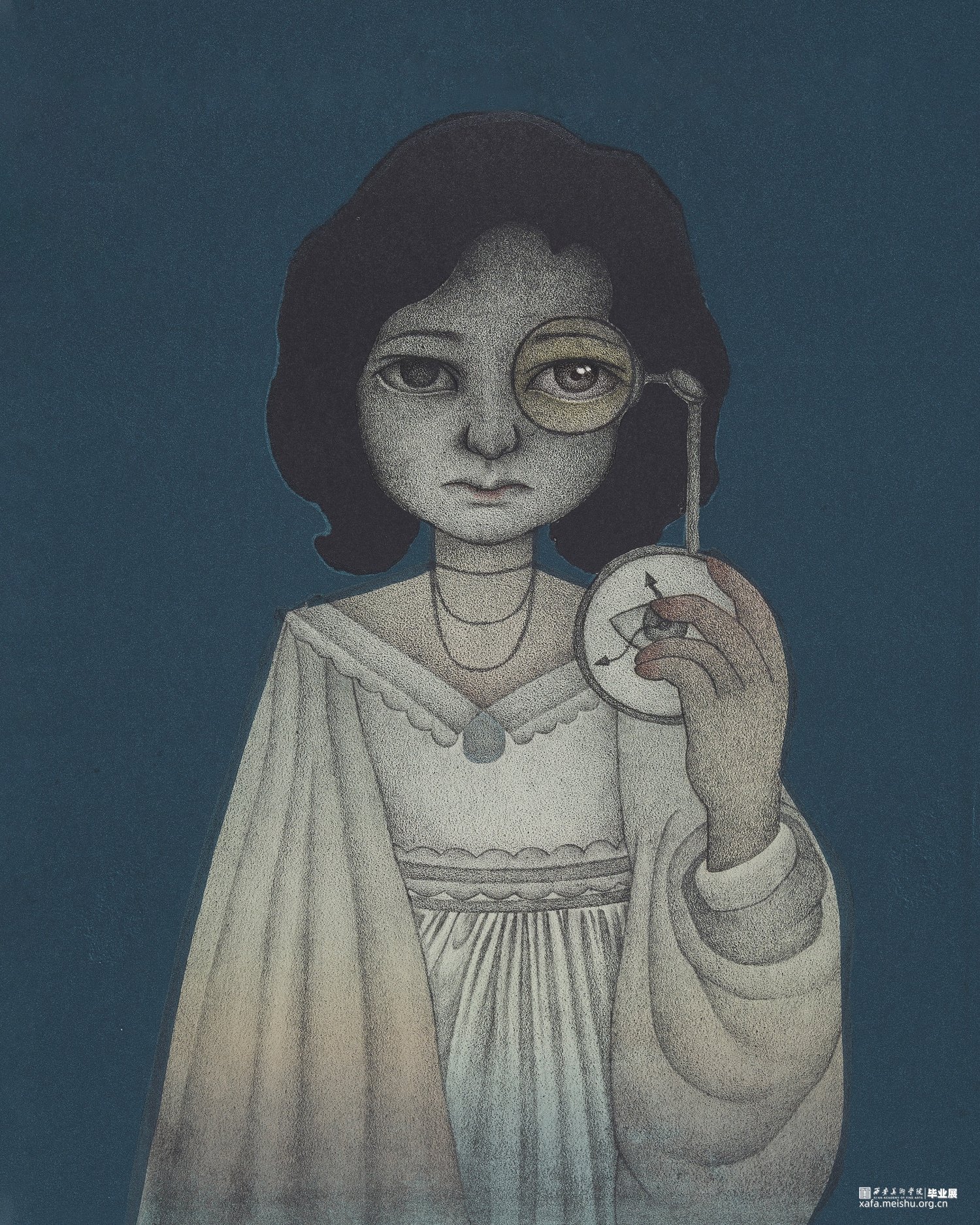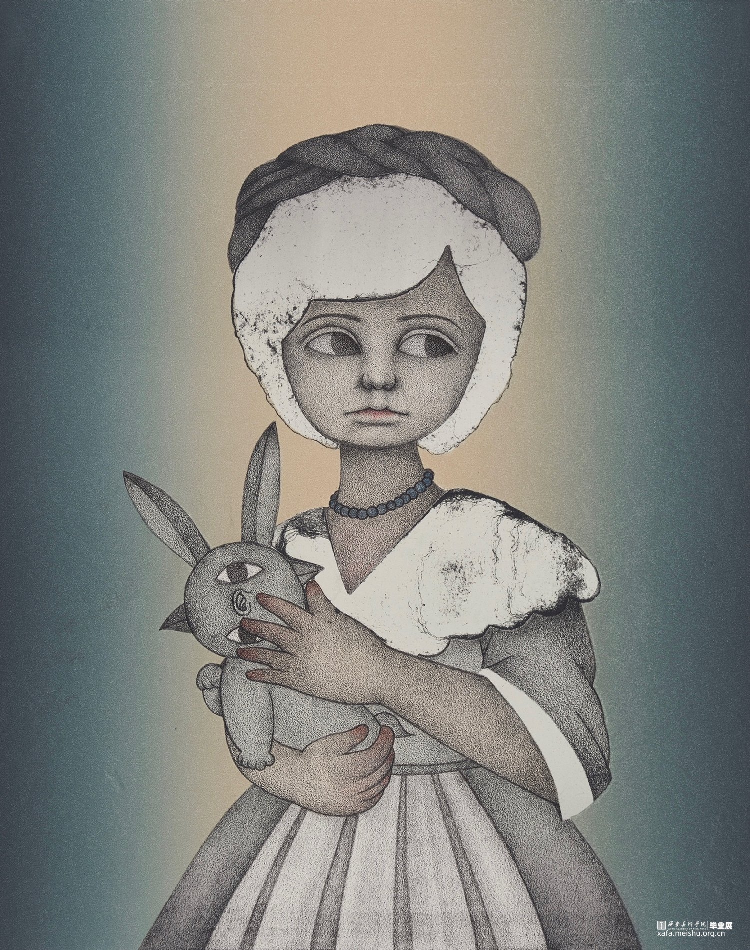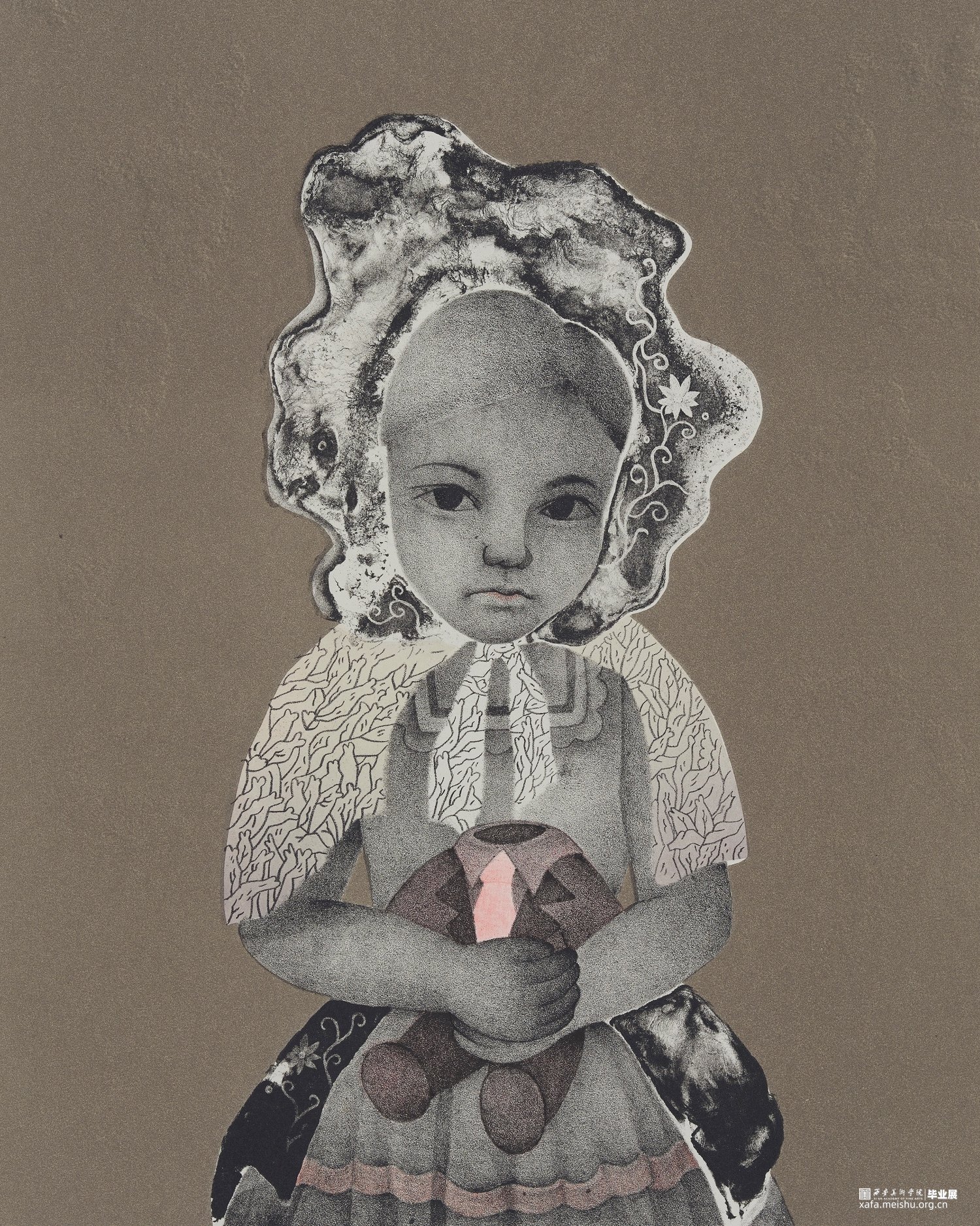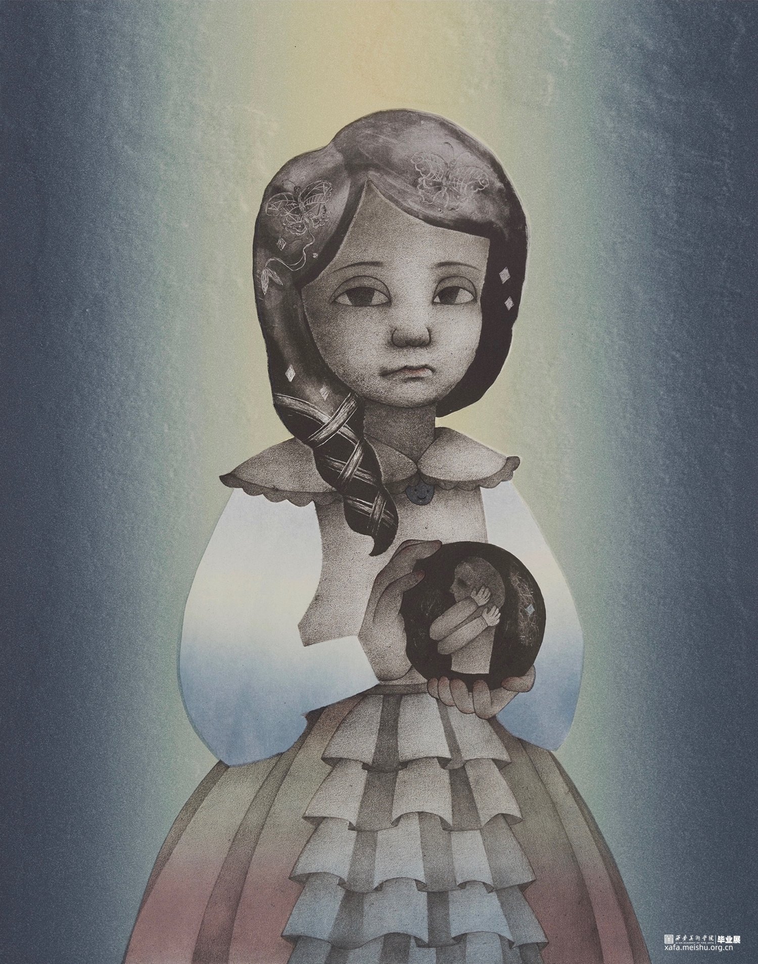 作品中我塑造的娃娃造型圆润,拥有夸张的大眼睛、精致面容、华丽服饰,我想尝试以平面化和独特的视觉符号,形成自己的人物艺术语言。画面中我用石版特有的肌理,塑造出不同的瓷娃娃的形象以及采用不同的肢体语言,强调了童年经历带来的创伤和后期形成的记忆以及原生家庭对孩子的种种影响,并将这些碎片拼凑出对过去、现在与未来的理解,提出如何带着创伤与自我和解的疑问。