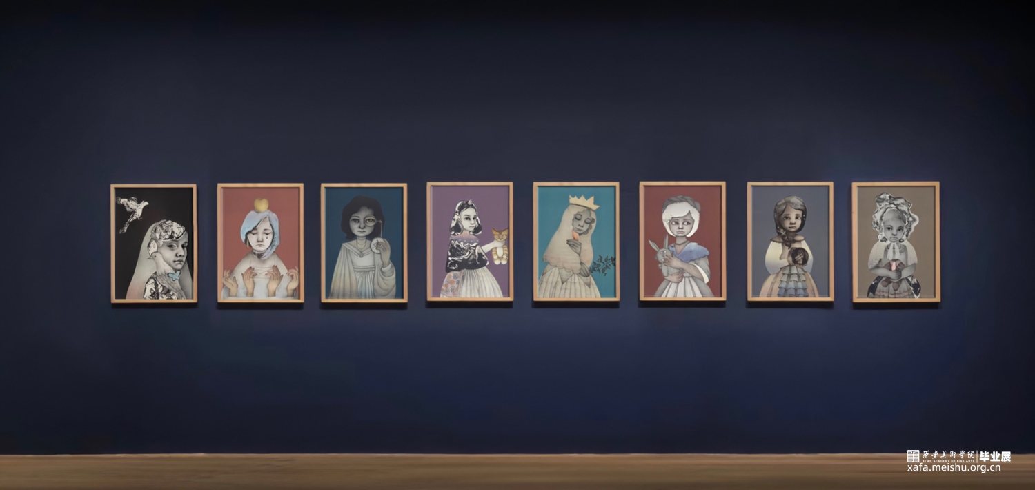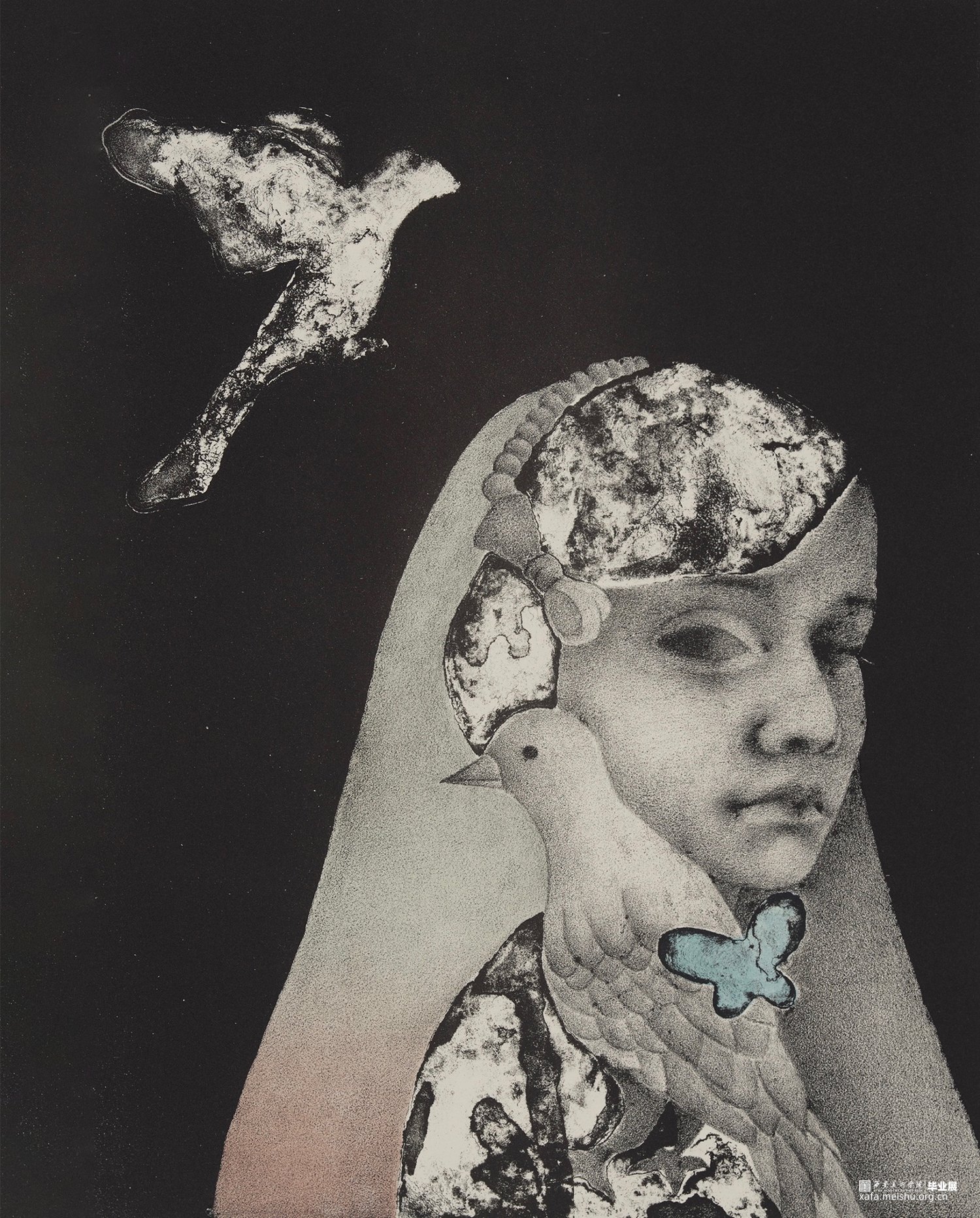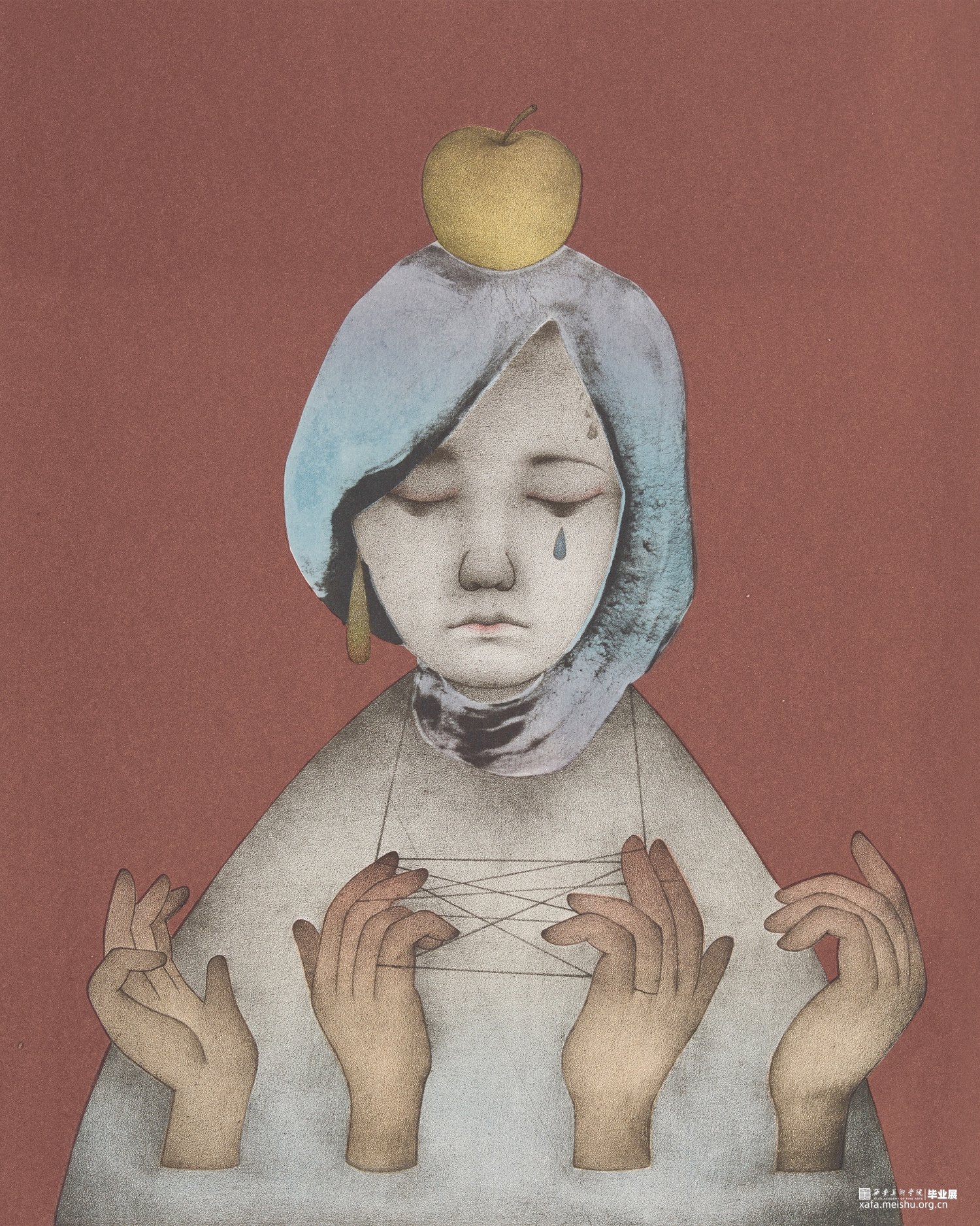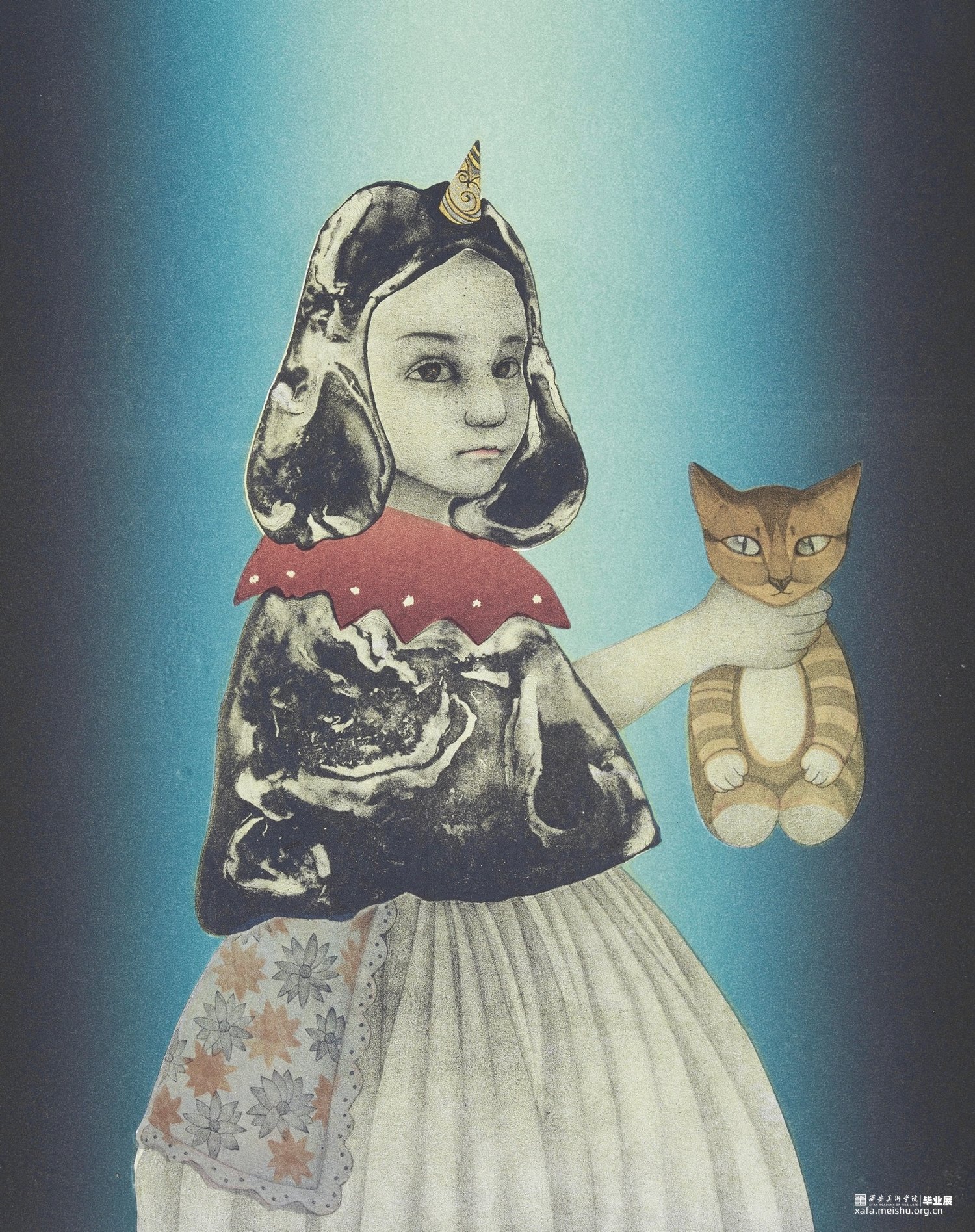 “瓷娃娃的记忆”这一系列以石版语言为媒介,通过调研分析产生联想,创造出不同的瓷娃娃形象与其他元素组成的一幅幅肖像。我想用卡通文化里虚幻的世界弥补人类情感的缺失,使人愿意与之亲近,给人一丝安慰与温暖,通过这些肖像来反映自己对童年和成长的认知与体悟,从心理主义层次表达童年记忆里经历的创伤通过潜意识带来的一种精神状态,或许他们想爱又不懂如何去爱、有希望但又迷茫、忙碌却又孤独寂寞,复杂的情绪令他们焦虑、痛苦,逐渐陷入幸福感在不断消失的