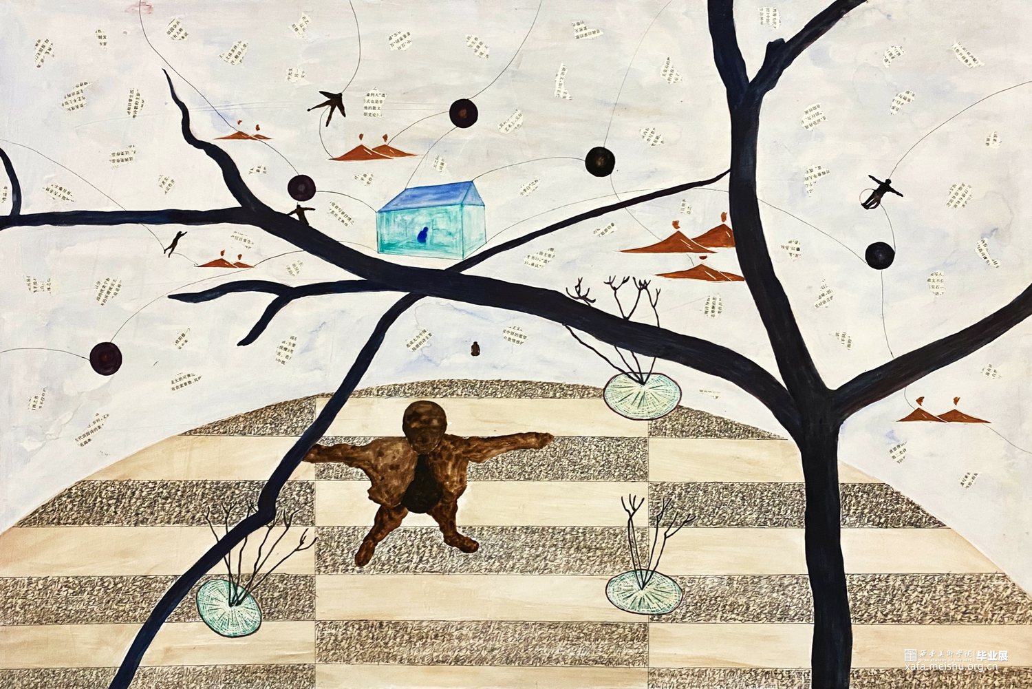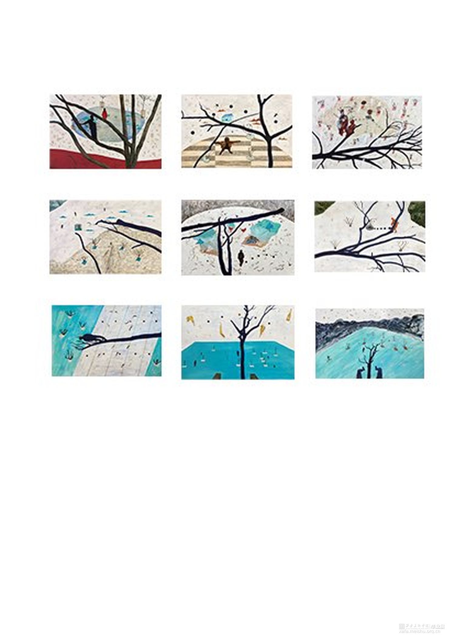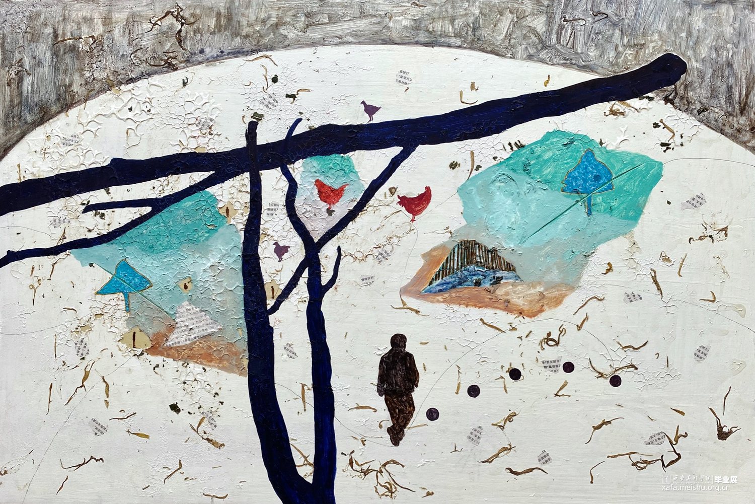 这个系列作品用了木板上综合材料的技法,有一些痕迹用木刻刀刻出来的,有一些是拼贴上去的,整个视觉语言还是偏向于版画语言的。“树”被选择用来作为画面中最为主要的视觉形象。作品围绕着物与物、物与人的关系进行探讨,每个物件之间都应该有其看不见的联系,制作绘画的流程是安排好的,但绘画的过程中画面是随机发展的,没有预设的,大脑的即时反应做出的判断,看似感性的过程却又是具有逻辑的,这个世界就像一张网一样把我们所有一切联系在一起。
