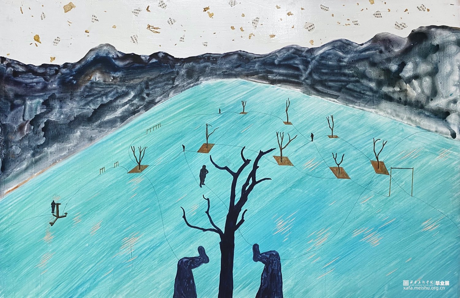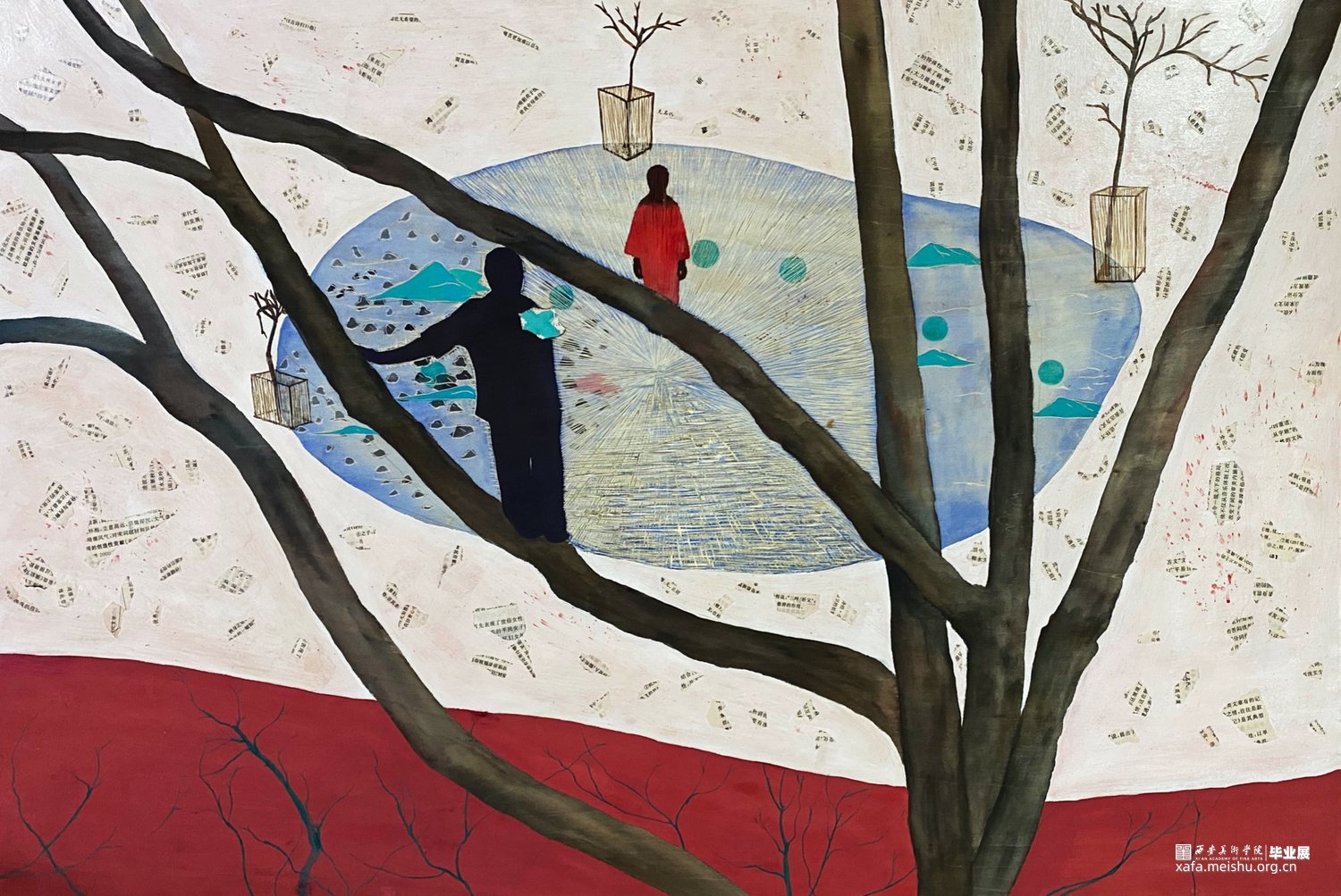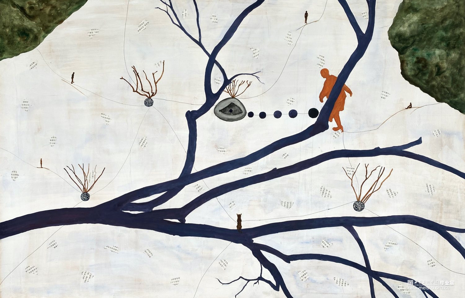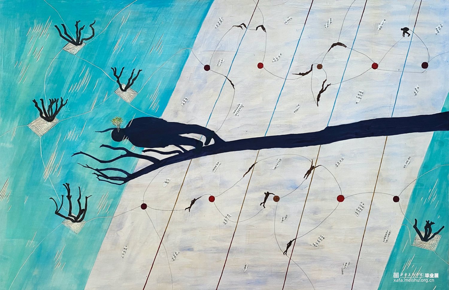 这个系列作品用了木板上综合材料的技法,有一些痕迹用木刻刀刻出来的,有一些是拼贴上去的,整个视觉语言还是偏向于版画语言的。“树”被选择用来作为画面中最为主要的视觉形象。作品围绕着物与物、物与人的关系进行探讨,每个物件之间都应该有其看不见的联系,制作绘画的流程是安排好的,但绘画的过程中画面是随机发展的,没有预设的,大脑的即时反应做出的判断,看似感性的过程却又是具有逻辑的,这个世界就像一张网一样把我们所有一切联系在一起。