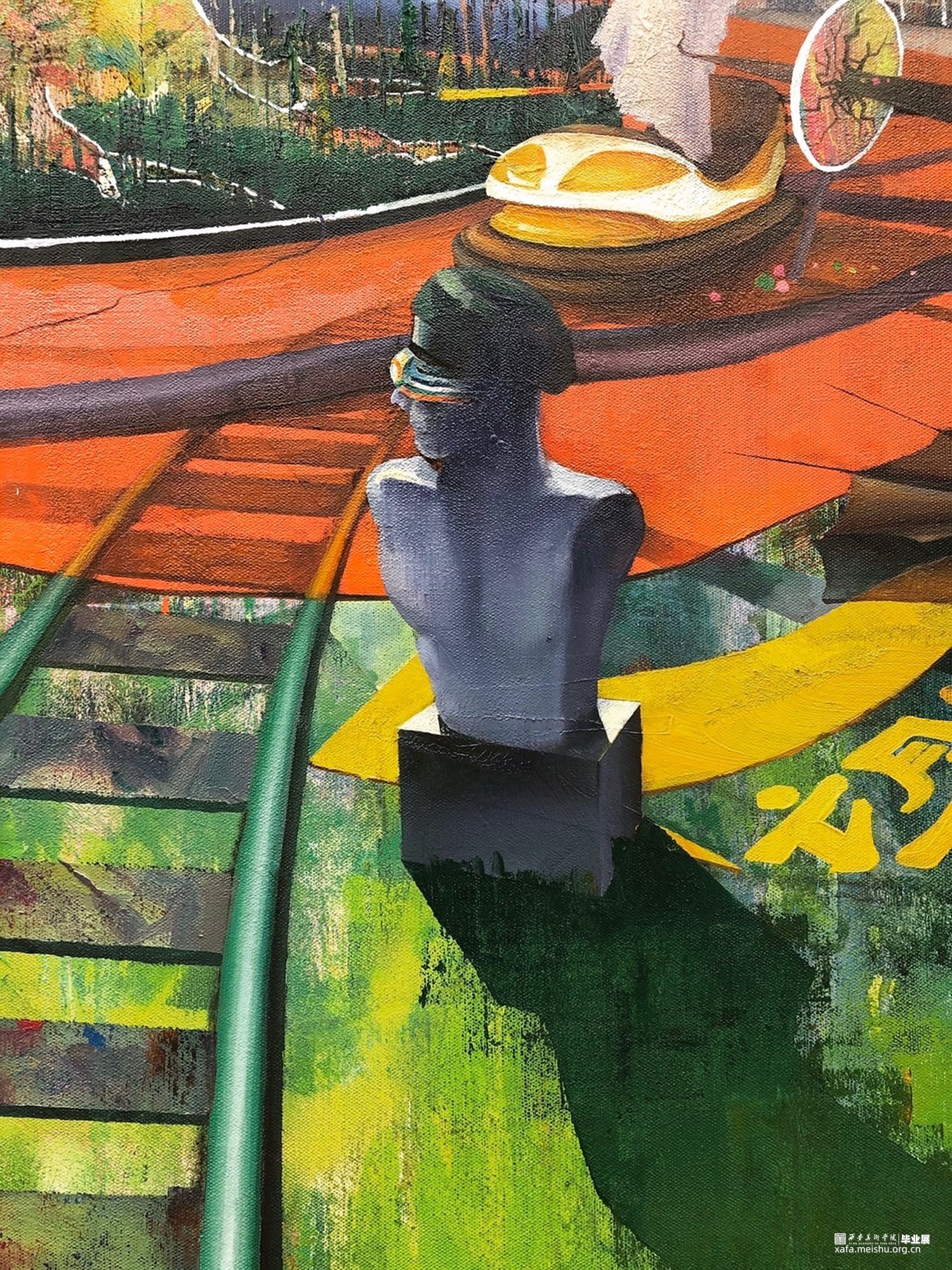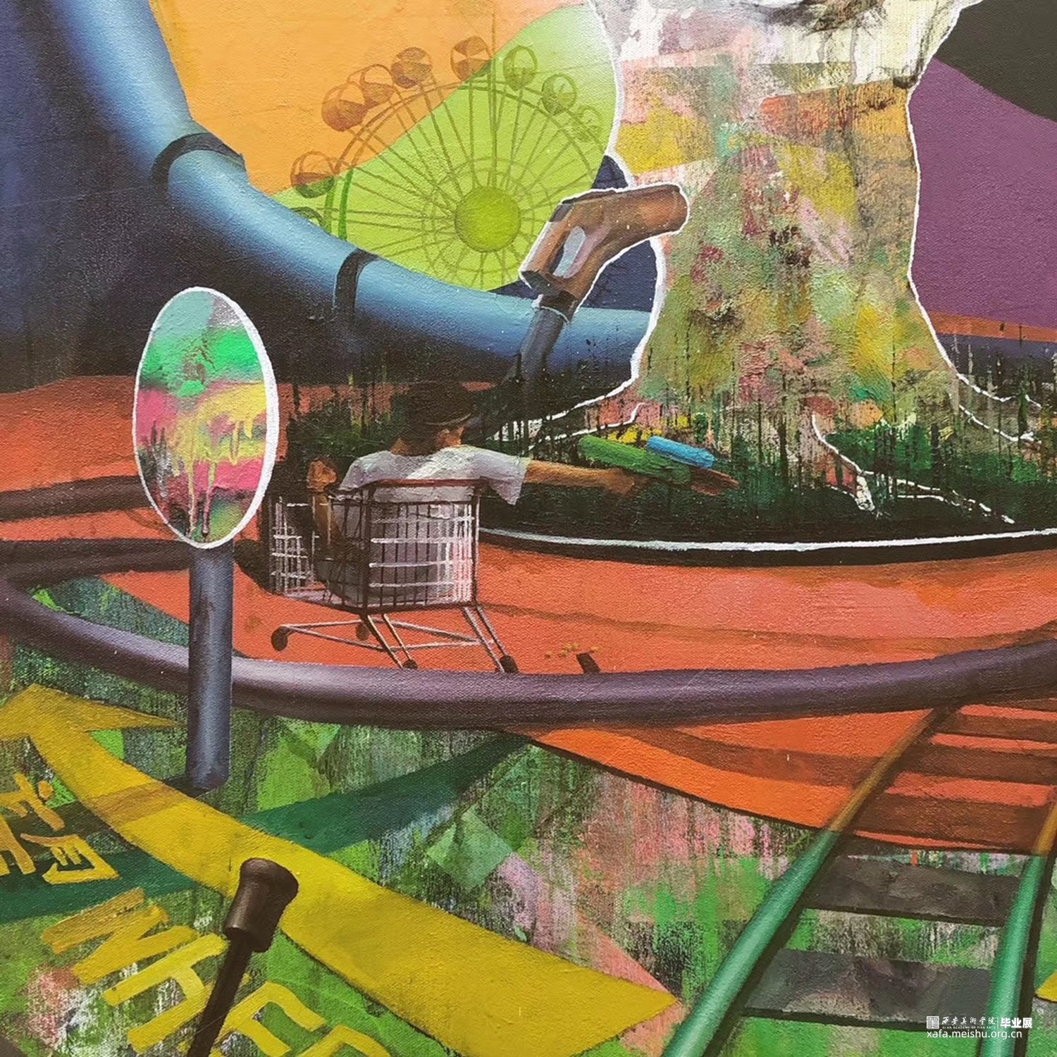 《Carousel series-WHERE》布面综合材料 Composite material on cloth 2019。通常对一个陌生城市的兴趣总比故乡西安来的更加汹涌,手机里面编辑了一个名称为“绕城笔记”的相册,都是些乱七八糟的照片通过Ps凑在一起的图,每翻起那些图的回忆更有带入感。海明一六年第一次去香港,因为考研复习我没去,听他的讲述和感受,觉得可以对香港的陌生感消解掉一些。因为展览、老友發哥我一七年第一次去香港,或许内陆人对海洋城市的天生好感,加上这座城悠久的多元化人群,错综的信息让我产生好感,当然我深知,这些好感仅仅停留在我的好奇心而已,因为这里有太多在西安看不到的东西。曾经和很多人聊起香港,我觉得这里更平静一些,走在中环大道上民对着街对面的“大军”我并没有觉得忙碌,反而是陌生的孤独感,那种孤独感来的很舒缓。在某种程度上,定义一个城市的节奏感,地铁站和马路上面的场景也许是一个表象,当借助这些媒介把我们送达彼岸后的状态,是否焦灼是否慌张于我们对常态的不确定性,也是个很重要的衡量方向,当然我的立场也只是为旁观者,倘若要长期待在这里,也会跑着走过皇后大道。我一向认为跳离自己的生活的惯性区域,能够清晰的审忆过往的支离,我觉得在这里我有这种感觉,因此这两年常来香港,找發哥,住在沙田围的山上。直到三月再来,印象里和海明、發發在茶餐厅吃饭,电视机里就有传来修例新闻,那会儿根本没把这个事情当做什么,没想到一过八个月,经历了这么多事情,当再来到这里,被安检的次数多了,其他似乎没什么太大变化,九记还是排那么长的队伍,唯一变得是旺角那家最爱的自助餐厅价格低了很多,生意不好。但日后的经历和电视讯息让自己触目,这些从未看到过的场景,产生了生理反应,从未有过的求生欲在看到那一刻都爆发出来了,最后灰头土脸的回到發發的家里,突然想起来第一次来香港,罗湖出关被港铁因为在地铁内逗留时间过久罚款的事情,这些足以摧毁关于你所有前面的好感,因为你会发现这些事情的根源都源于你的无意和对方自觉的冲突,那一刻开始,就像被人提醒自己是外地人一样,那种不适感原来是被这样的方式提醒,换一句话理解就是,我未曾想到的那些平静与美好,却最终也反击了自己。这幅画Shot to HongKong ,希望这艘船别太快的消失。
