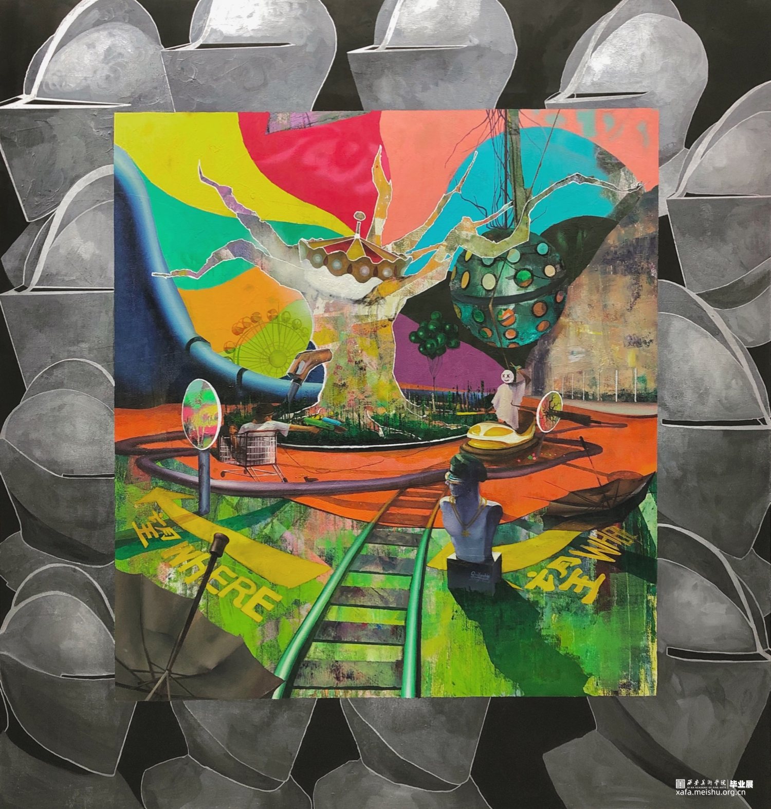 《Carousel series-WHERE》布面综合材料 Composite material on cloth 2019。通常对一个陌生城市的兴趣总比故乡西安来的更加汹涌,手机里面编辑了一个名称为“绕城笔记”的相册,都是些乱七八糟的照片通过Ps凑在一起的图,每翻起那些图的回忆更有带入感。海明一六年第一次去香港,因为考研复习我没去,听他的讲述和感受,觉得可以对香港的陌生感消解掉一些。因为展览、老友發哥我一七年第一次去香港,或许内陆人对海洋城市的天生好感,加上这座城悠久的多元化人群,错综的信息让我产生好感