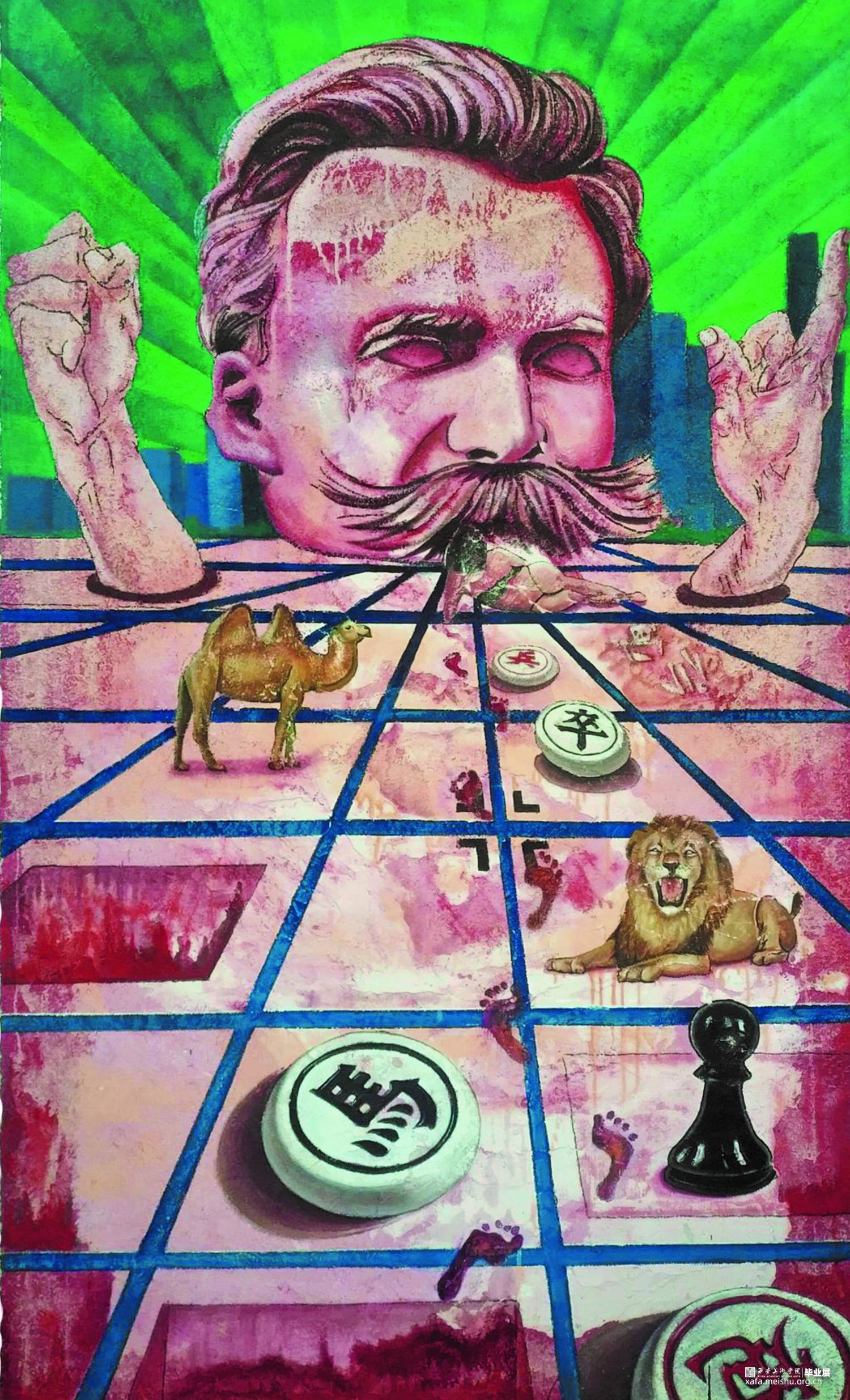 此系列组画以德国哲学家尼采的作品《查拉图斯特拉如是说》中的故事为依托,描绘了笔者对于尼采思想的理解与想象,并以寓意、象征的转述方式传达了作者对于书中以生命和人的意志为准则的价值体系的提倡以及作者对于自身境遇的热烈思考和探索。