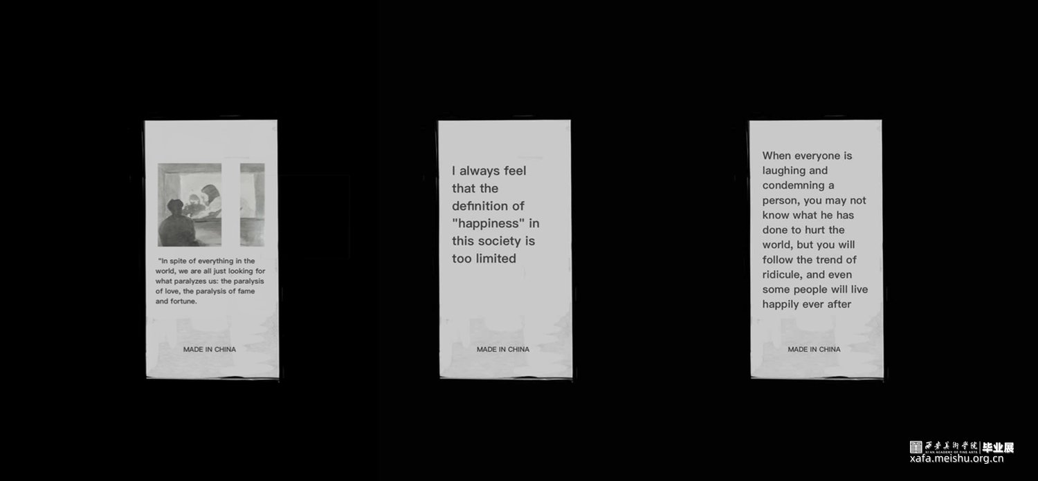 集体无意识现象从古至今停留在人类的生活的多个层面。而随时代进步,人们更需要思考自己,因此我将服饰标签和种种集体无意识现象结合,时刻提醒着观者,防止他们不小心就陷入大众化的错误思考方式,更不要带着滤镜去评价一切。文化是根植于内心的修养,是为别人着想的善良。