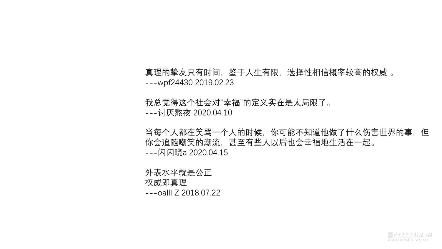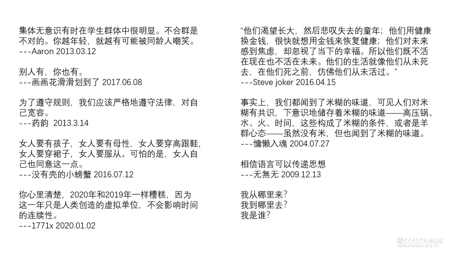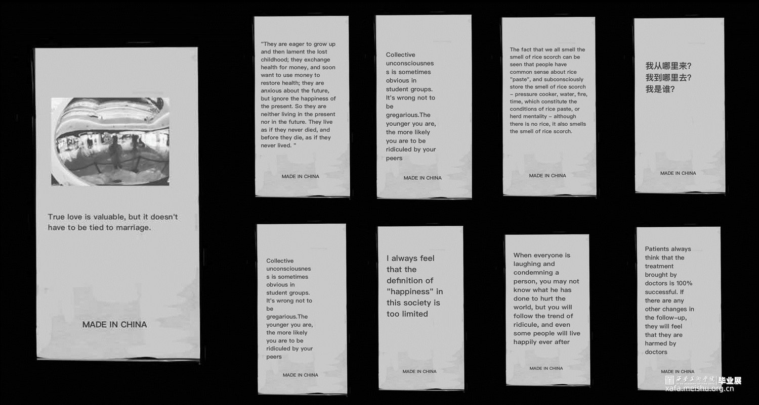 创作中创新点是使用服饰标签作为艺术载体,用集体无意识相关现象、网络语言去丰富标签的内容,最终以当代的艺术表现手法呈现。这些内容可以分为两个方面:第一个方面是描绘当代一些集体无意识现象;第二个方面是述说一些引起人们思考的话语。因此我在创作中通过网络以及书本收集了大量的相关资料,将其转化为标签上的内容。并标明出标签内容的来源以及时间。