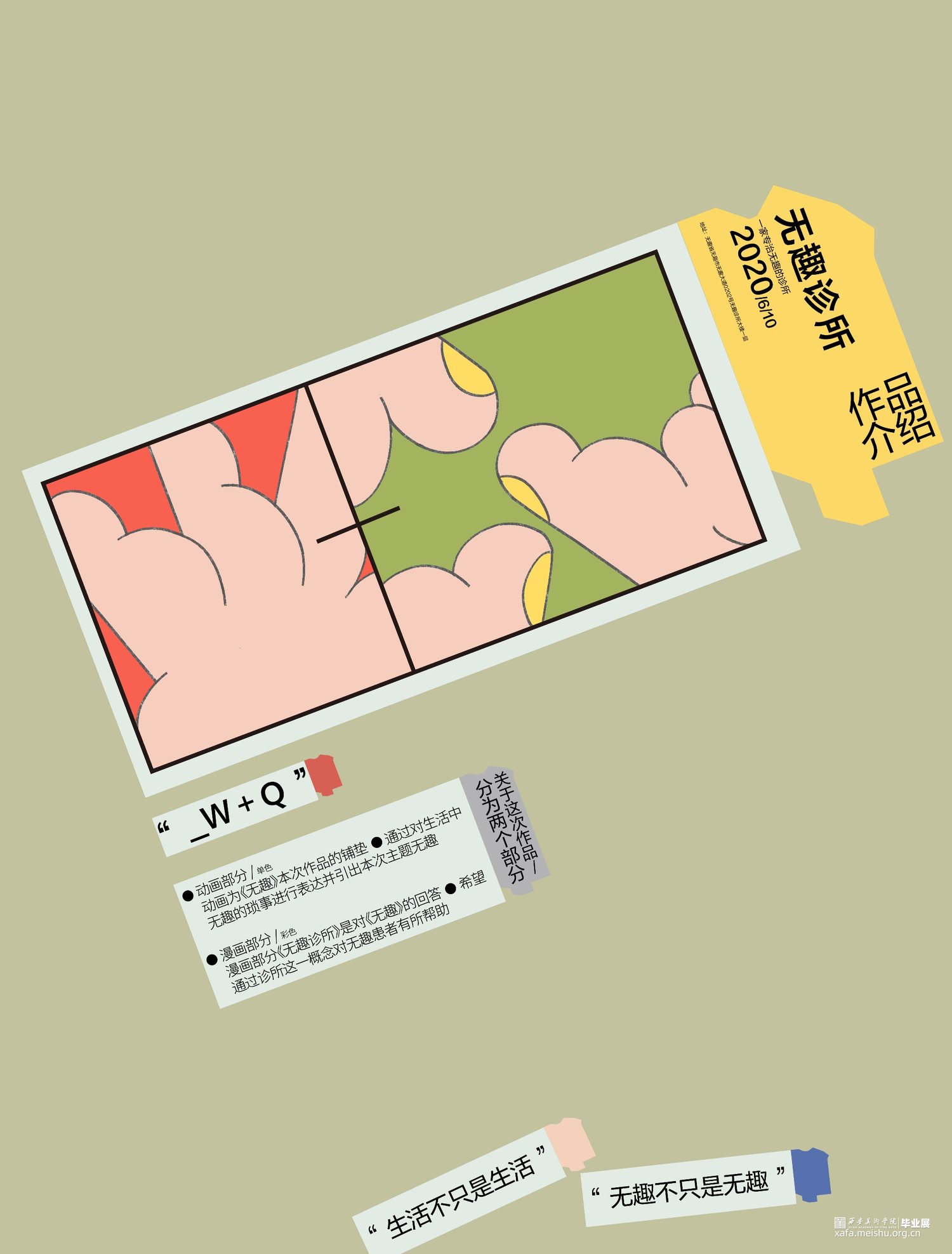 生活中我们每天都经历着相同的事物,比如每天早上都要洗脸刷牙吃饭等。久而久之,我们会厌烦这些机械般的生活,无趣诊所的建立就是帮助你试着换一种角度重新看待生活,试着去享受这些无趣,作品通过叙事的漫画的形式将生活中一些容易忽略的事件串联起来,并通过结合诊所的方式,来帮助治疗一些无趣患者,并试着去寻找那些曾经忽略的“趣”,也许你会发现无趣不只是无趣,生活不只是生活。