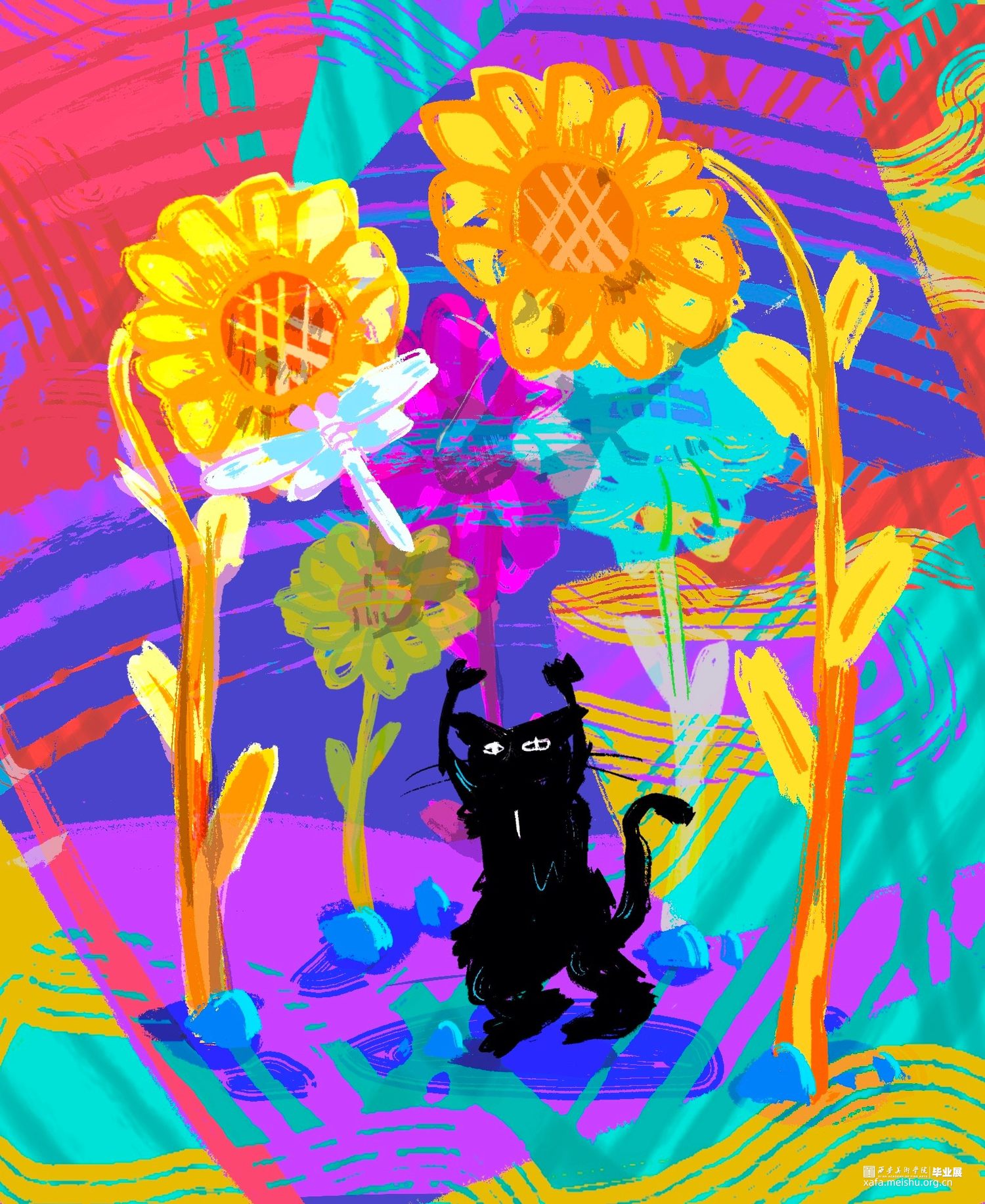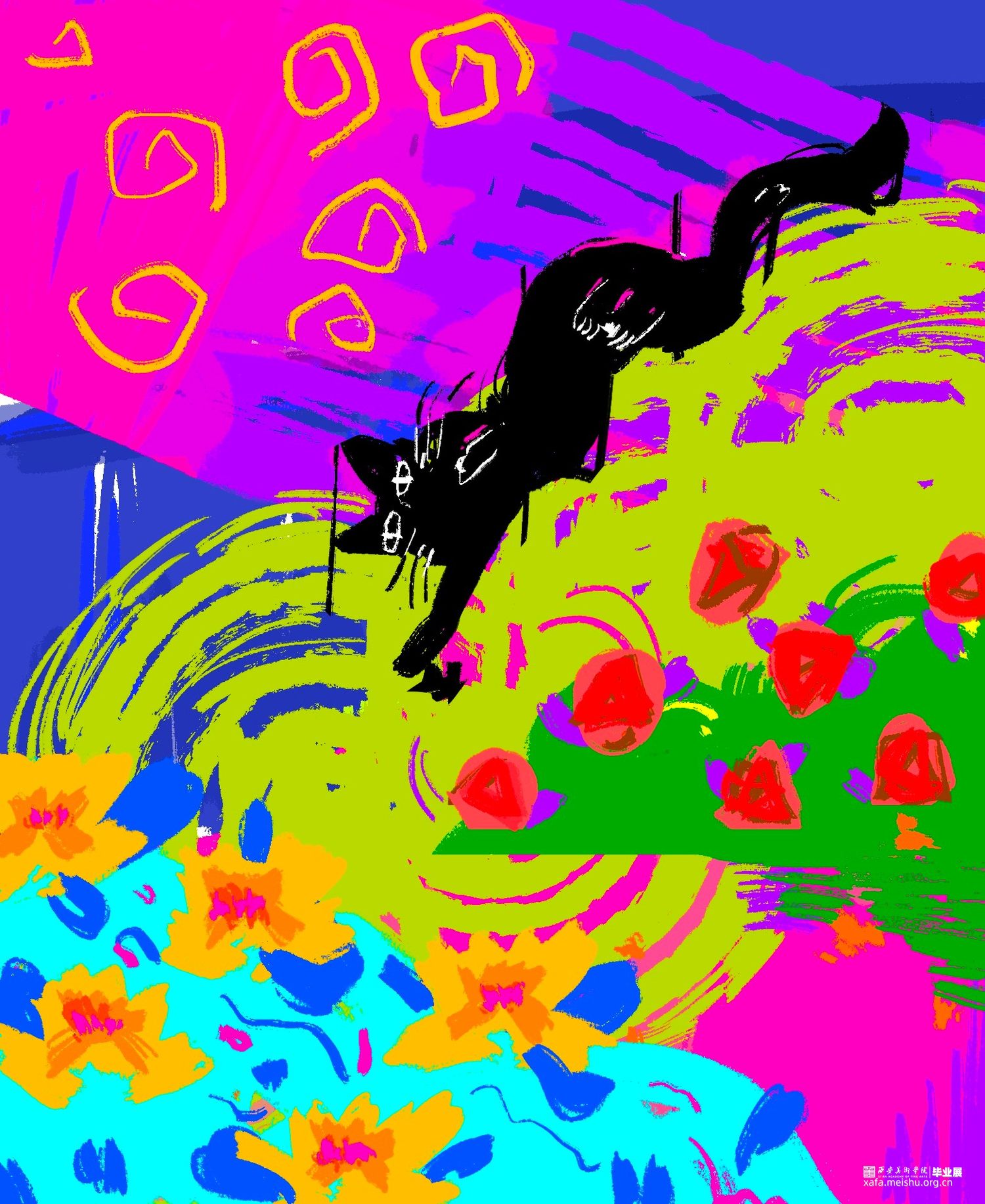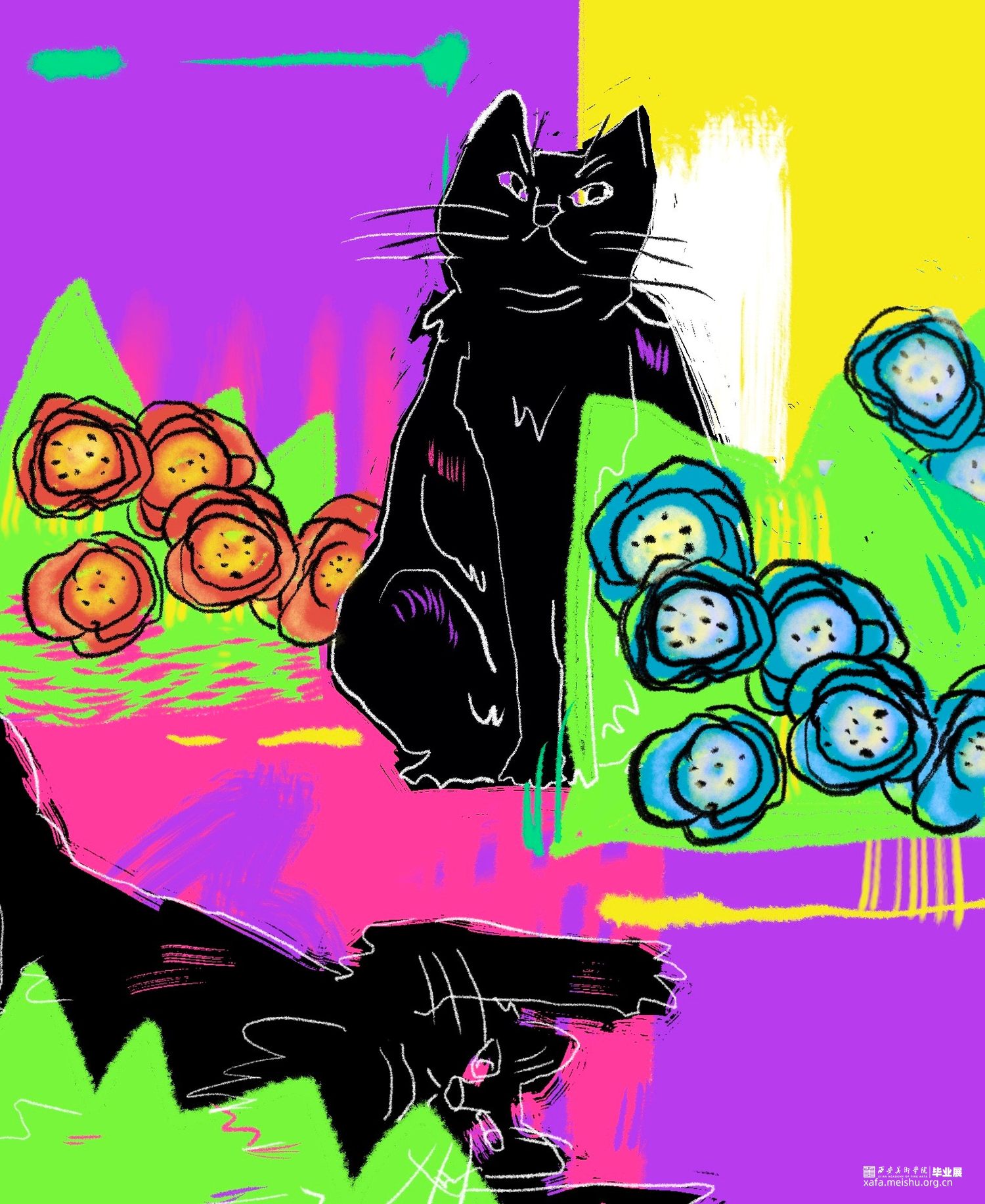 狄丝梦露是一只黑猫,我赋予它人的行为习惯以及情感要素。通过插画表达动物与自然之间相互依存的情感。于是便记录下脑海中的猫咪花园,与猫咪一同感受喜怒哀乐。