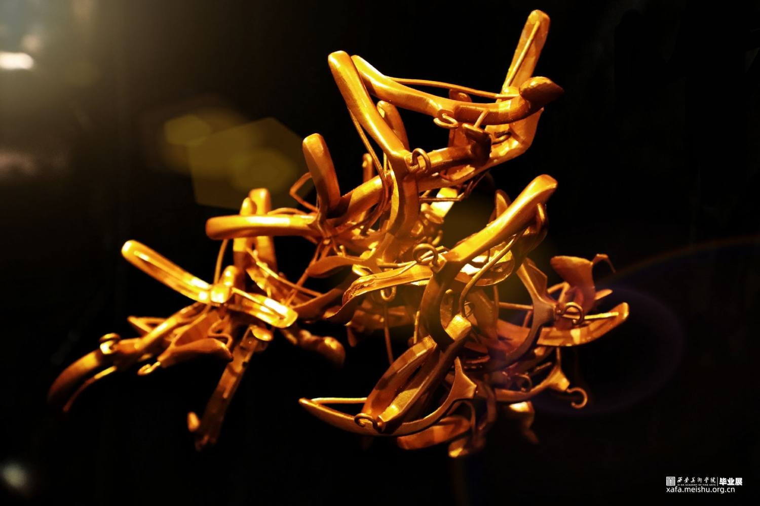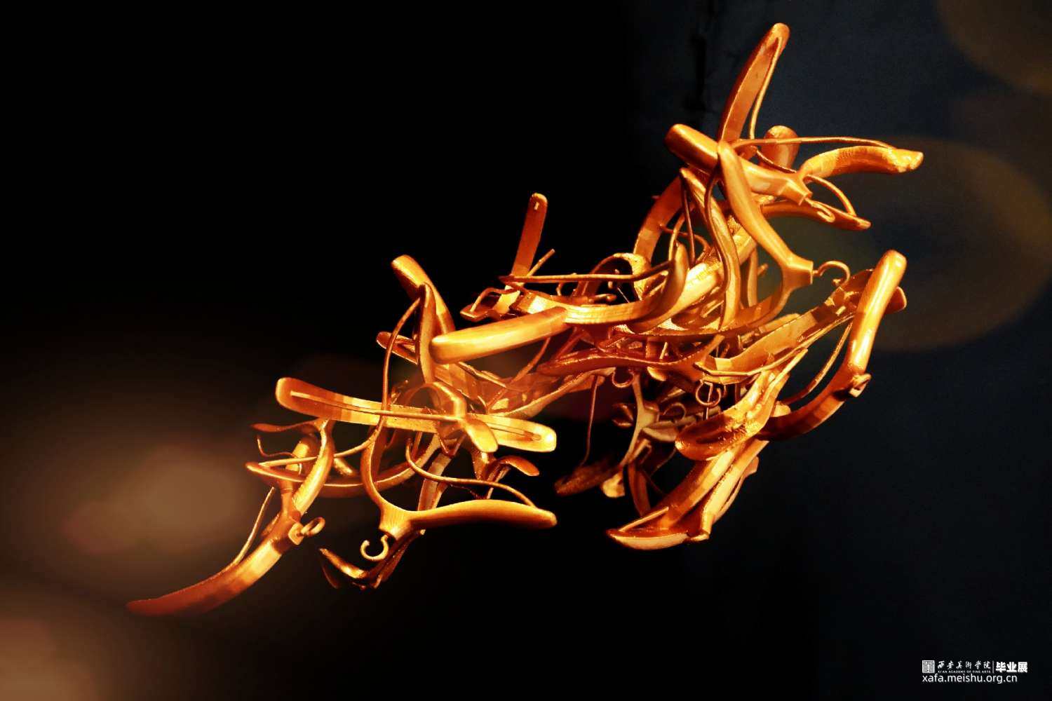 敲定草图方案之后,进入了建模阶段,我用了玻璃和电镀金属的效果相对比,用不同的展现式去制作衣架模型,最终因为玻璃易碎,制作难以成型,实际效果达不到建模效果以及运输易损的关系,而采用了电镀效果。因为电镀效果不但视觉效果能给人一种视觉上的冲击,而且易于保存,不容易在运输的过程中损坏。电镀金属的效果给人以一种明亮透彻的感觉,尤其是亮面金属,加上扭曲的衣架效果,能够让观众感受到庄严的金色光芒下有着不同寻常的故事,而我的作品也正是希望能够给大家传递一个这样的感受。