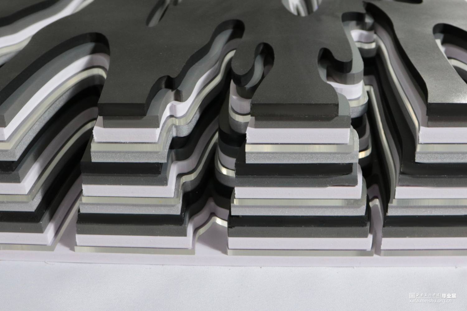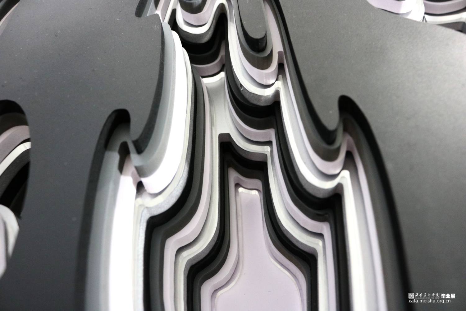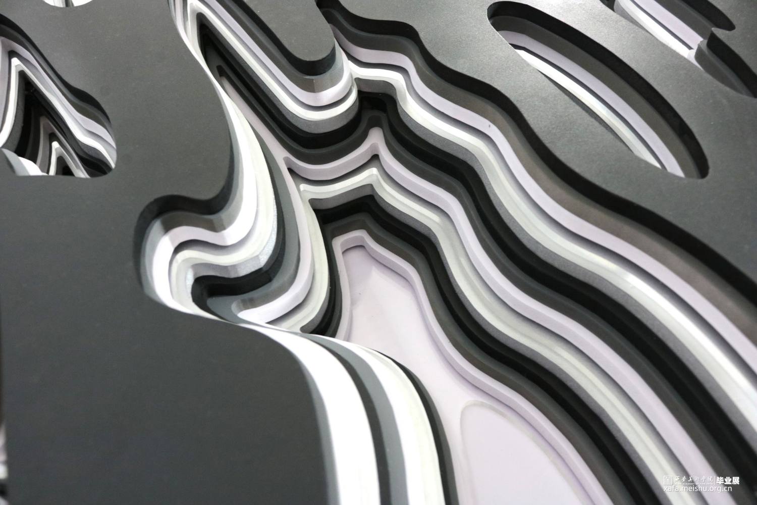 我首先以海洋保护为初心,以一瞬间消逝海波纹的局部图为灵感,将其变得抽象和概念化,选用塑料化学制的材料,比如pvc和亚克力等,每一层都做出镂空的形态,创作出有立体层次的综合雕塑,设计上结合产生破坏感的抽象形态,以及昏暗的灰色调带来的情感影响,表现出我心中想象的未来污染下的海洋局部,探究人类与海洋之间不稳定的未来。
